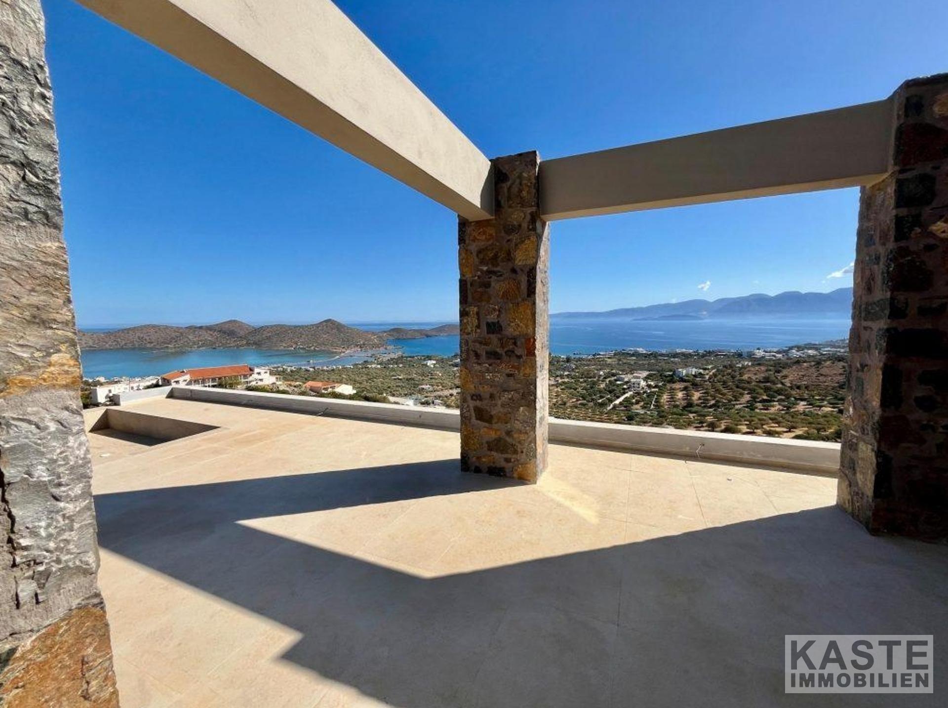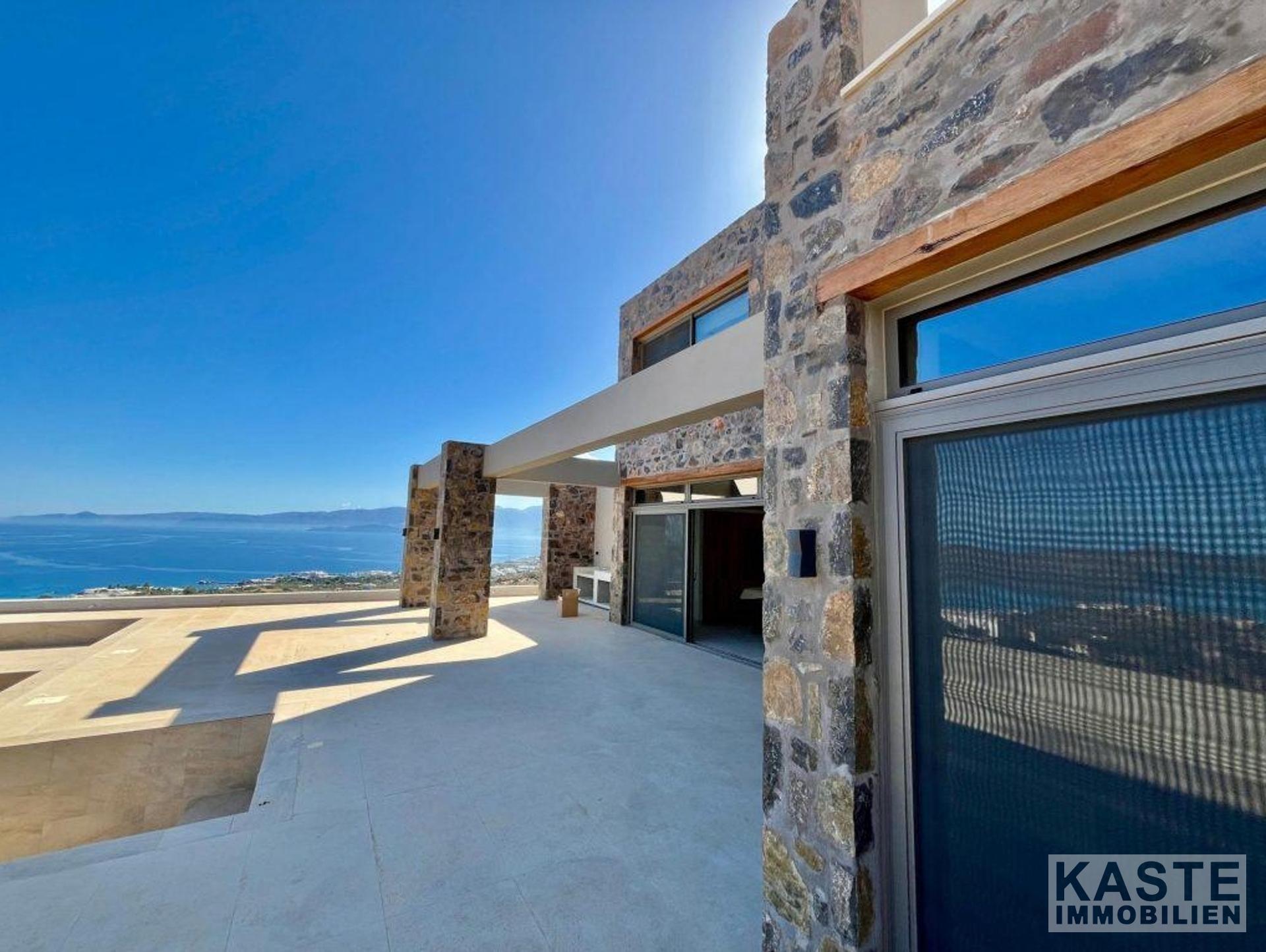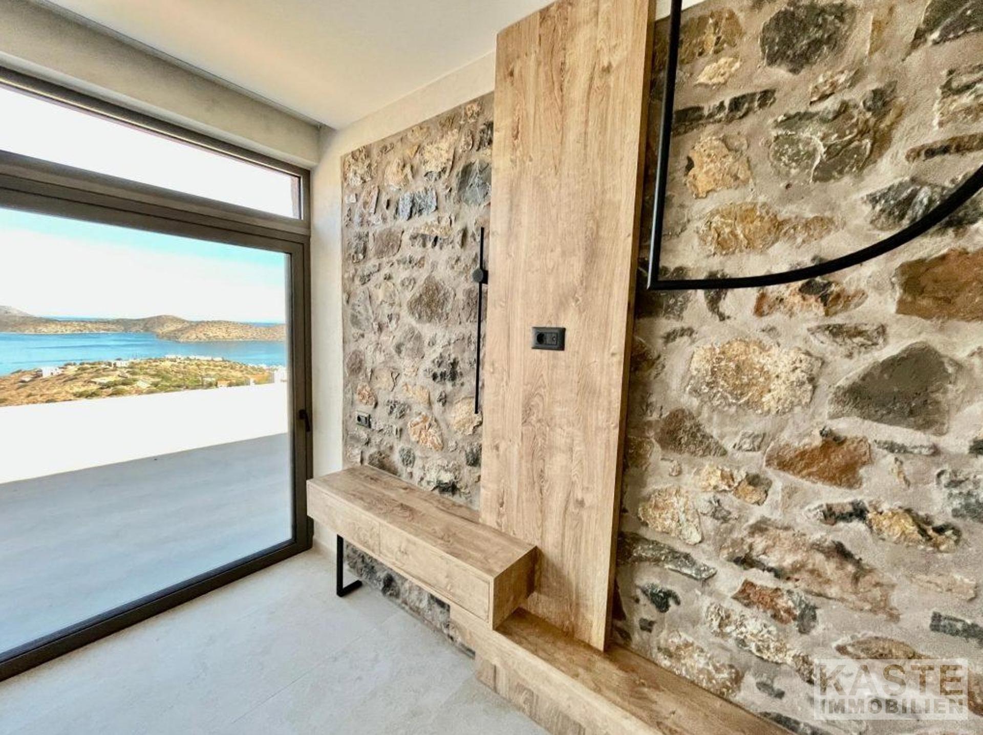 Das Erdgeschoss empfängt Sie mit einem offenen und lichtdurchfluteten Wohn- und Küchenbereich, der zum Entspannen und Verweilen einlädt. Dank der großen Glastüren eröffnet sich vom Wohnbereich und dem angrenzenden Schlafzimmer mit eigenem Duschbad ein direkter Zugang zu den weiten Terrassen mit atemberaubendem Blick auf die Bucht von Elounda und die glitzernde Ägäis. Der lichtdurchflutete loungeartige Bereich eignet sich hervorragend für gesellige Abende oder ruhige Stunden mit der Familie.