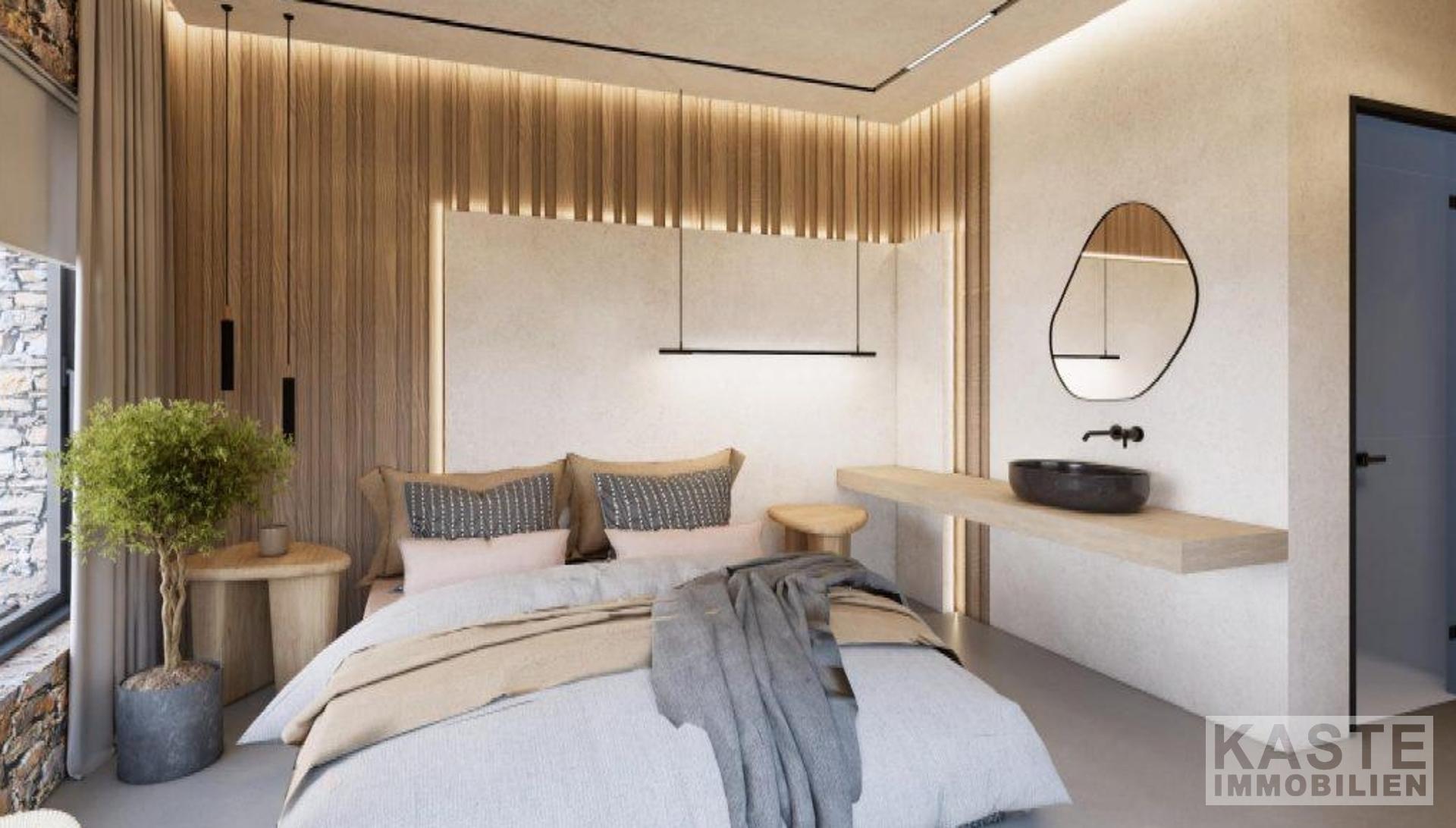 Das Obergeschoss beherbergt ein weiteres großzügiges Schlafzimmer mit eigenem Komfortbad und Zugang zu einem weitläufigen Balkon, von dem aus Panoramablicke auf die sanften Hügel und das kaum überbaute Küstenpanorama begleiten. Mit zwei Badezimmern und durchdachter Raumaufteilung bietet die Villa privaten Rückzugsraum inklusive Wohlfühlambiente.