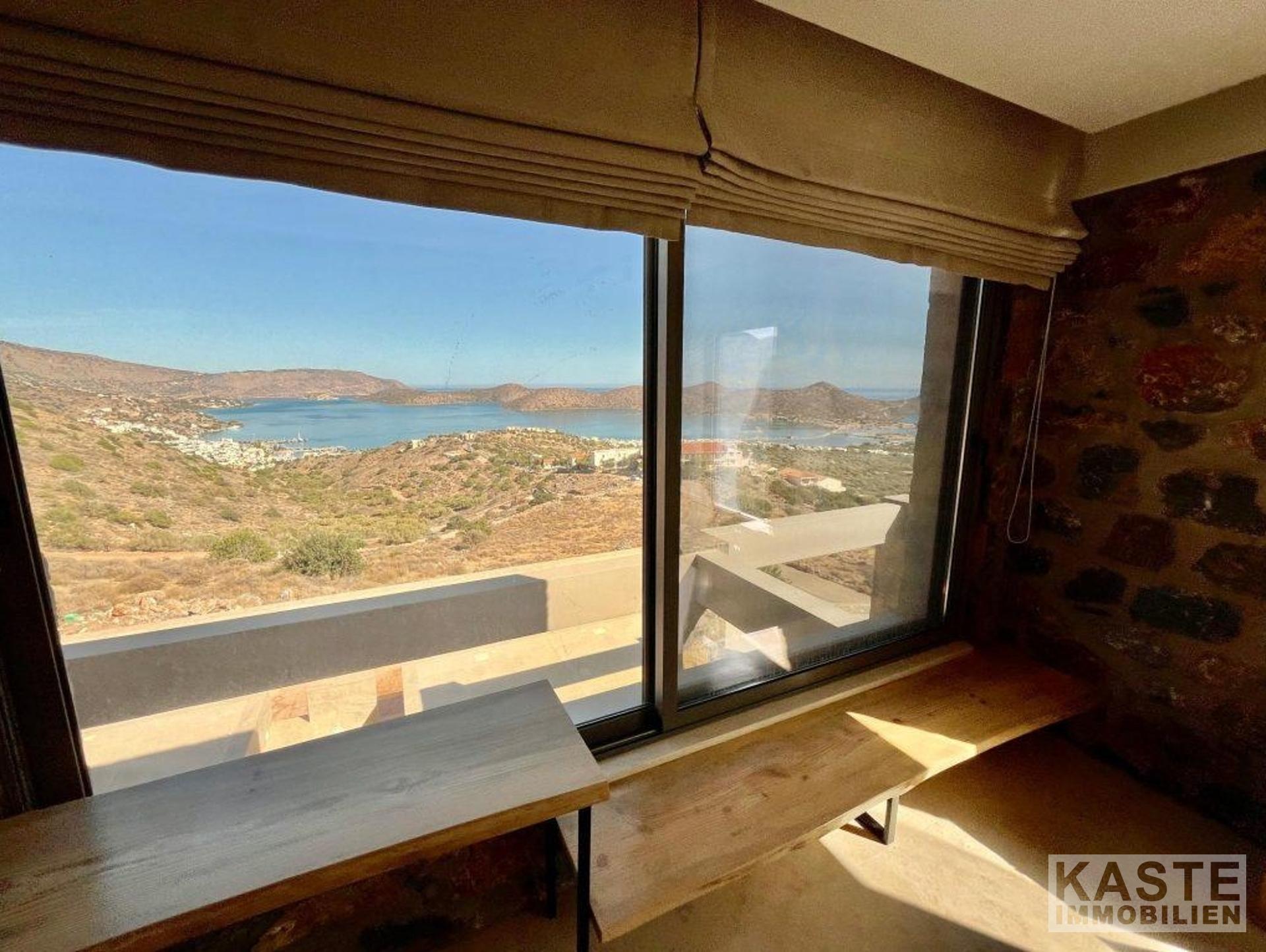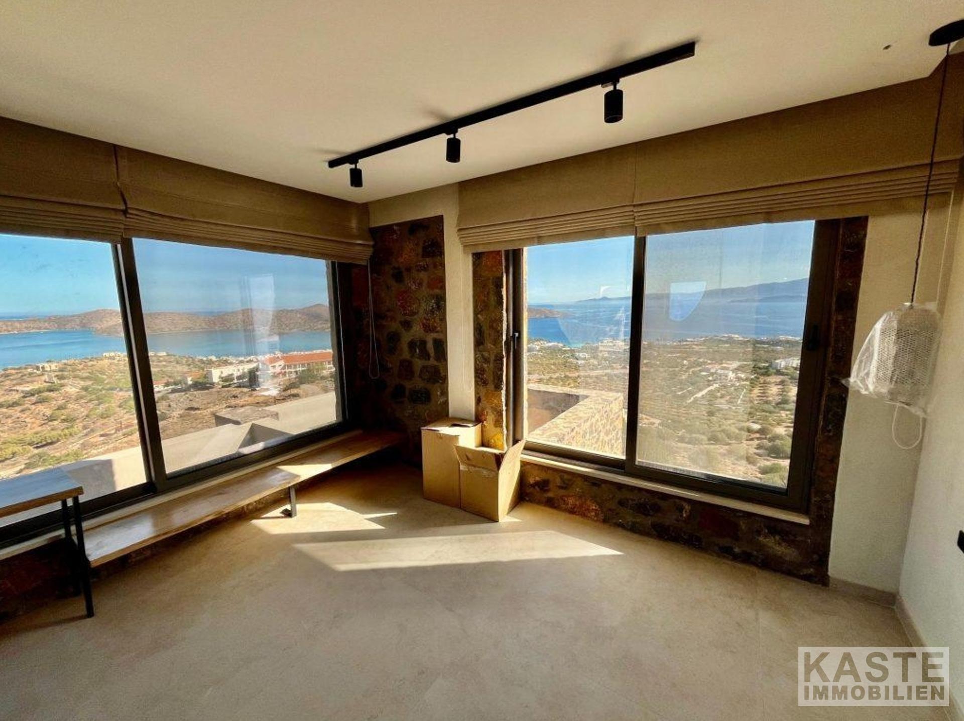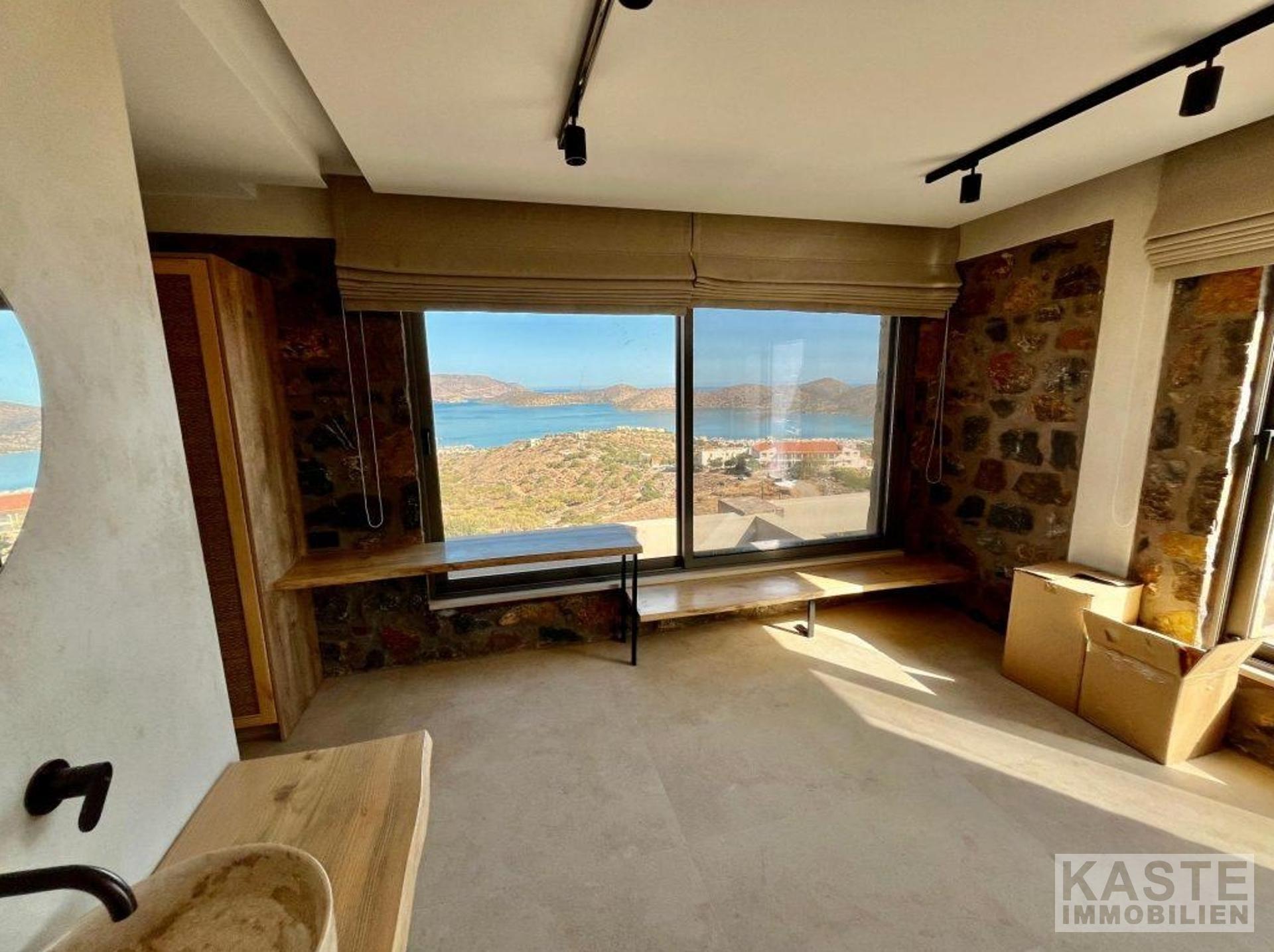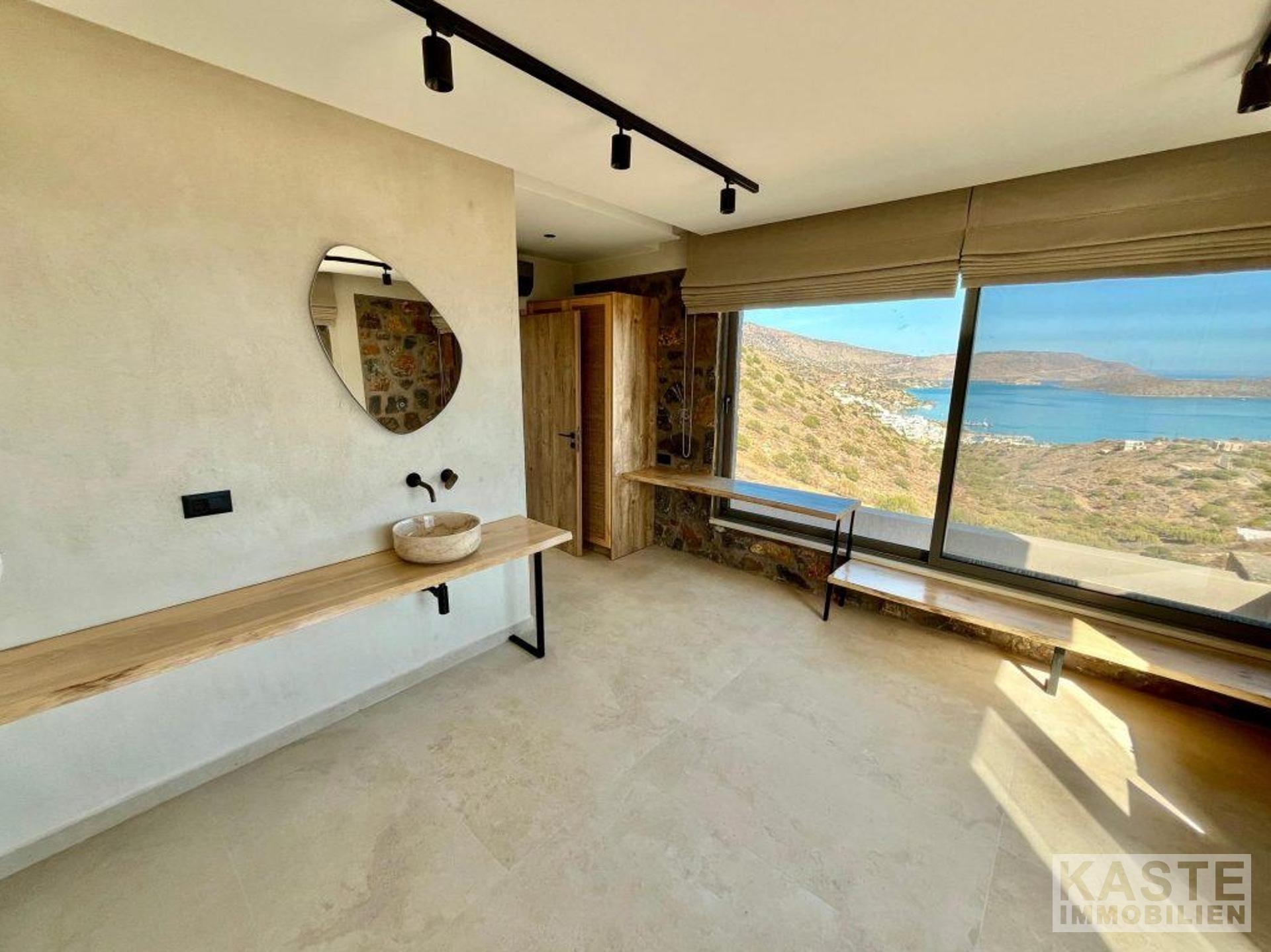 Das Erdgeschoss empfängt Sie mit einem offenen und lichtdurchfluteten Wohn- und Küchenbereich, der zum Entspannen und Verweilen einlädt. Dank der großen Glastüren eröffnet sich vom Wohnbereich und dem angrenzenden Schlafzimmer mit eigenem Duschbad ein direkter Zugang zu den weiten Terrassen mit atemberaubendem Blick auf die Bucht von Elounda und die glitzernde Ägäis. Der lichtdurchflutete loungeartige Bereich eignet sich hervorragend für gesellige Abende oder ruhige Stunden mit der Familie.