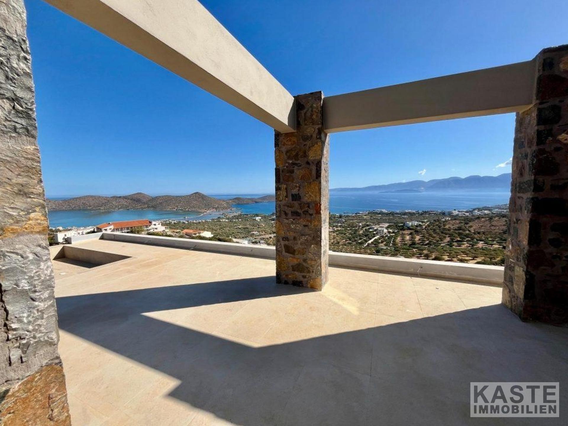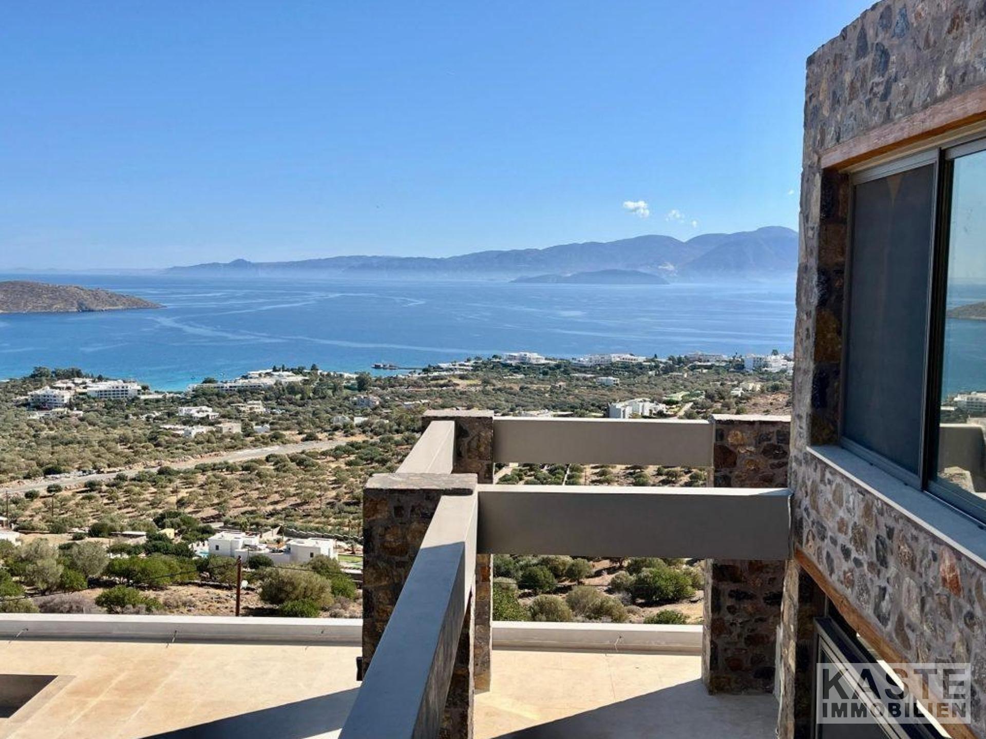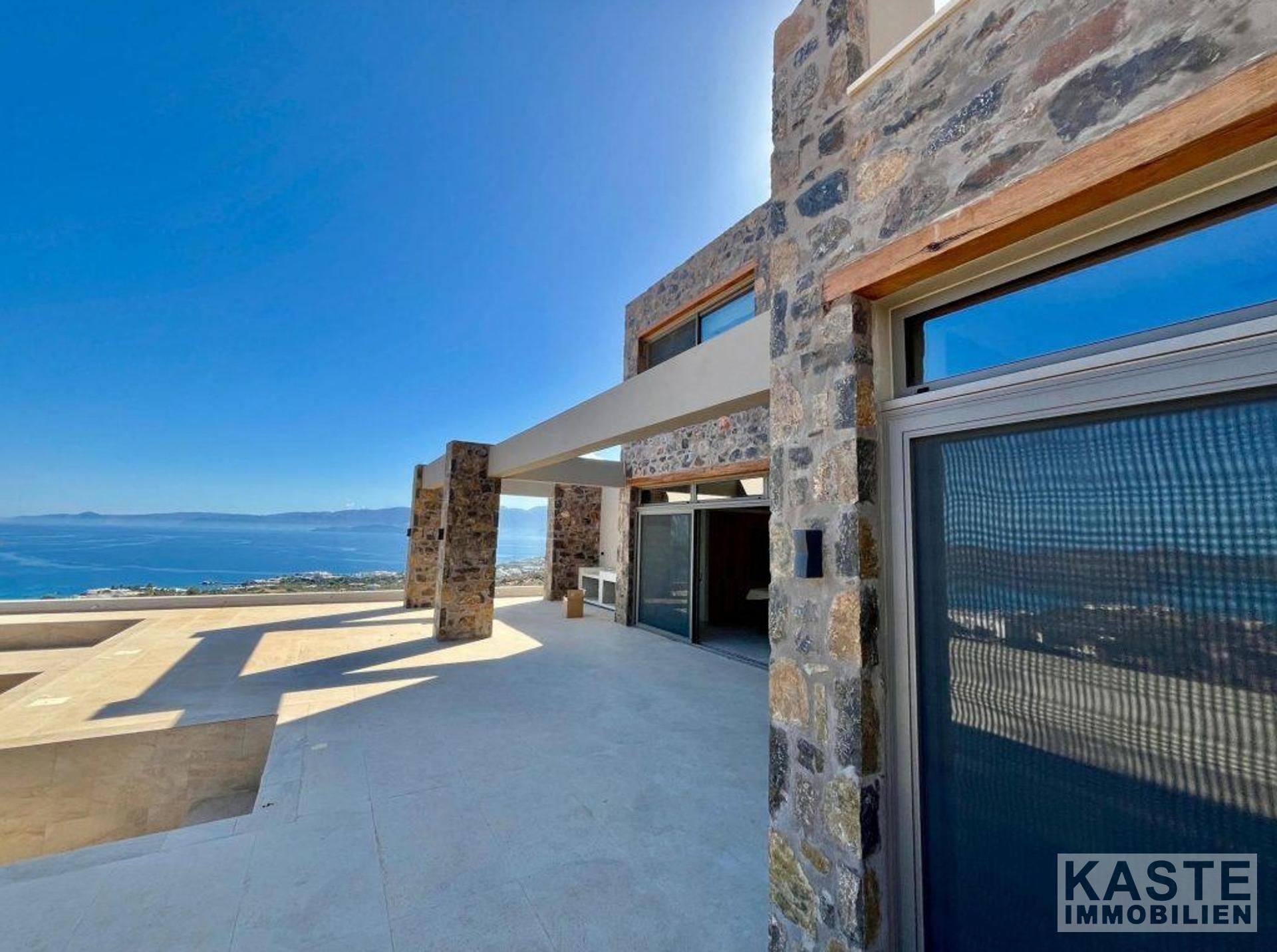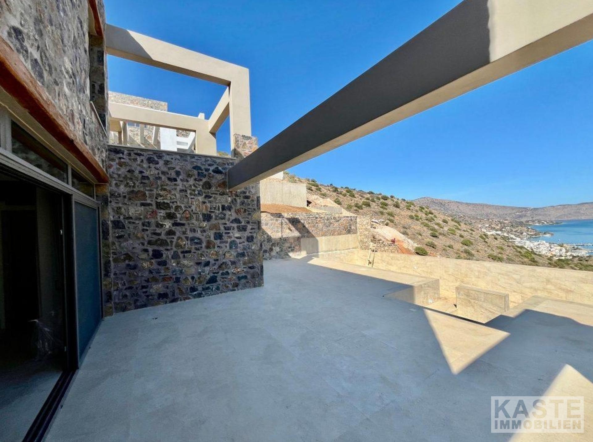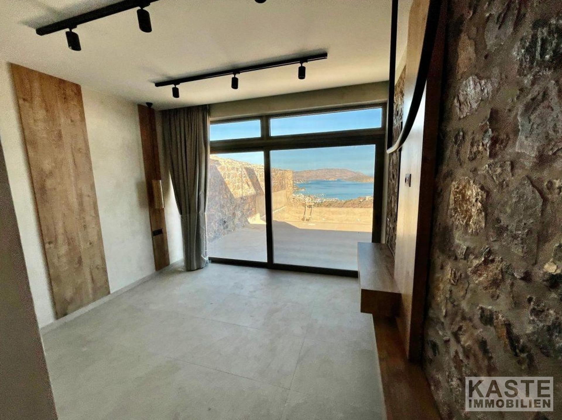 Das Erdgeschoss empfängt Sie mit einem offenen und lichtdurchfluteten Wohn- und Küchenbereich, der zum Entspannen und Verweilen einlädt. Dank der großen Glastüren eröffnet sich vom Wohnbereich und dem angrenzenden Schlafzimmer mit eigenem Duschbad ein direkter Zugang zu den weiten Terrassen mit atemberaubendem Blick auf die Bucht von Elounda und die glitzernde Ägäis. Der lichtdurchflutete loungeartige Bereich eignet sich hervorragend für gesellige Abende oder ruhige Stunden mit der Familie.