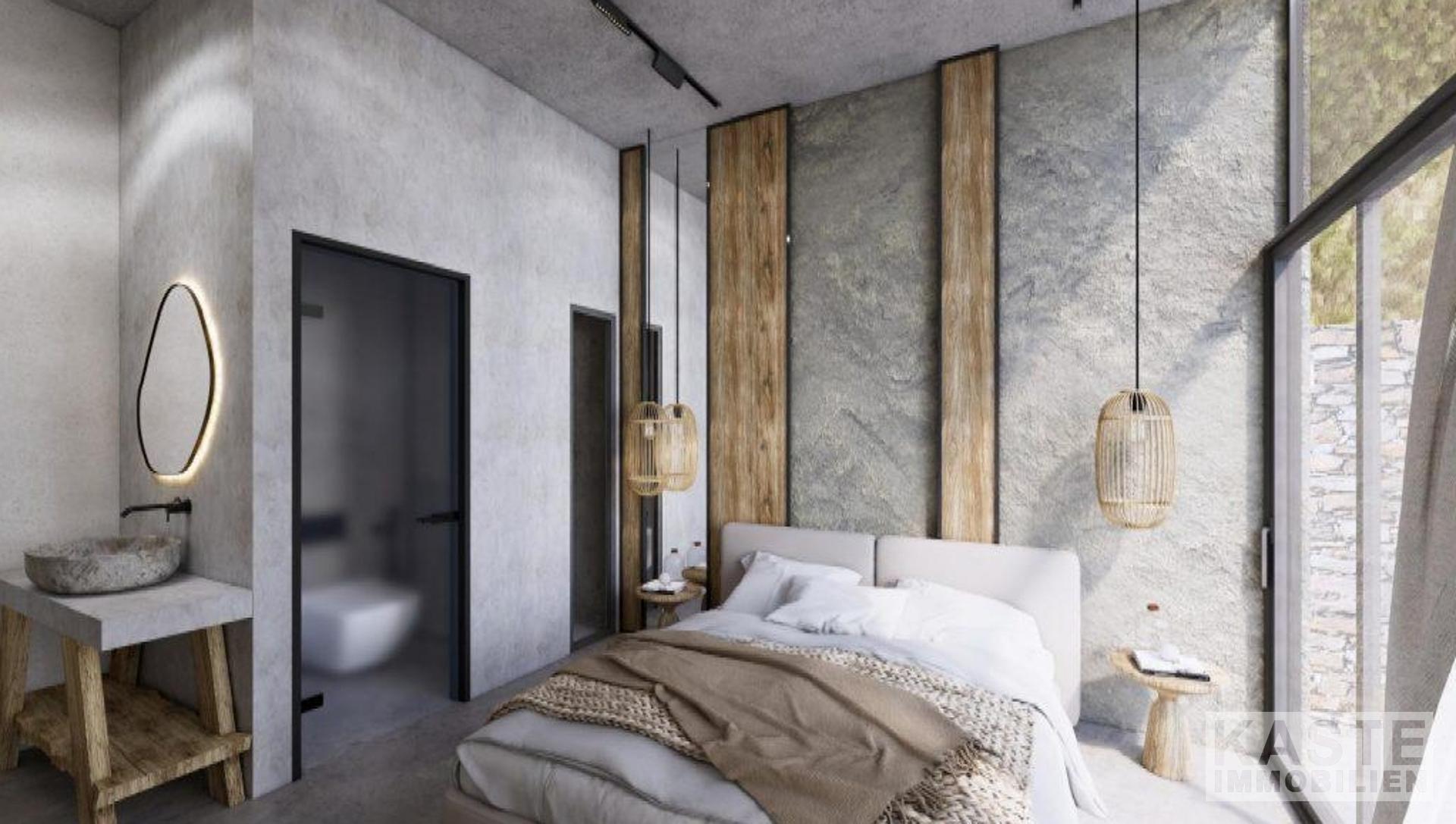 Das Obergeschoss beherbergt ein weiteres großzügiges Schlafzimmer mit eigenem Komfortbad und Zugang zu einem weitläufigen Balkon, von dem aus Panoramablicke auf die sanften Hügel und das kaum überbaute Küstenpanorama begleiten. Mit zwei Badezimmern und durchdachter Raumaufteilung bietet die Villa privaten Rückzugsraum inklusive Wohlfühlambiente.