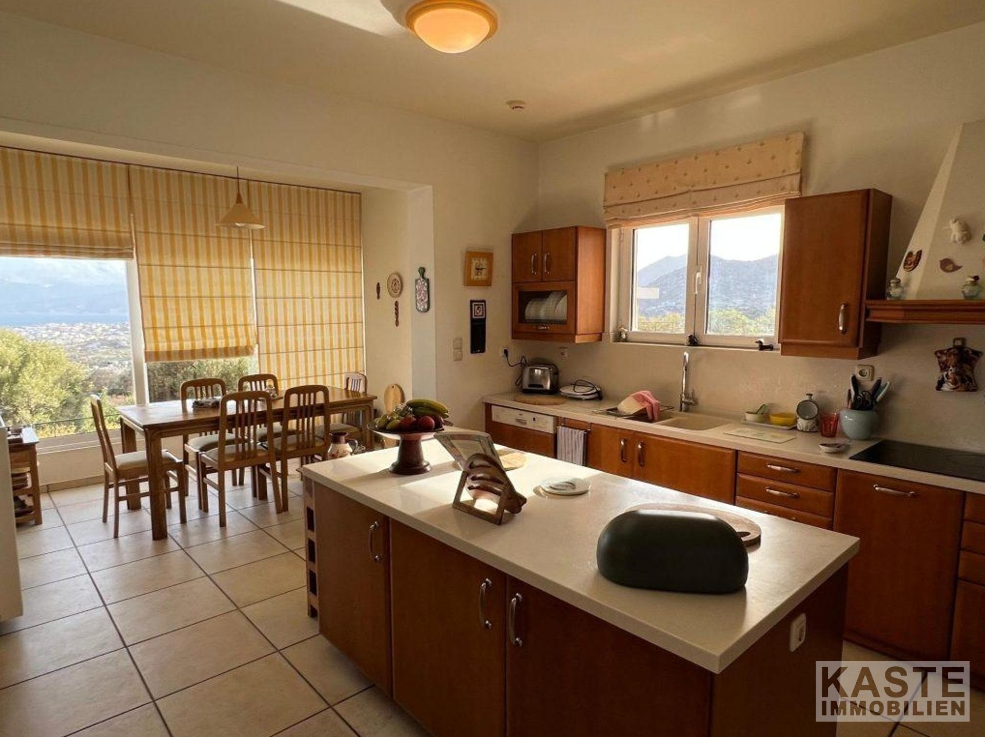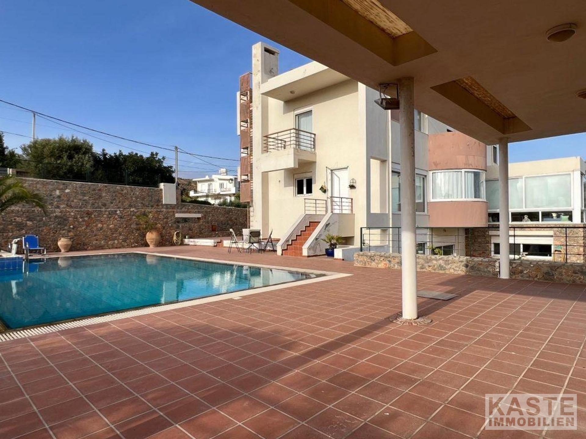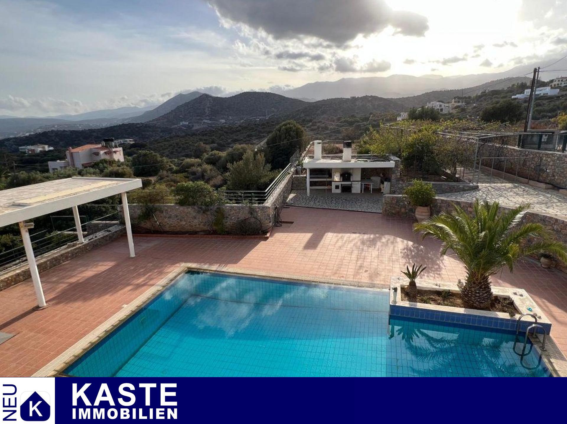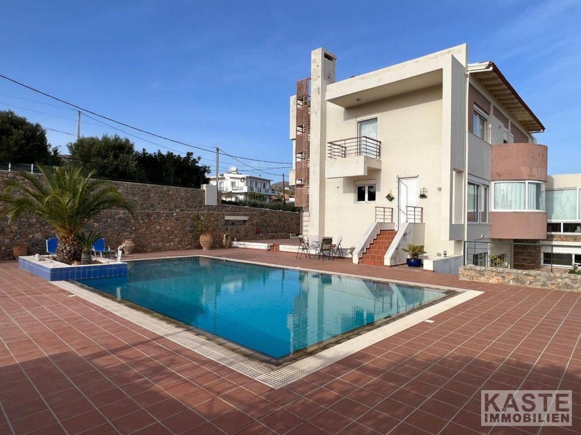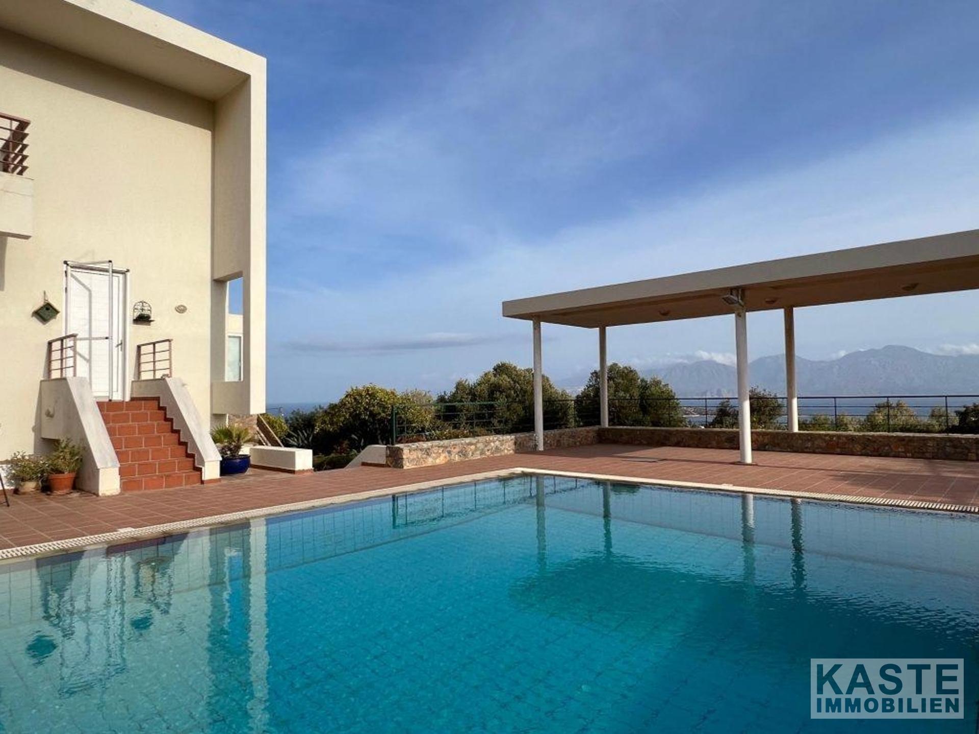 Zum Verkauf steht eine elegante Villa mit fünf Schlafzimmern und einem großzügigen Swimmingpool, die sich in erhöhter Lage befindet und einen atemberaubenden Blick auf die Bucht von Mirabello bietet.