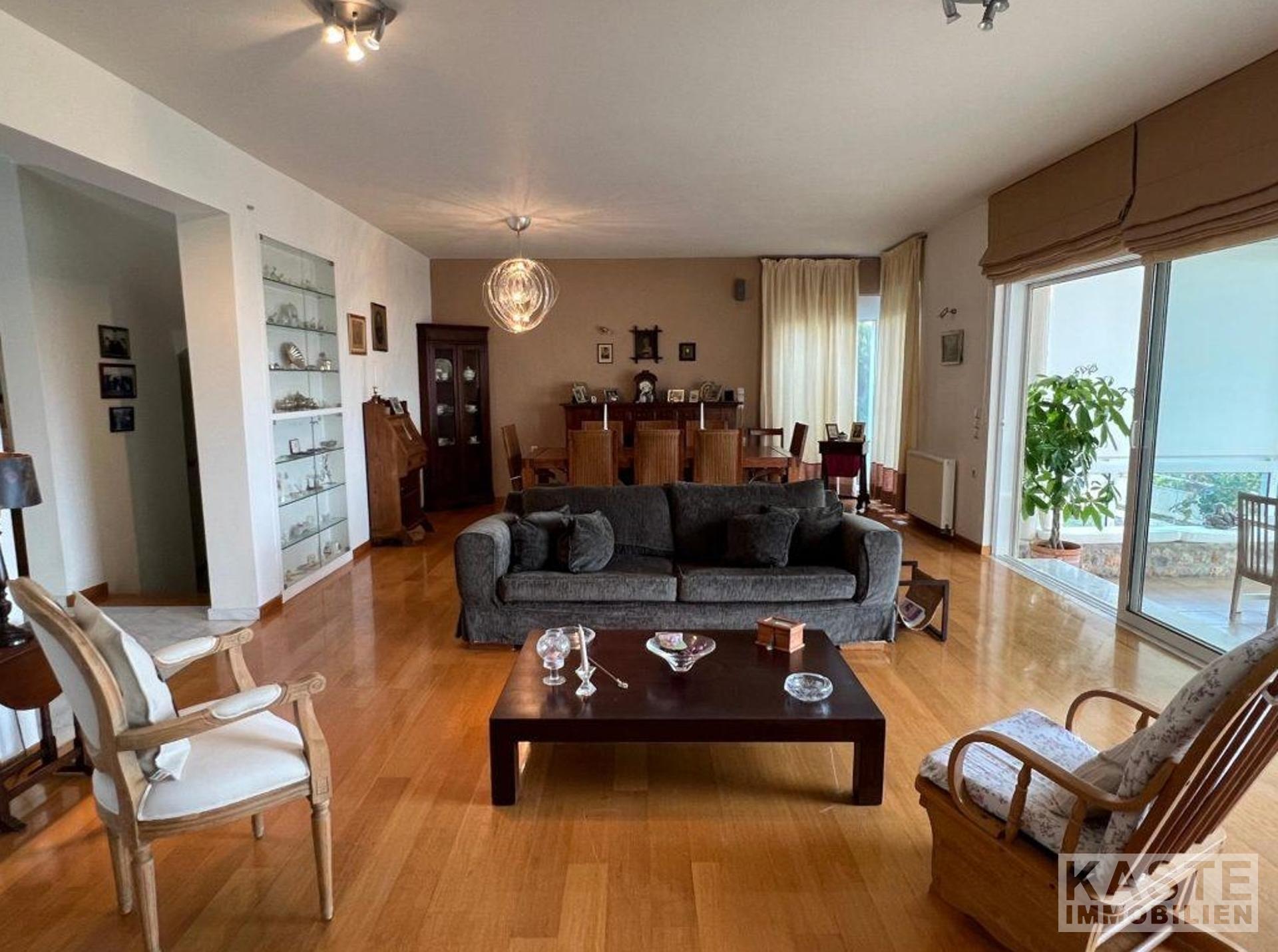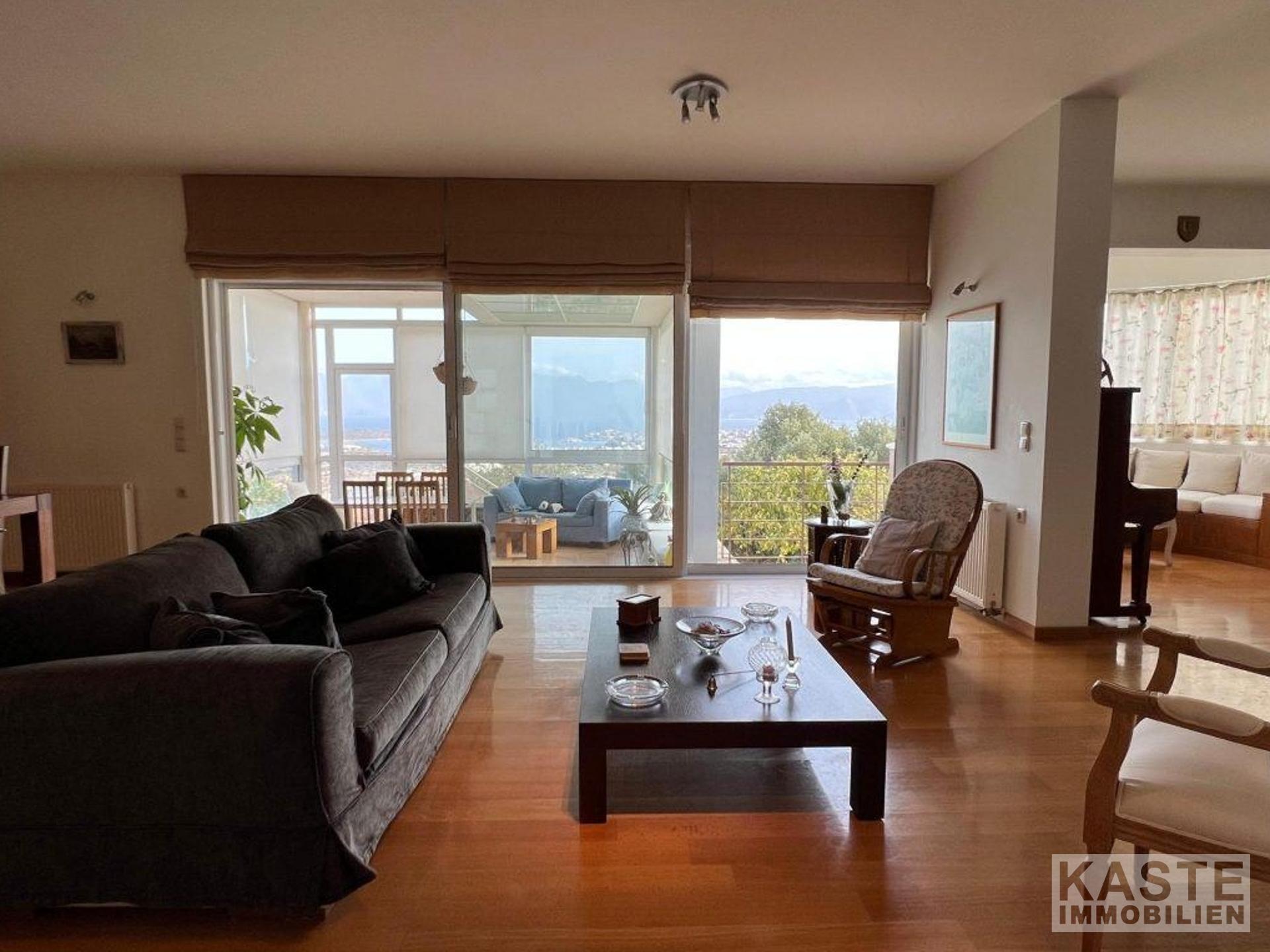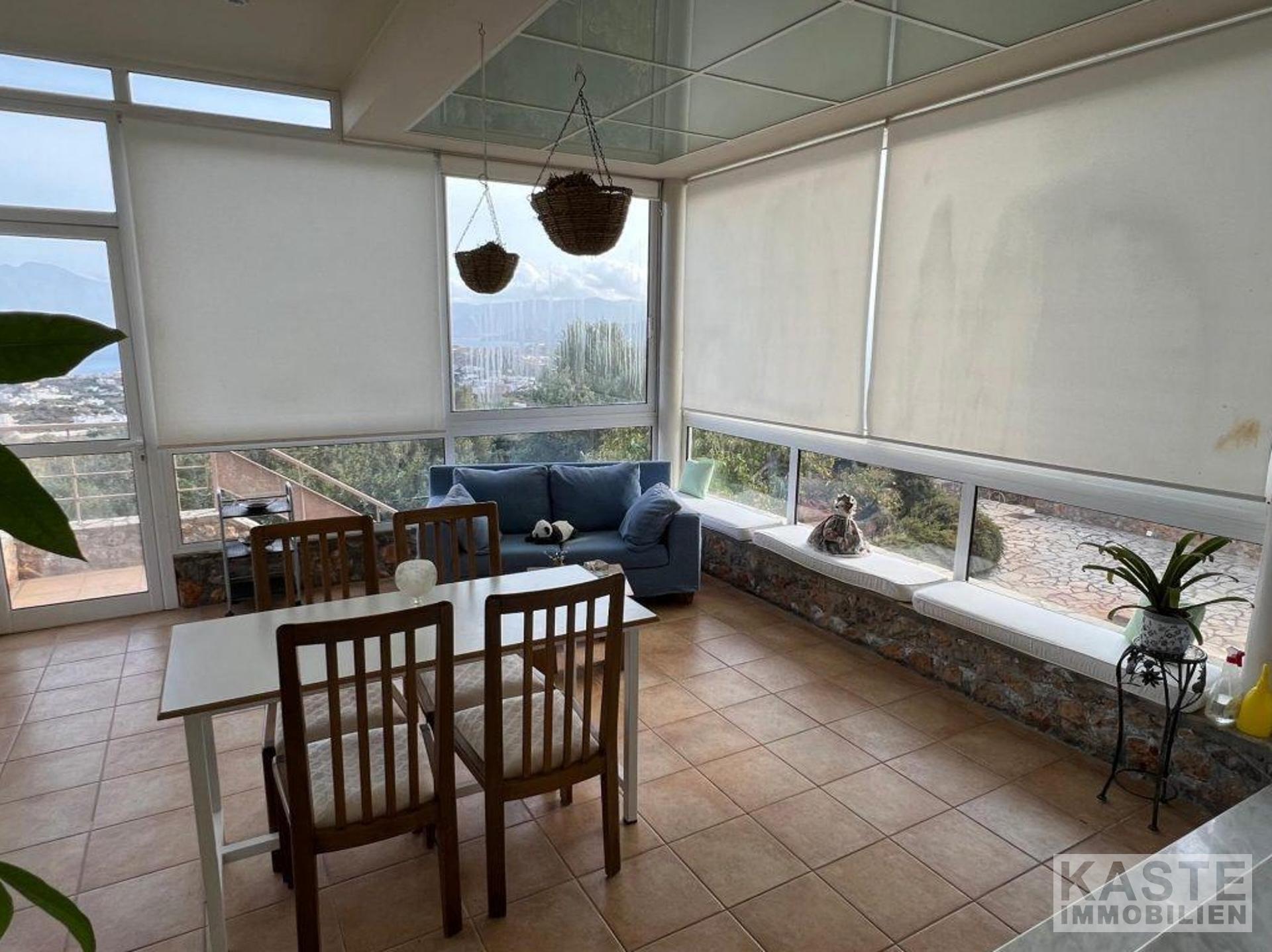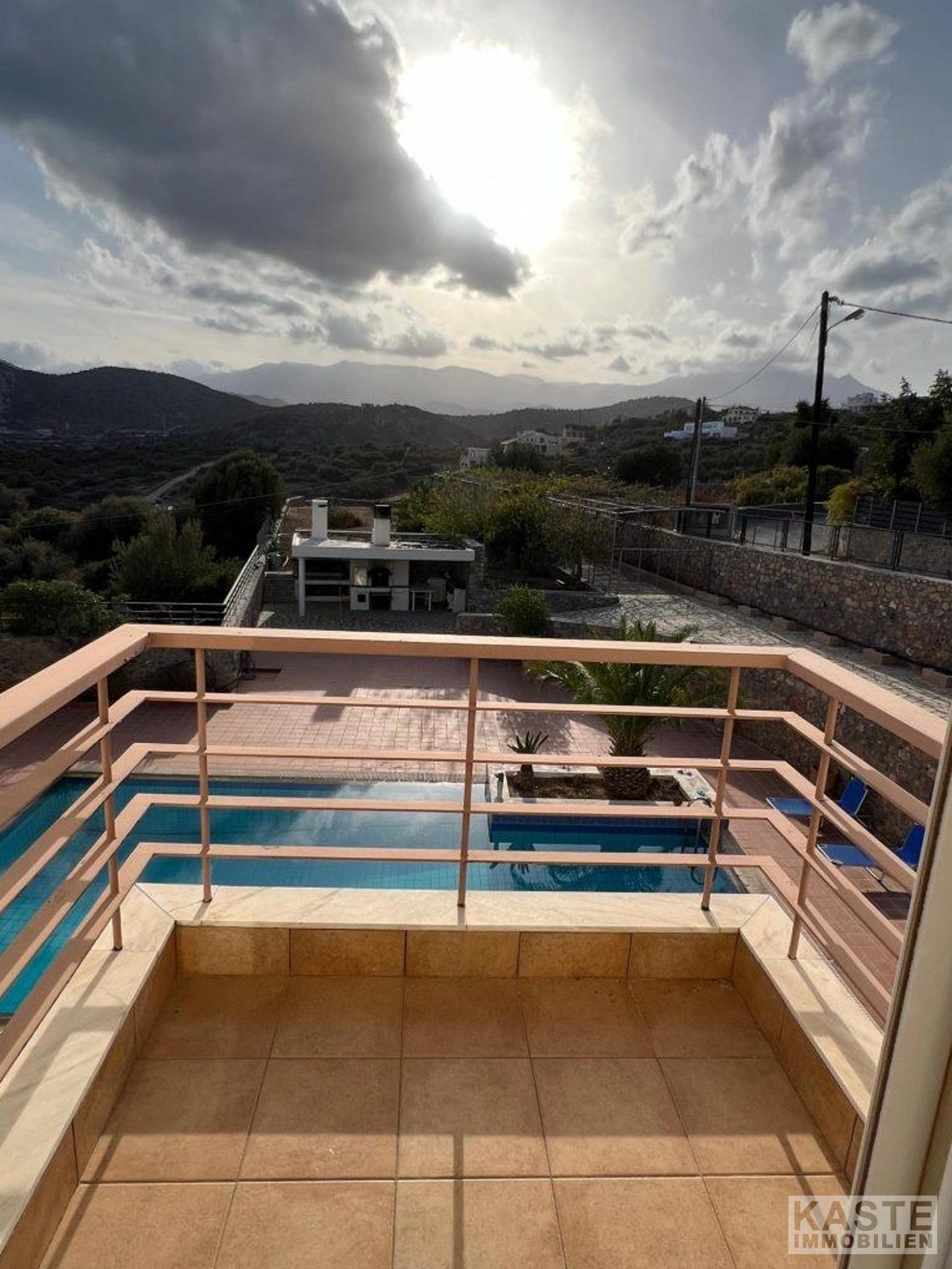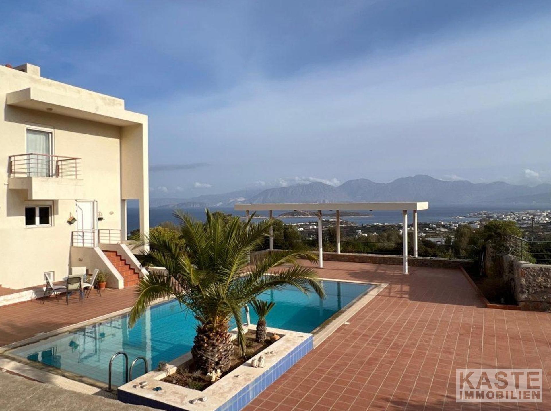 Zum Verkauf steht eine elegante Villa mit fünf Schlafzimmern und einem großzügigen Swimmingpool, die sich in erhöhter Lage befindet und einen atemberaubenden Blick auf die Bucht von Mirabello bietet.
