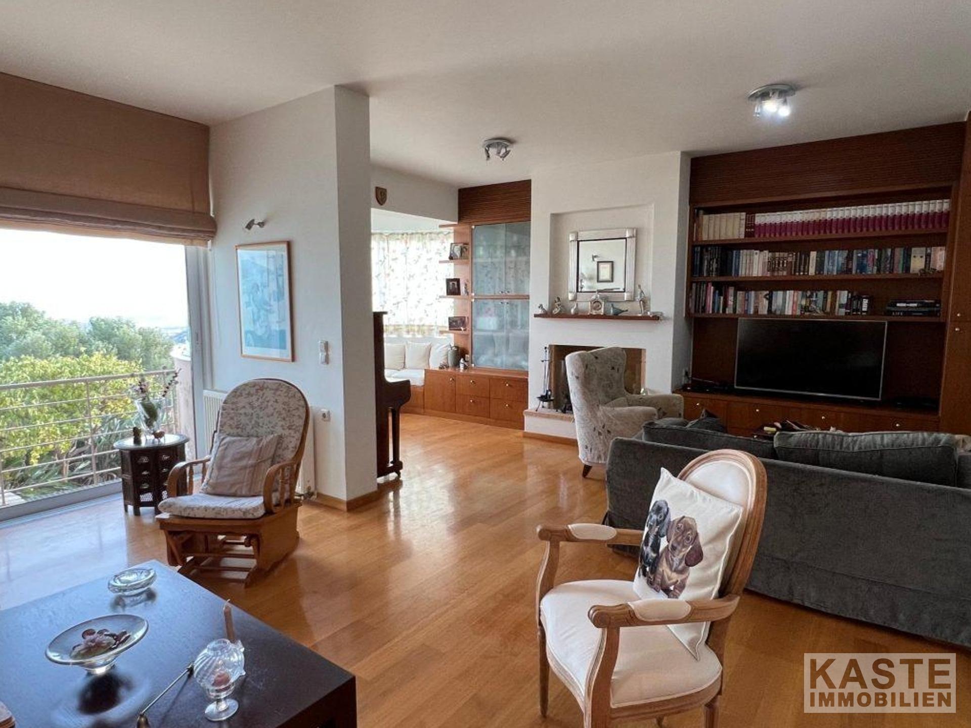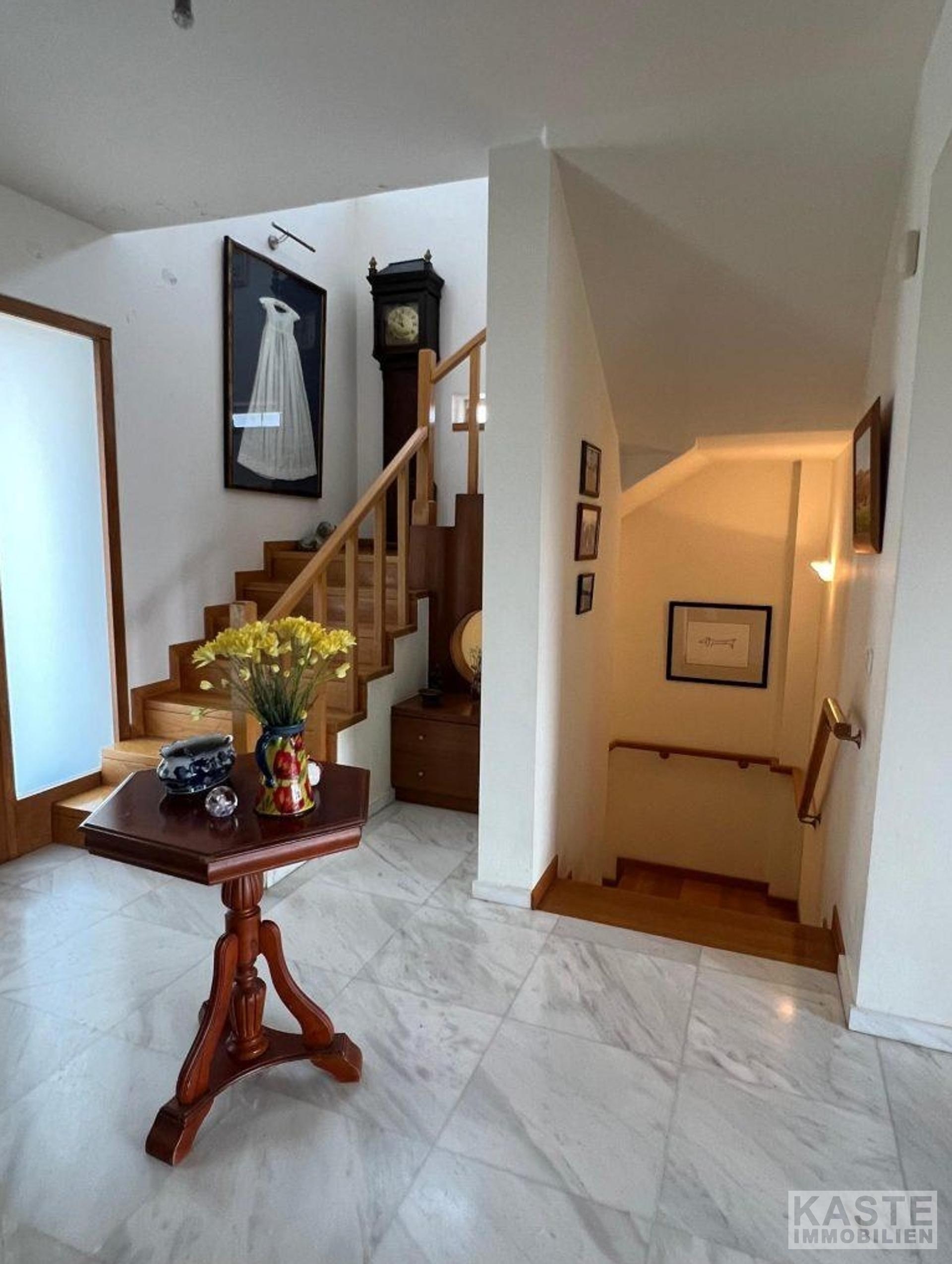 Mit einer Wohnfläche von etwa 300 m² präsentiert sich die Villa auf dem Erdgeschoss mit einem großzügigen Wohn-/Esszimmer, das durch einen Kamin gemütliche Atmosphäre vermittelt, sowie einer Wintergarten-Terrasse mit Essbereich. Eine voll ausgestattete moderne Küche und ein Gäste-WC vervollständigen diesen Bereich.