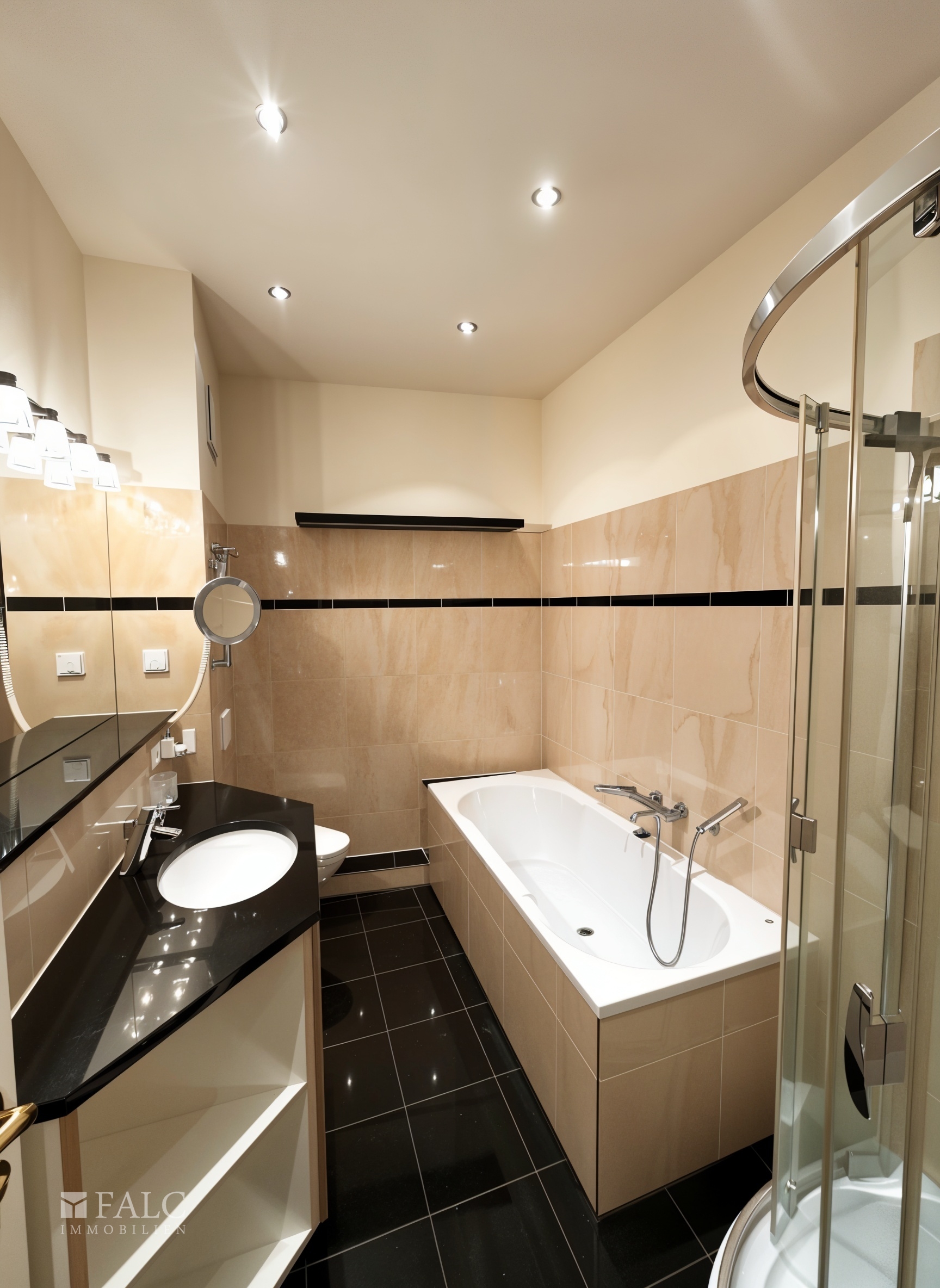 Das Badezimmer ist stilvoll gestaltet und verfügt über eine Badewanne sowie eine separate Dusche, was den Komfort zusätzlich erhöht.