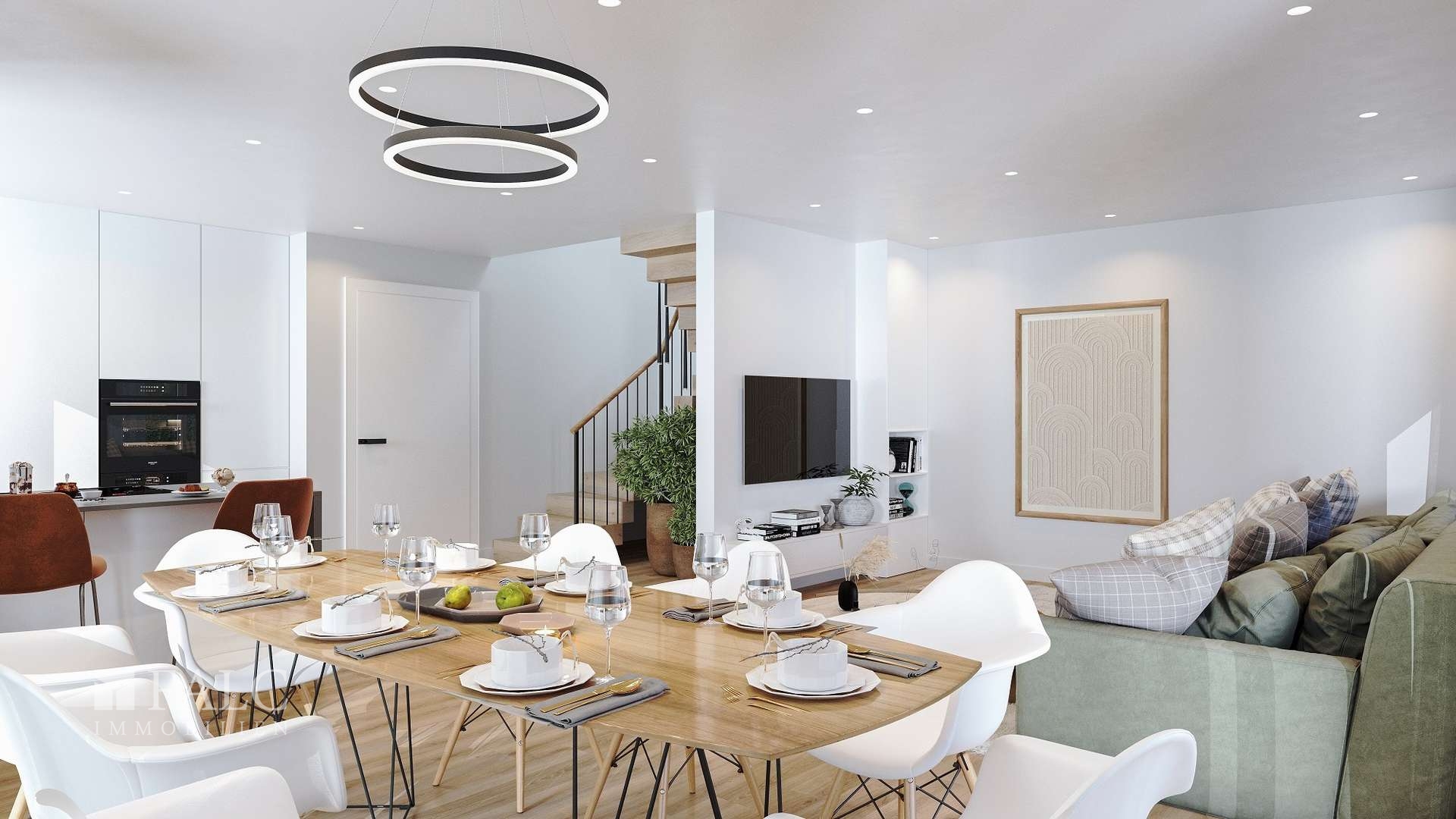 Bereits beim Betreten des Hauses empfängt Sie ein einladender Eingangsbereich mit Platz für Garderobe. Auf der linken Seite befindet sich ein modernes Gäste-WC, auf der rechten Seite der Technikraum. Von hier aus gelangen Sie in den offen und lichtdurchflutet gestalteten Wohn- und Essbereich mit integrierter Küche.