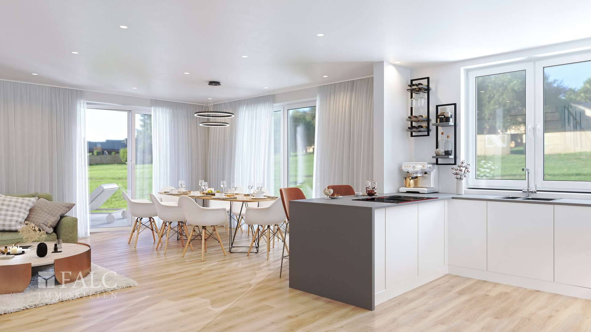 Großzügige Fensterflächen sorgen für eine helle, freundliche Atmosphäre und ermöglichen den direkten Zugang zur Terrasse und in den Garten – ideal für entspannte Sommerabende, Familienfeste oder gemütliche Stunden im Freien.