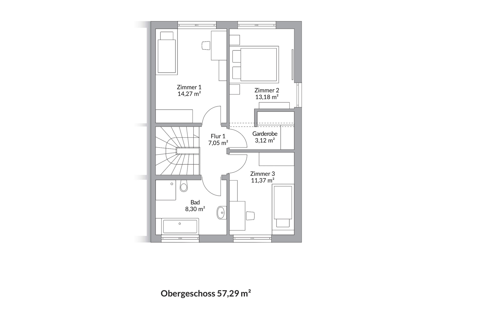 Im Obergeschoss stehen Ihnen drei gut geschnittene Zimmer zur Verfügung. Das Elternschlafzimmer mit angrenzender Ankleide bietet einen ruhigen Rückzugsort, während die beiden weiteren Zimmer flexibel als Kinder-, Arbeits- oder Gästezimmer genutzt werden können. Das modern ausgestattete Badezimmer mit Badewanne und separater Dusche sorgt für zusätzlichen Komfort und rundet das stimmige Raumkonzept ab.