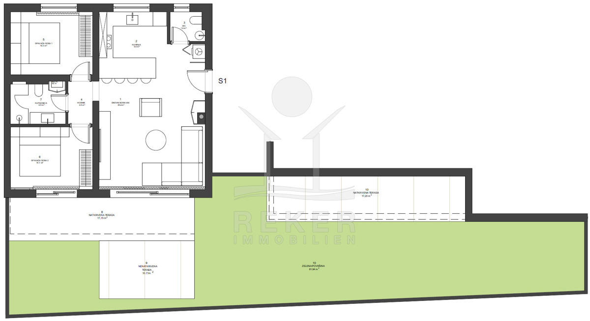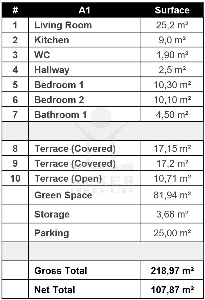 Diese Wohnung bietet alles auf einer Ebene: Zwei Schlafzimmer, ein großzügiger Wohnbereich und ein privater Garten mit über 80 m² Fläche. Dazu drei Terrassen und das Meer fast vor der Tür – ideal für alle, die Freiraum suchen.