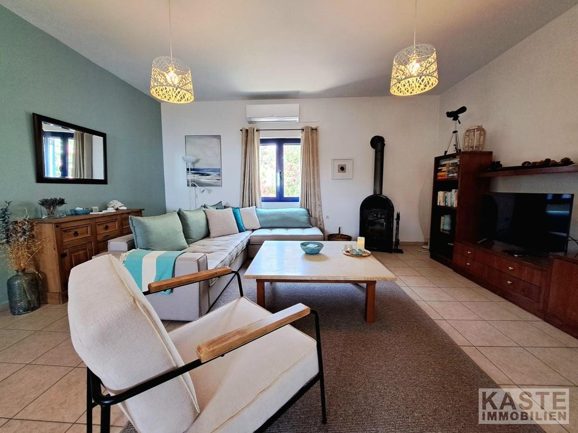 Im Inneren erwartet Sie ein großzügiger, offener Wohn- und Essbereich mit einem gemütlichen Holzkamin. Die voll ausgestattete Küche führt auf eine geräumige, überdachte Terrasse, die sich ideal zum Speisen im Freien und zum Genießen der Aussicht eignet.
