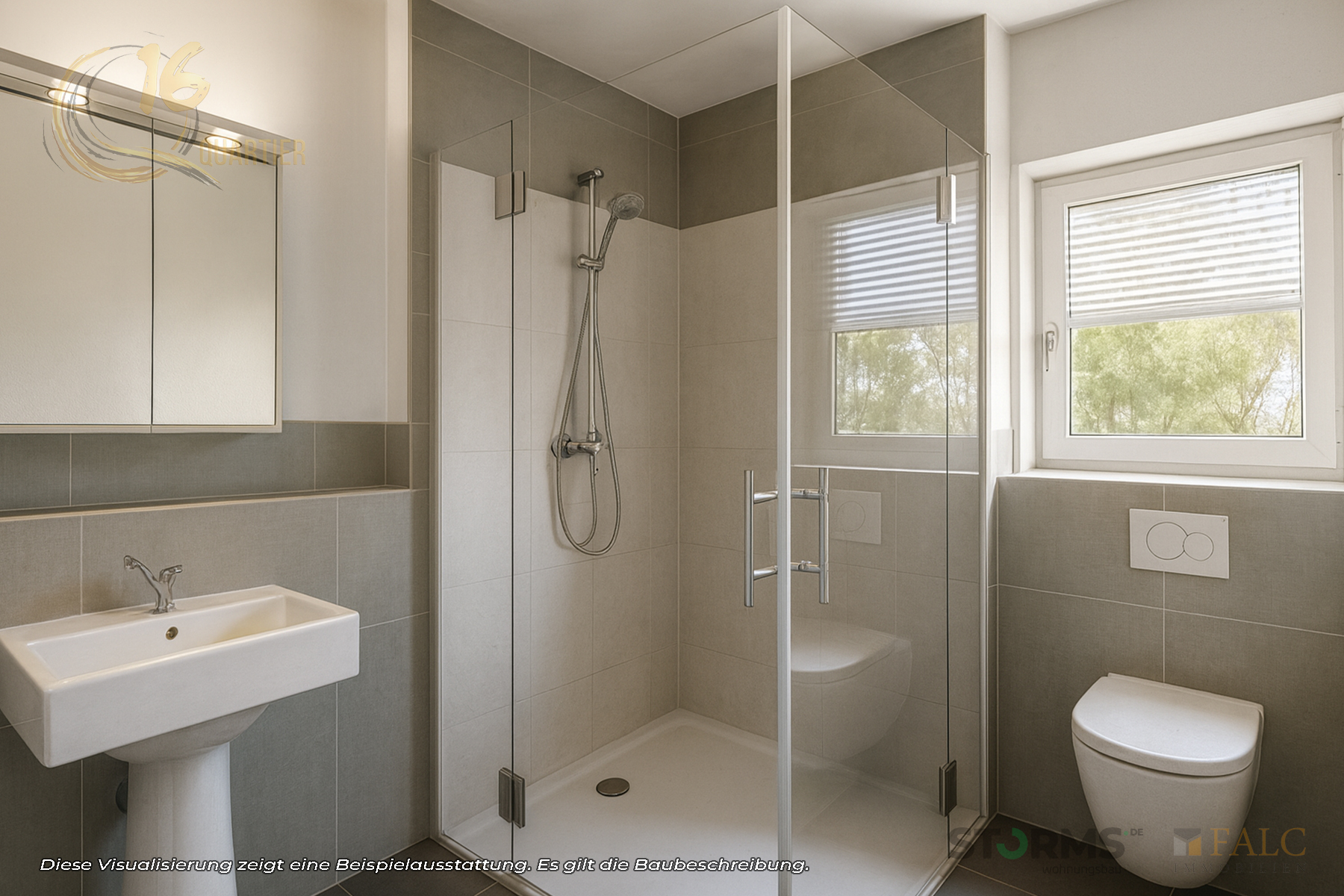 Das Badezimmer ist in der Planung mit einer bodengleichen Dusche sowie einem Fenster vorgesehen, wodurch Tageslicht und eine natürliche Belüftung möglich sind. Die Sanitärausstattung wird modern und funktional ausgeführt.