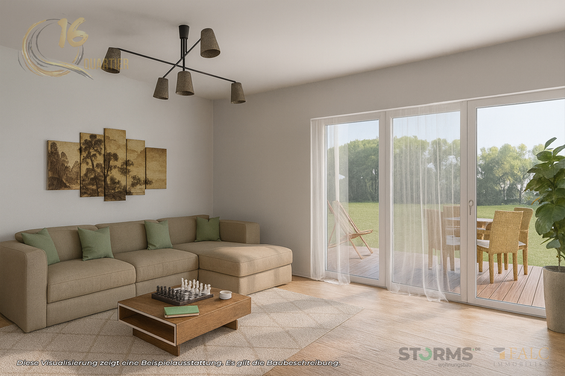 Ein besonderer Vorteil des Projekts ist die flexible Grundrissgestaltung, die – abhängig vom Baufortschritt – individuelle Anpassungen nach Absprache ermöglicht. Vom Wohnbereich aus ist ein direkter Zugang zur Terrasse vorgesehen. Die geplante Fläche der Terrasse beträgt ca. 15,58 m².