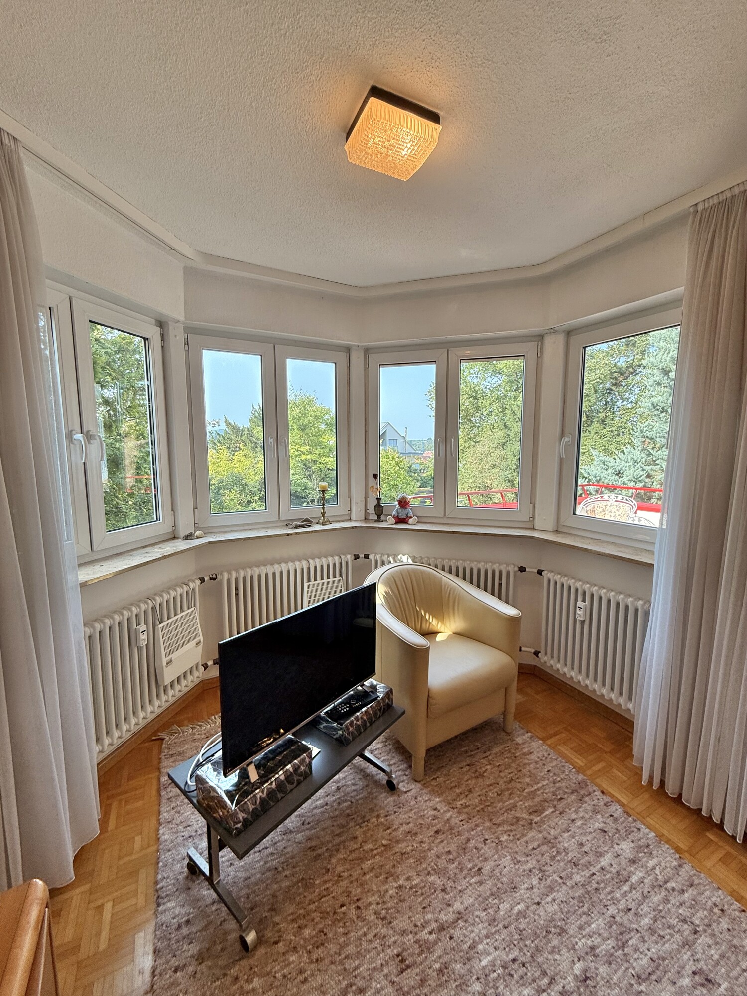 Das Highlight bildet sicherlich das grosszügige und lichtdurchflutete Wohn- und Esszimmer, welches mit Echtholzparkett ausgestattet ist. Große Fenster, sowie ein traumhaft erbauter Erker, sorgen für ein perfektes Wohnklima. Über das Wohnzimmer gelangen Sie auch auf einen der sanierten Balkone. Perfekt um dort in den warmen Monaten Zeit zu verbringen und in die tolle Parkanlage zu blicken.