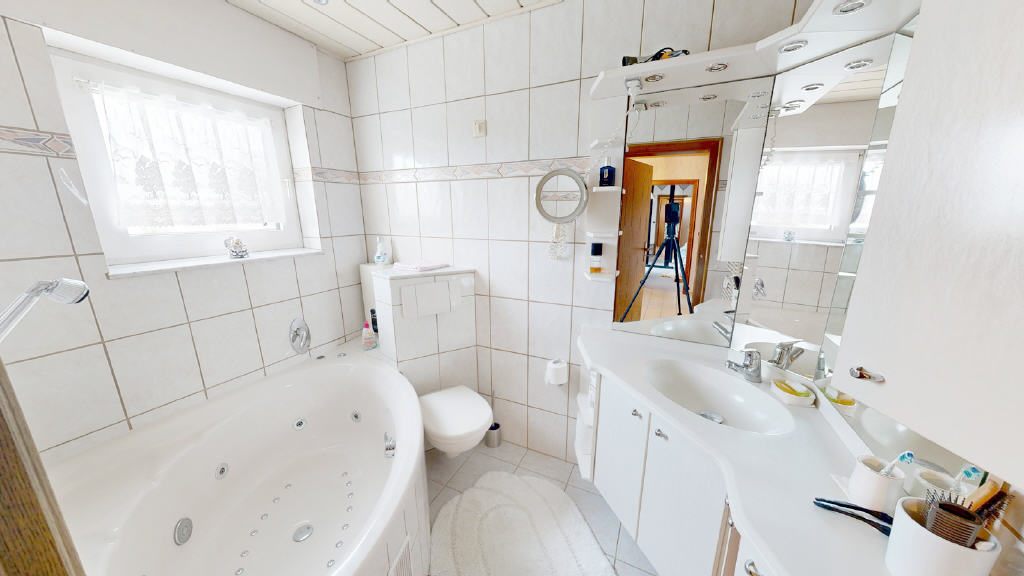 Der Flur ist gefliest und führt zum modernisierten Badezimmer, welches im Jahr 2013 erneuert wurde. Es präsentiert sich in zeitlosem Weiß, verfügt über ein Fenster zur natürlichen Belichtung und Belüftung sowie über eine komfortable Eckbadewanne, WC und Waschtisch.