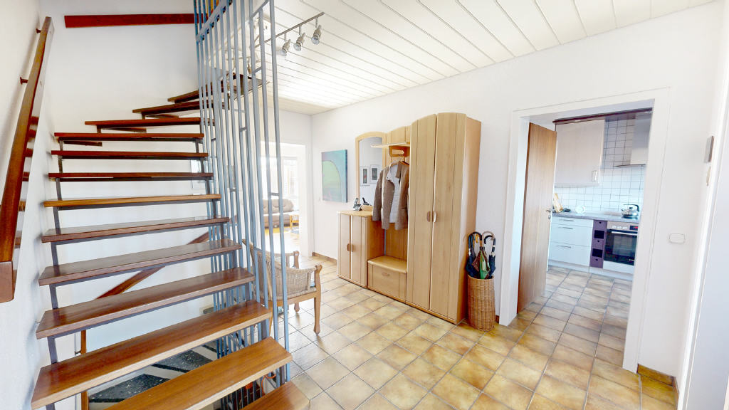 Das offen gestaltete Treppenhaus, bestehend aus Holzstufen mit einer Stahl Unterkonstruktion, führt Sie in das Obergeschoss.