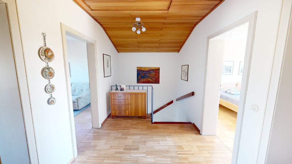 Das gesamte Obergeschoss (mit Ausnahme des Badezimmers) ist mit einem hellen, gepflegten Parkettboden ausgelegt und besteht aus einem Elternschlafzimmer mit begehbarem Kleiderschrank, zwei Kinderzimmern und einem Badezimmer.