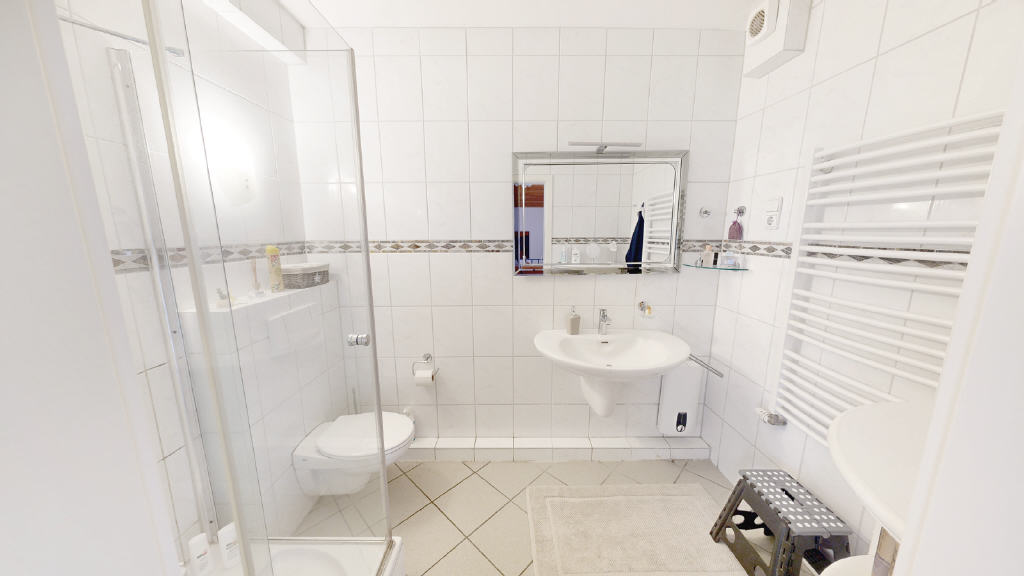 Das Badezimmer vervollständigt das Obergeschoss. Auch dieses wurde im Laufe der Jahre bereits erneuert. Eine verglaste Dusche, ein Waschtisch, ein WC sowie ein formschöner Handtuchheizkörper beschreiben die Ausstattung.