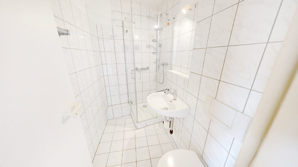 Eine neue verglaste Dusche (aus ca. 2023), ein Waschtisch sowie das WC fügen sich harmonisch in das Gesamtbild ein und unterstreichen den sehr gepflegten Wohlfühlcharakter der Wohnung.