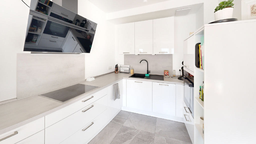 Optisch vom Wohn-/Esszimmer separiert präsentiert sich die offene Küche. Diese bietet reichlich Raum für die Gestaltung Ihrer eigenen Einbauküche inkl. viel Stau-/ und Arbeitsfläche.