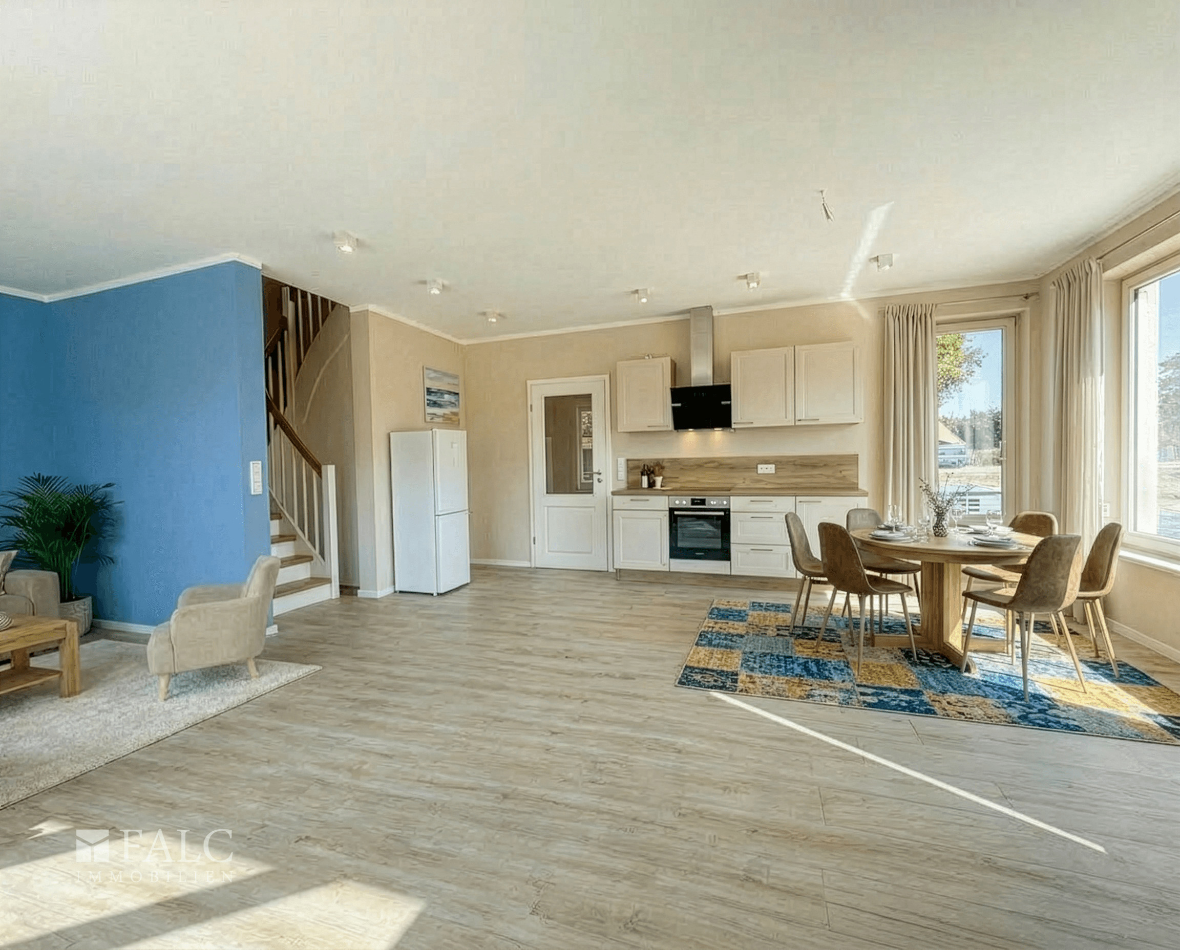Der große Wohnbereich mit bodentiefen Fenstern ermöglicht einen wunderschönen Ausblick auf den liebevoll gestalteten Garten und lädt zum Verweilen ein. Der gut durchdachte Grundriss sorgt für eine optimale Raumaufteilung und eine angenehme Wohnatmosphäre.