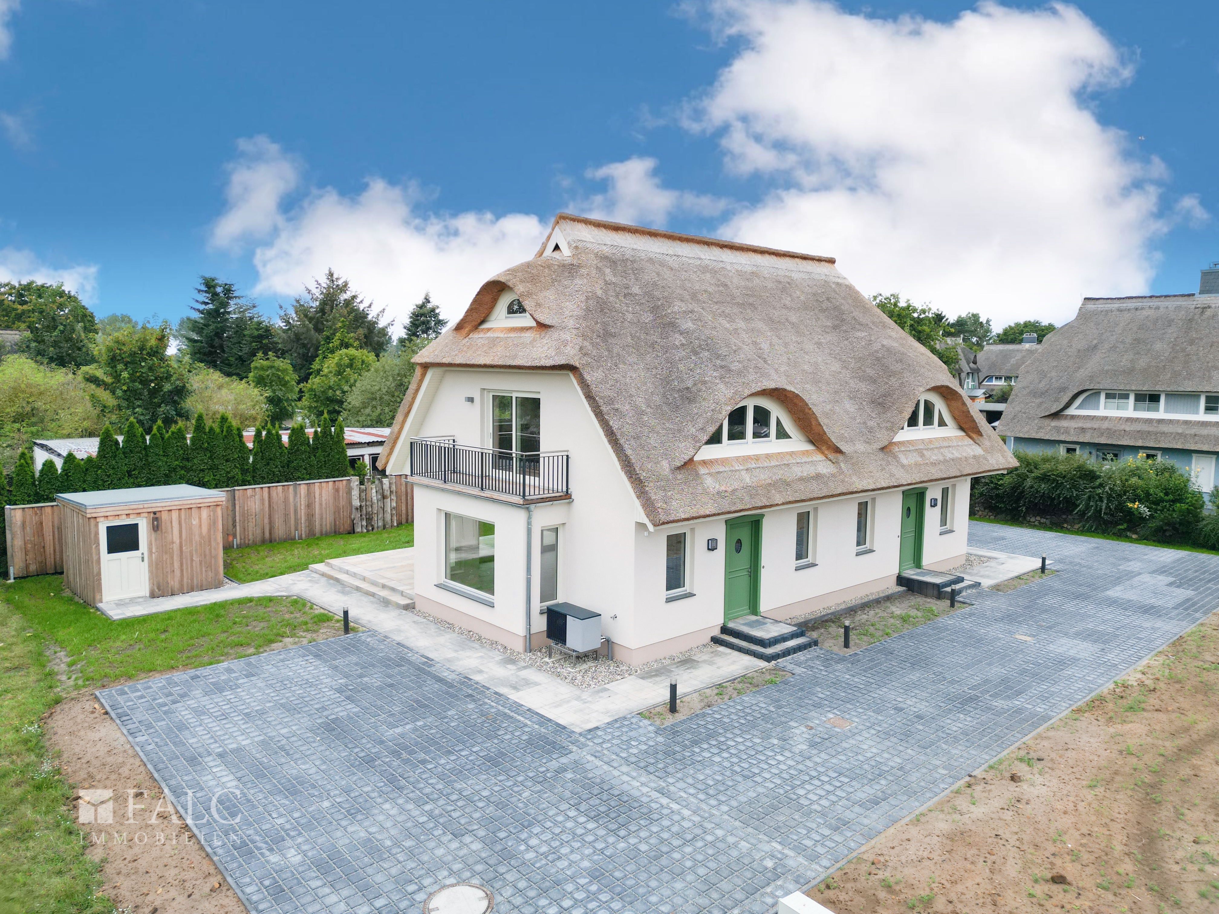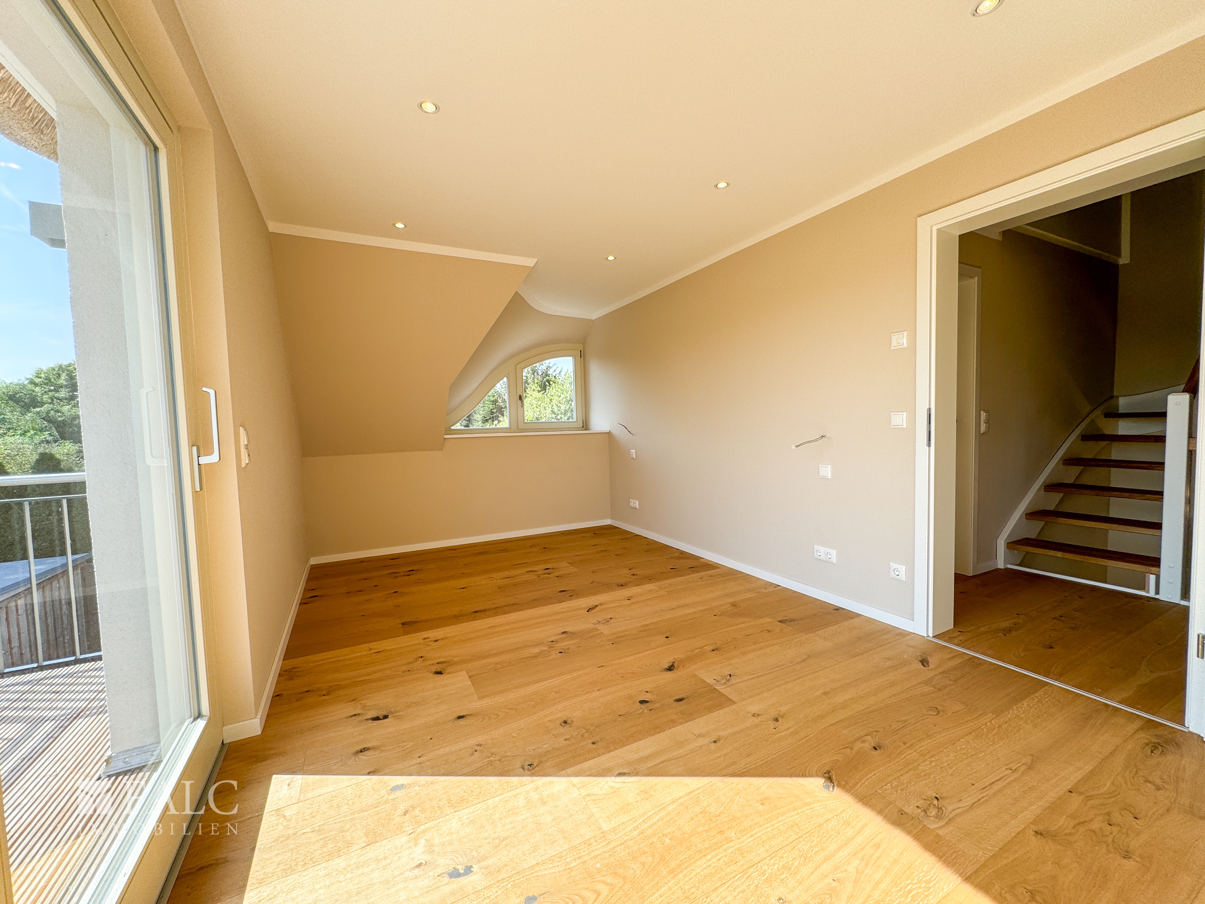 Vom Flur aus erwartet Sie ein großzügiger Wohnbereich mit großen Fensterfronten und direktem Zugang zur 36 m² großen Terrasse. Die Schiebetür zur sonnenverwöhnten Terrasse ermöglicht einen fließenden Übergang zwischen Innen- und Außenbereich. Der Boden im Wohnzimmer ist gefliest, was den Raum zusätzlich aufwertet. Ebenso vom Flur des Hauses gelangen sie in das Gäste-WC, welches über eine Dusche, einen Waschtisch, ein WC sowie ein Fenster für Tageslicht verfügt. Ein kleiner Abstellraum bietet angrenzend an diesen Raum zusätzlichen Stauraum. Neben dem Gäste-WC gibt es einen praktischer HWR mit Heizung der Platz für Waschmaschine, Trockner und weitere Hausgeräte bietet. Im Dachgeschoss finden Sie ein modern ausgestattetes Badezimmer mit einer großen Dusche, einem WC, einem Waschtisch und einem Fenster. Zusätzlich gibt es zwei geräumige Zimmer, eines davon mit einem Balkon, der über eine Schiebetür zugänglich ist – perfekt, um den Morgen mit frischer Luft zu beginnen oder den Abend gemütlich ausklingen zu lassen. Spitzboden: Der ausgebaute Spitzboden bietet zusätzlichen Wohnraum und ist als gemütliches Zimmer mit Fenster gestaltet. Hier finden Sie einen ruhigen Rückzugsort, ideal als Büro, Gästezimmer oder Hobbyraum nutzbar. Das Haus ist mit einer modernen Luft-Wärmepumpe der Firma Viessmann ausgestattet, welche eine umweltfreundliche und effiziente Wärmeversorgung garantiert. Die Fußbodenheizung in allen Räumen sorgt für ein behagliches Wohnklima und wird durch den Massivholz-Fußboden ergänzt. Die Doppelhaushälfte ist mit einem Rohrdach und einem charakteristischen Krüppelwalmdach mit Schwalbengaube versehen, was dem Haus einen einzigartigen, traditionellen Charme verleiht. Hochwertige Holzfenster und massive Holztüren, auch eine besonders einladende Eingangstür, unterstreichen die natürliche und edle Optik des Hauses. Die großzügigen Fenster im Wohnbereich lassen viel Tageslicht herein. Die vorhandene Satellitenanlage ermöglicht einen optimalen TV-Empfang. Zudem ist das Haus bereits an das schnelle Glasfasernetz angeschlossen und garantiert Ihnen eine stabile und schnelle Internetverbindung. Die 36 m² große Terrasse lädt zu entspannten Stunden im Freien ein. Im Garten befindet sich ein praktisches Gartenhäuschen, das ideal zum Abstellen von Fahrrädern und Gartengeräten genutzt werden kann. Zudem stehen zwei PKW-Stellplätze zur Verfügung. Das Haus besticht durch seine hochwertige Bauweise und die geschmackvolle Ausstattung. Dank der modernen Technik und der durchdachten Raumaufteilung ist dieses Objekt sowohl funktional als auch ästhetisch ein echter Wohntraum.