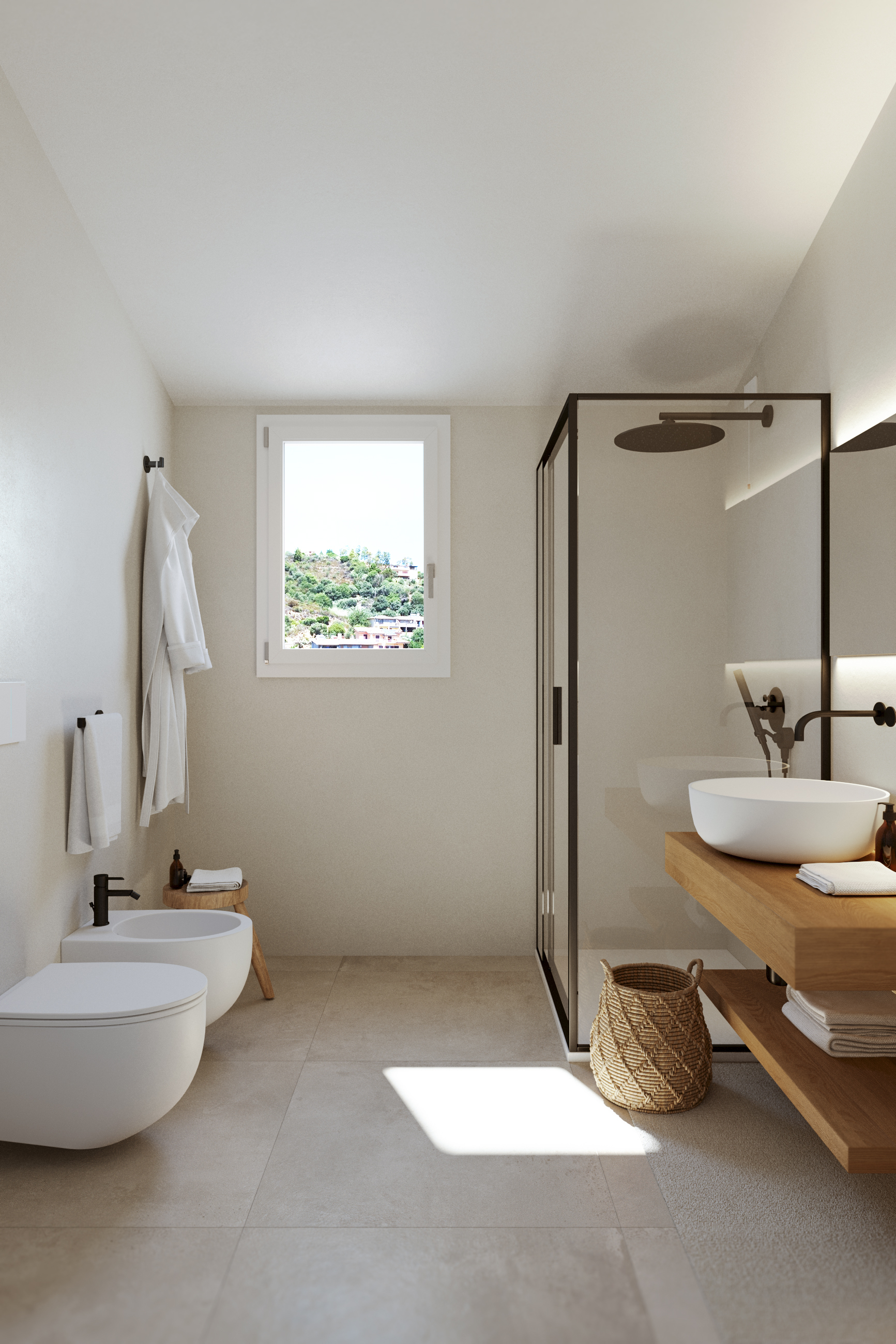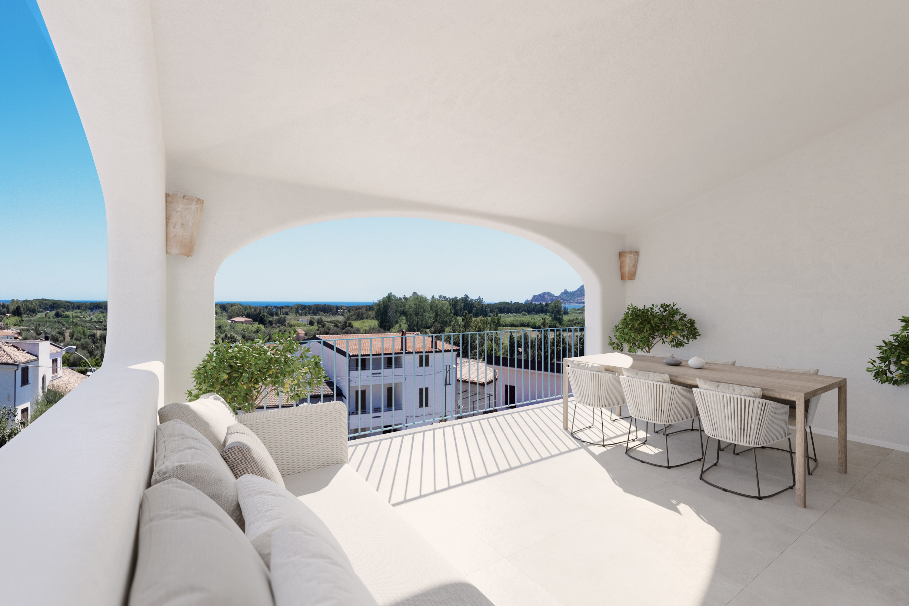 Das Penthouse im 2. Stock ist über einen eleganten Treppenaufgang erreichbar. Es umfasst einen großzügigen Wohnbereich mit offener Küche, zwei Doppelschlafzimmer – eines davon mit französischem Balkon – sowie zwei Badezimmer mit geräumigen Duschen und Fenstern, ergänzt durch einen Abstellraum. Die weitläufige, überdachte Panoramaterrasse lädt zum entspannten Essen, Relaxen oder auch zum digitalen Arbeiten ein und bietet dabei einen atemberaubenden Ausblick auf die Berge und das Meer mit den Inselchen der Ogliastra.