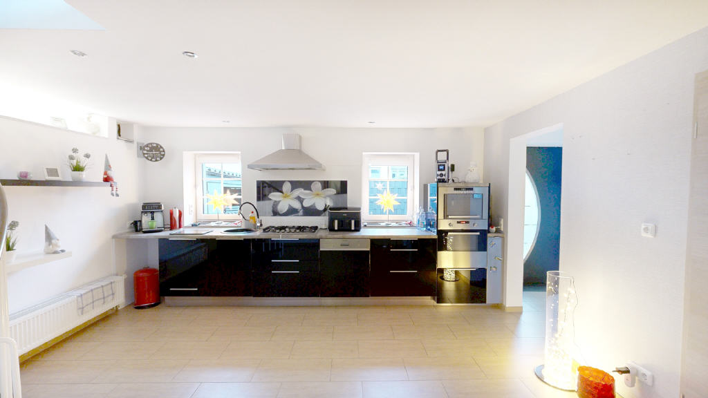 Das tagesbelichtete und einladende Entrée des Hauses führt in den großzügigen und offen gestalteten Wohnbereich. Die maßangefertigte Einbauküche präsentiert sich hier direkt als erstes Highlight. Funktional und mit viel Stauraum konzipiert fügt diese sich nahtlos in das Wohnkonzept ein.