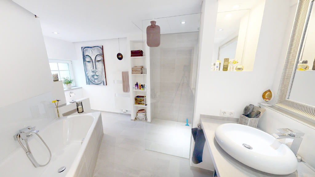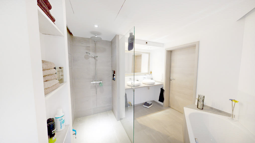 Ein Doppelwaschtisch, eine verglaste Walk-In Dusche, eine Badewanne, ein Handtuchheizkörper und ein WC beschreiben die geschmackvolle und hochwertige Ausstattung.