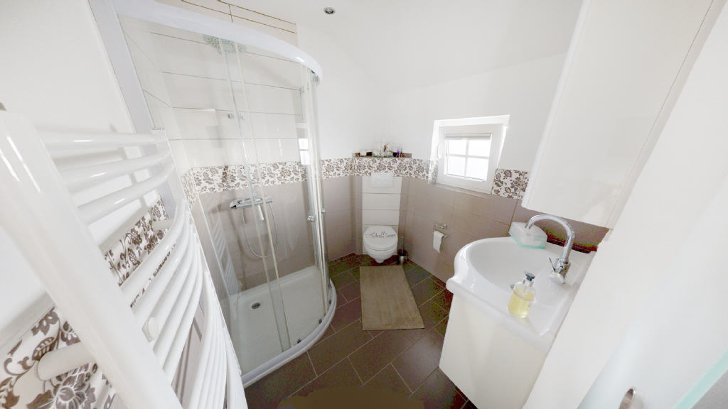 Das tagesbelichtete Badezimmer verfügt über eine Dusche, einen Handtuchheizkörper, einen Waschtisch und ein WC. Ein Fenster sorgt für eine ideale Belichtungs- und Belüftungsmöglichkeit.