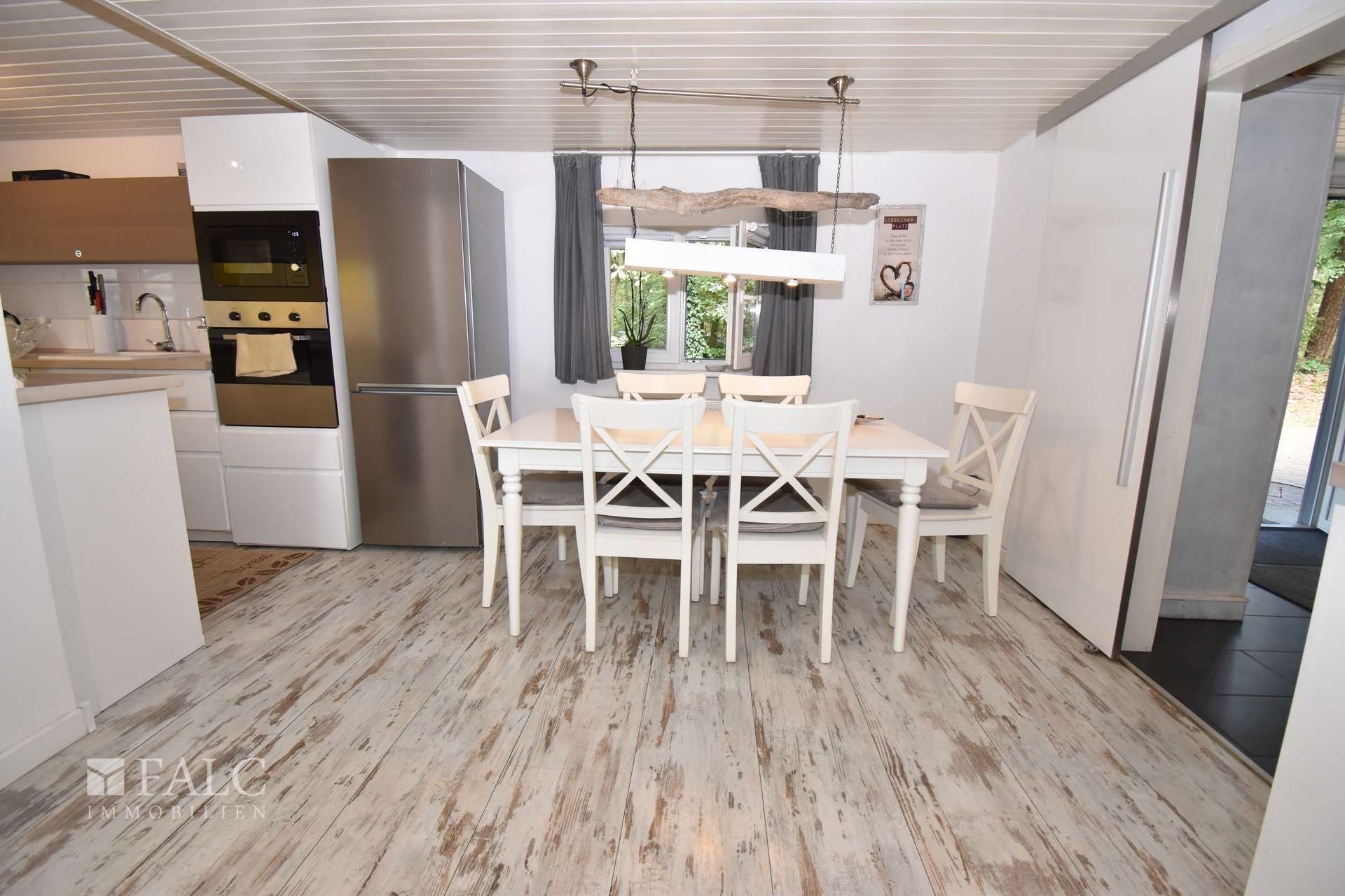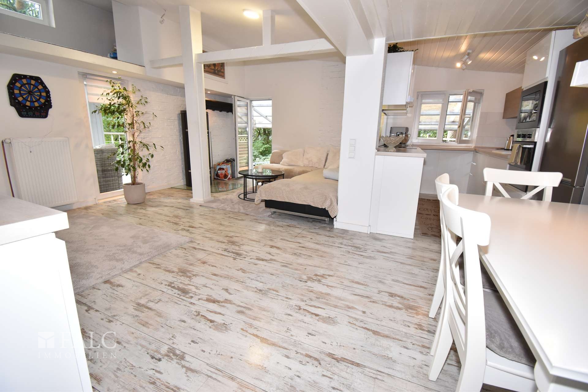 Das Herzstück dieses Objekts inmitten der Natur bildet das großzügig geschnittene, offene Wohnzimmer mit direktem Anschluss an die moderne Küche und Zugang zu zwei Terrassen. Durch die offen gestalteten Räume bleibt man jederzeit in Kontakt mit Familie und Freunden. Ein großer Esstisch, eine gemütliche Wohnlandschaft und ein hochwertiger Kamin schaffen idealen Raum für gemütliches Beisammensein. Die vorhandenen Schiebetüren sind praktisch und platzsparend.