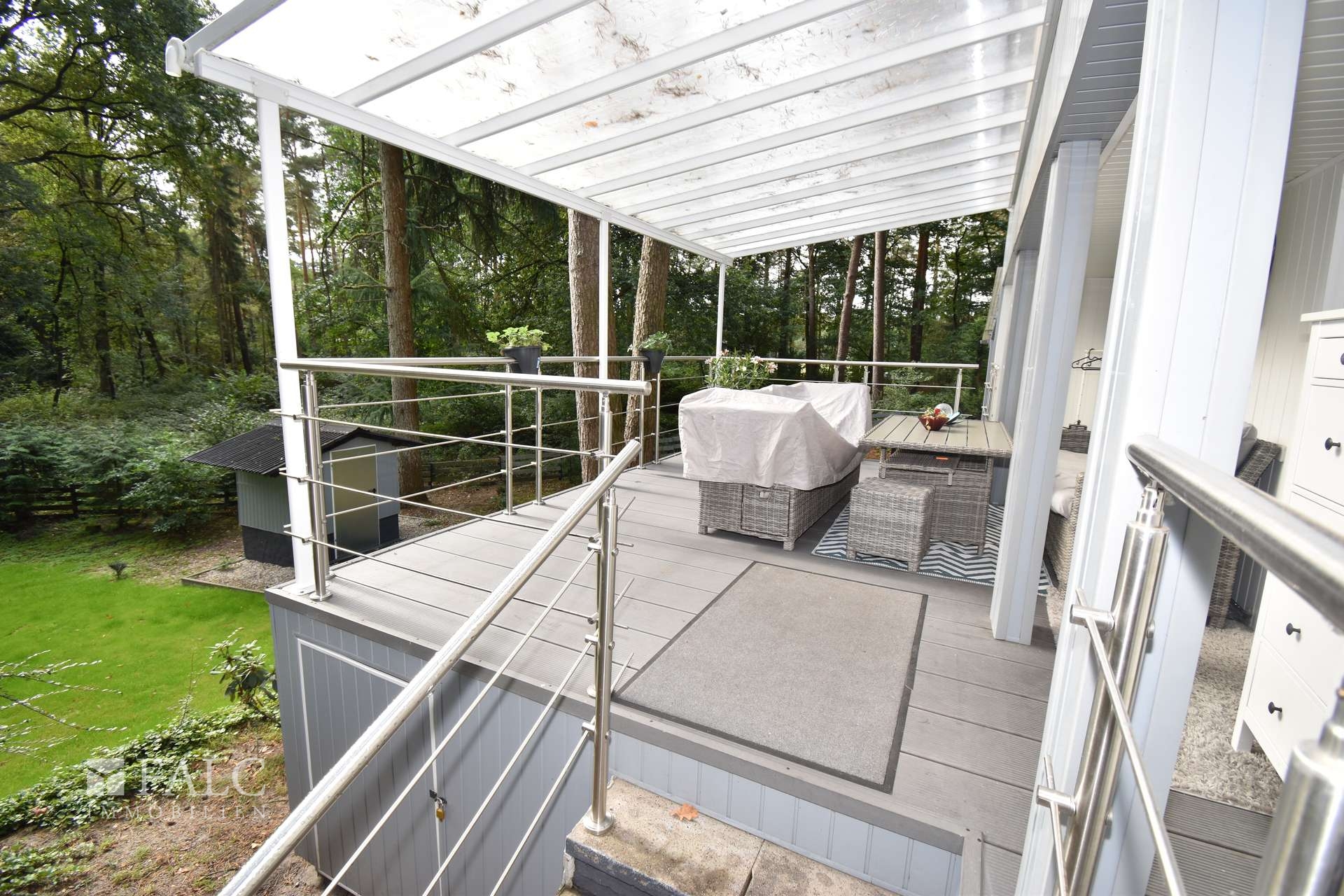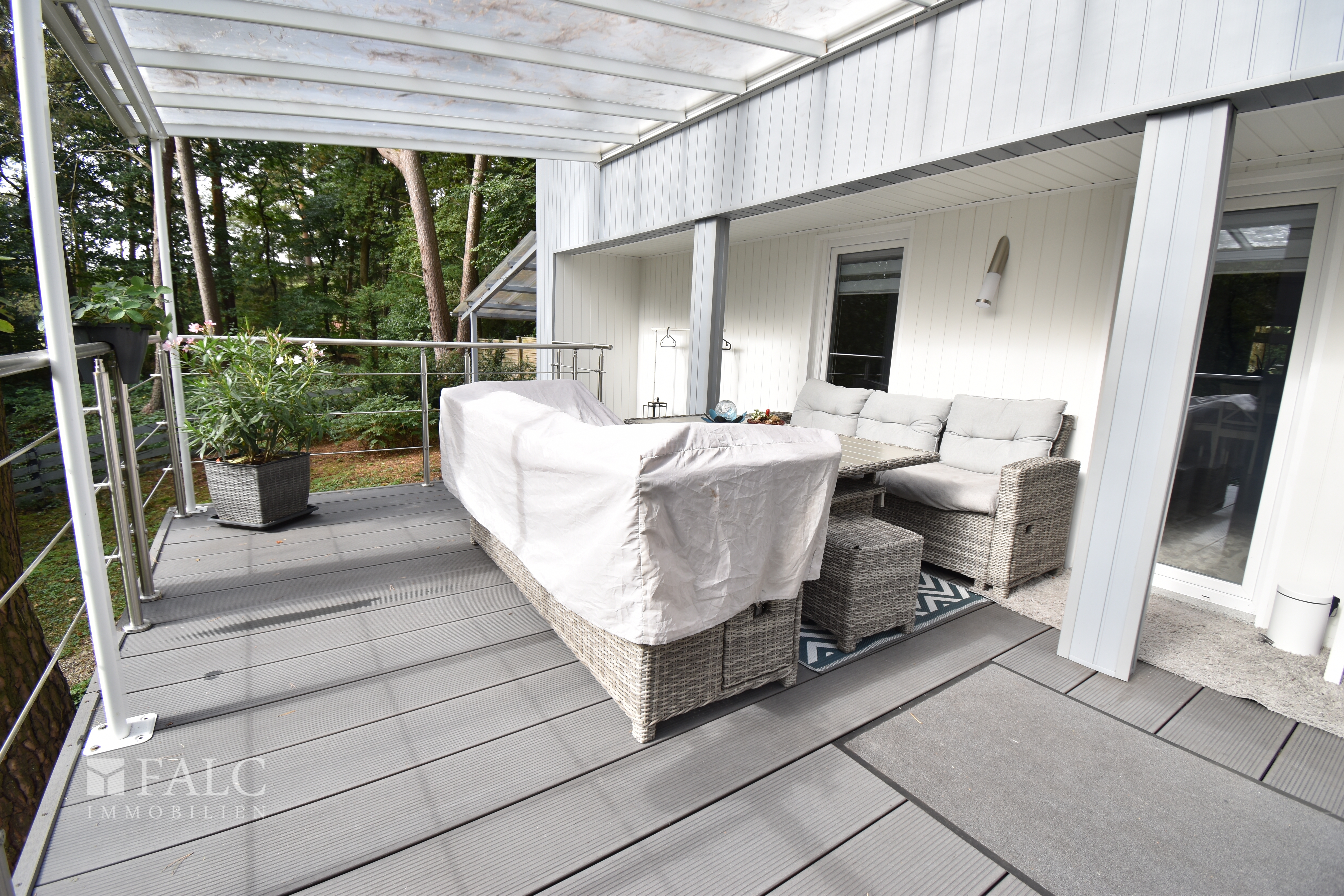 Die großzügige Gartenfläche bietet vielfältige Gestaltungsmöglichkeiten. Zwei große, überdachte Terrassen hinter dem Haus laden zum Genießen der Ferienzeit ein.
