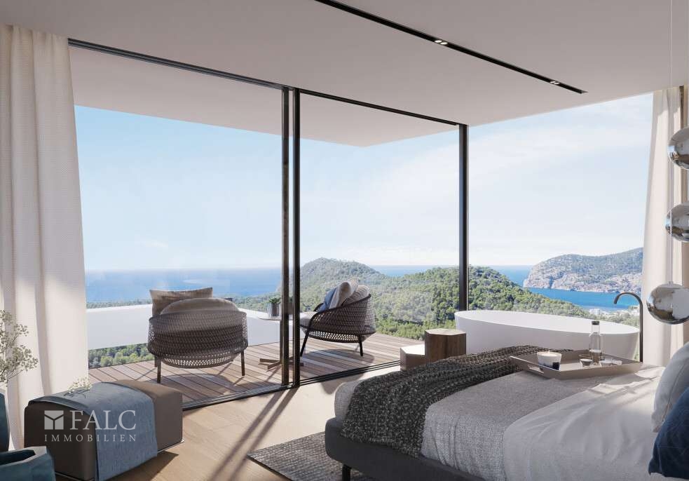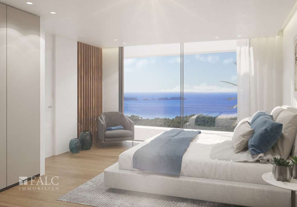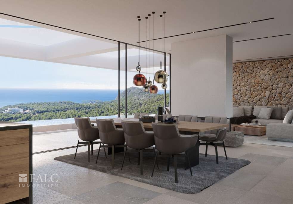Diese einzigartige Neubau-Villa in Paguera mit traumhaftem Meerblick auf die Bucht von Camp de Mar und Paguera befindet sich in bester Lage, umgeben von wunderschönen Pinienwäldern und exklusiven Immobilien. Die luxuriös möblierte und hochwertig ausgestattete Immobilie bietet von fast jedem Zimmer aus einen herrlichen Blick auf das Meer und den familiären Ort Paguera. Die sonnige Villa mit südwestlicher Ausrichtung, Garage und Fahrstuhl wurde auf einem ca. 1.085 m2 grossen Grundstück nach höchsten Qualitätsstandards gebaut und bietet eine geräumige bebaute Fläche von ca. 610 m2, die sich auf 2 lichtdurchfluteten Etagen und einen Kellerbereich mit unzähligen Verwendungsmöglichkeiten folgendermassen verteilt: Das obere Geschoss umfasst den eleganten Eingangsbereich, die Master-Suite mit Bad en Suite, sowie 2 weitere Schlafzimmer mit Bad en Suite, alle Zimmer mit eigenem Terrassenzugang und spektakulärem Meerblick. Das Erdgeschoss bietet ein tolles Wohnzimmer mit Kamin und eine offene Designerküche mit Haushaltsgeräten der Marken Bora und Gaggenau, eine Bodega, Esszimmer, Hauswirtschaftsraum, Gäste-WC, sowie ein Schlafzimmer mit Bad en suite. Von dieser Etage aus gelangt man auf die einzigartige Terrasse mit Infinity-Swimmingpool, Aussenküche und Aussendusche. Der Kellerbereich ist frei gestaltbar und bietet neben einem Technikraum, Hauswirtschafts- und Abstellraum, Platz für ein weiteres Schlaf- oder Personalzimmer. Tolle Golfplätze, schöne Strände und Buchten, Einkaufsmöglichkeiten und exklusive Yachthäfen sind nur wenige Autominuten entfernt.