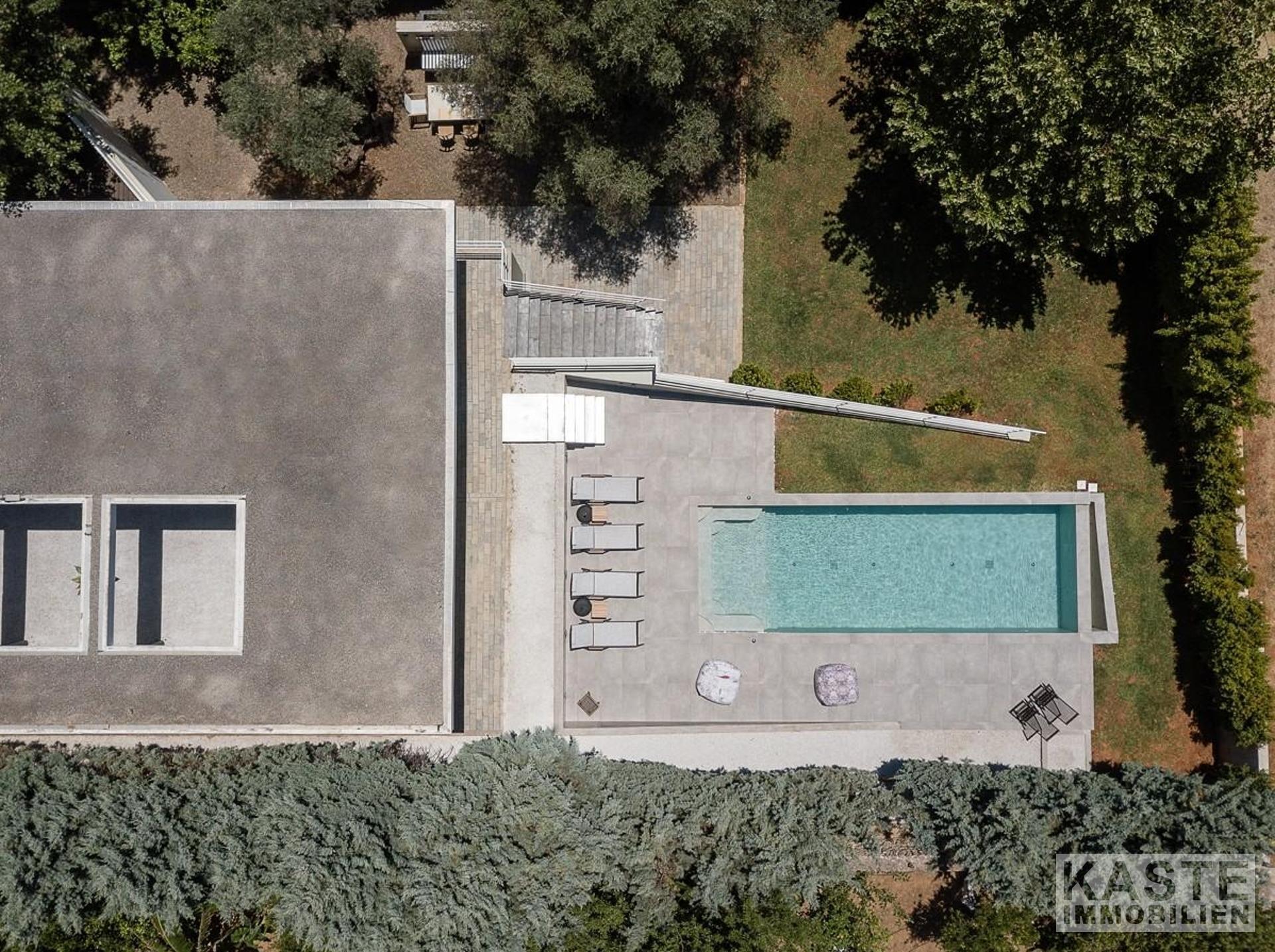 Ein zentrales Merkmal der Villa ist der beheizte Öko-Pool mit Hydromassagefunktion, der sich harmonisch in den weitläufig angelegten und vollständig bepflanzten Garten einfügt. Die angrenzende Liegewiese, majestätische Oliven- und Zitronenbäume, sowie angelegte gepflegte Wege und imposante Säulen schaffen eine Oase der Ruhe und Privatsphäre. Mehrere einladende Sitz- und Essbereiche im Freien ermöglichen entspannte Stunden unter Freunden und Familie, abgeschirmt und von der Natur umgeben.
