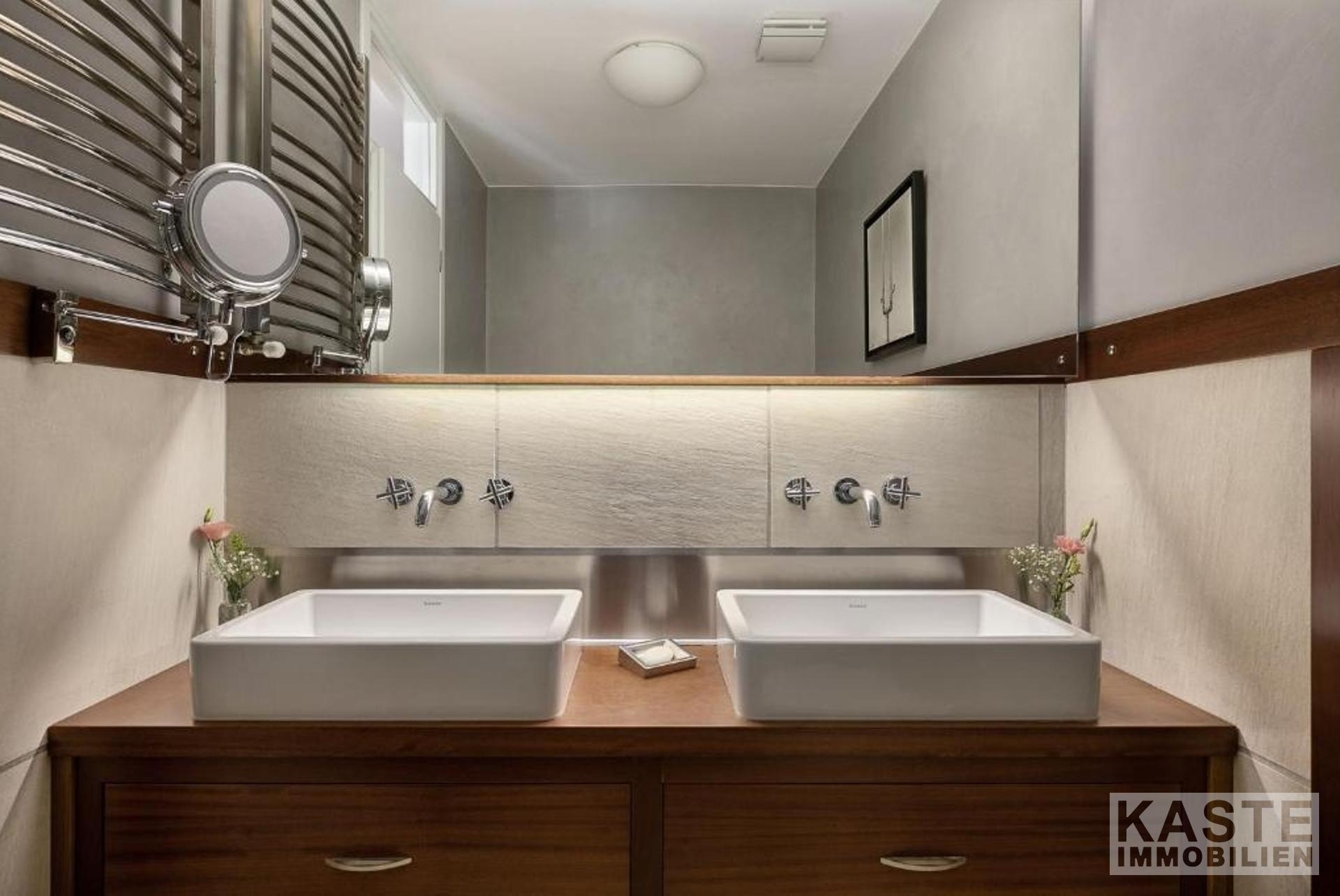 Das Interieur besteht aus fünf Schlafzimmern und drei luxuriös ausgestatteten Badezimmern sowie einem Büro, perfekt geeignet für anspruchsvolle Familien oder professionelle Home-Office-Lösungen. Ein Highlight ist das lichtdurchflutete Wohn- und Essareal mit einem stimmungsvollen Kamin, das fließend in die modern ausgestattete Einbauküche mit breitem Zugang zum außenliegenden Terrassen- und Gartenbereich übergeht. Die Verwendung von hochwertigen Holzböden und eleganten Möbeln vermittelt ein warmes und stilvolles Ambiente.
