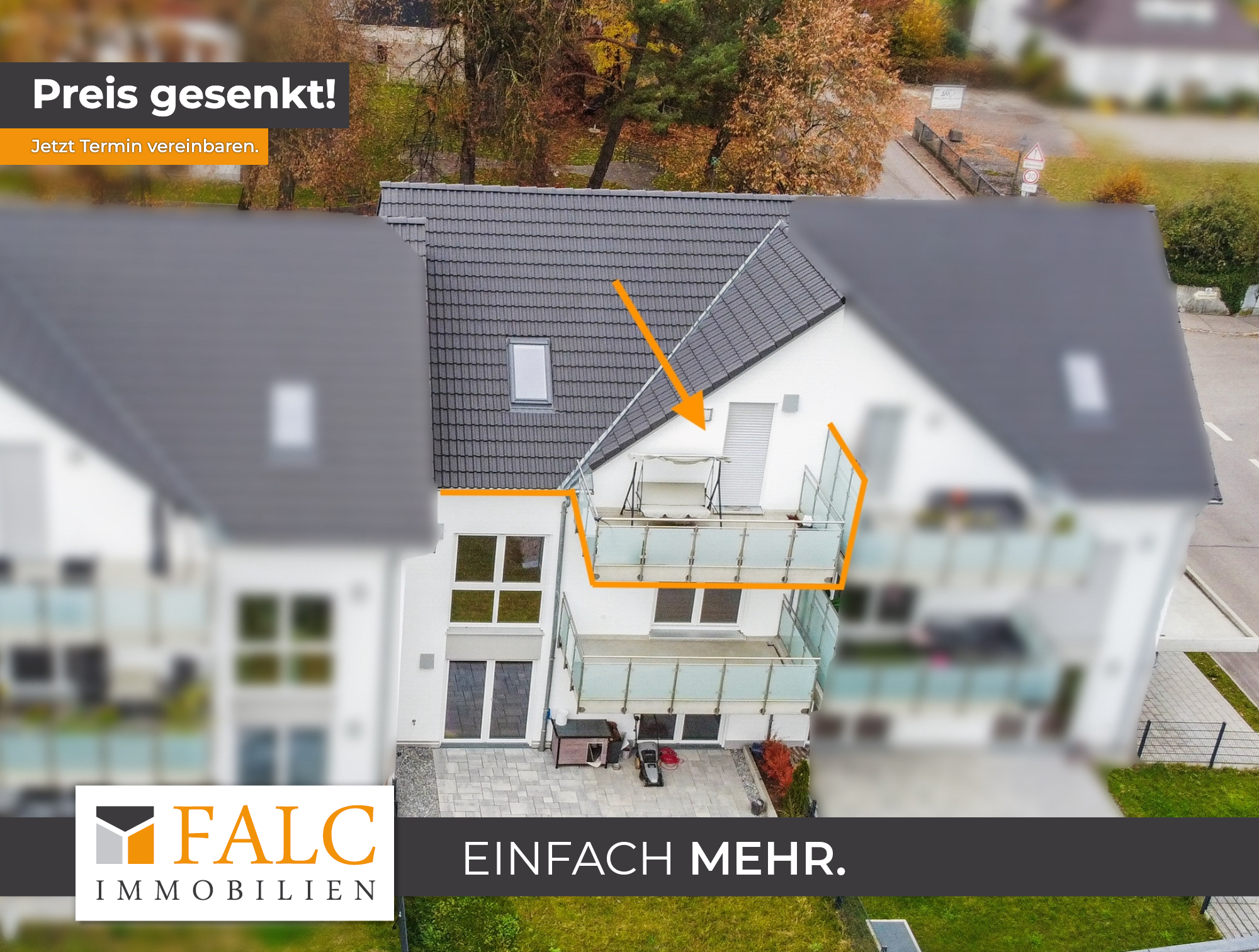 DrohnenansichtDrohneDrohnenansicht EingangWohnbereichKücheKüche mit Blick WohnbereichBalkonSchlafzimmerEinrichtungsbeispiel SchlafzimmerBadBadTreppenhausAufzugAnsicht EingangAußenansichtGrundriss DGKellergeschossAußenansicht mit Markierung DG
