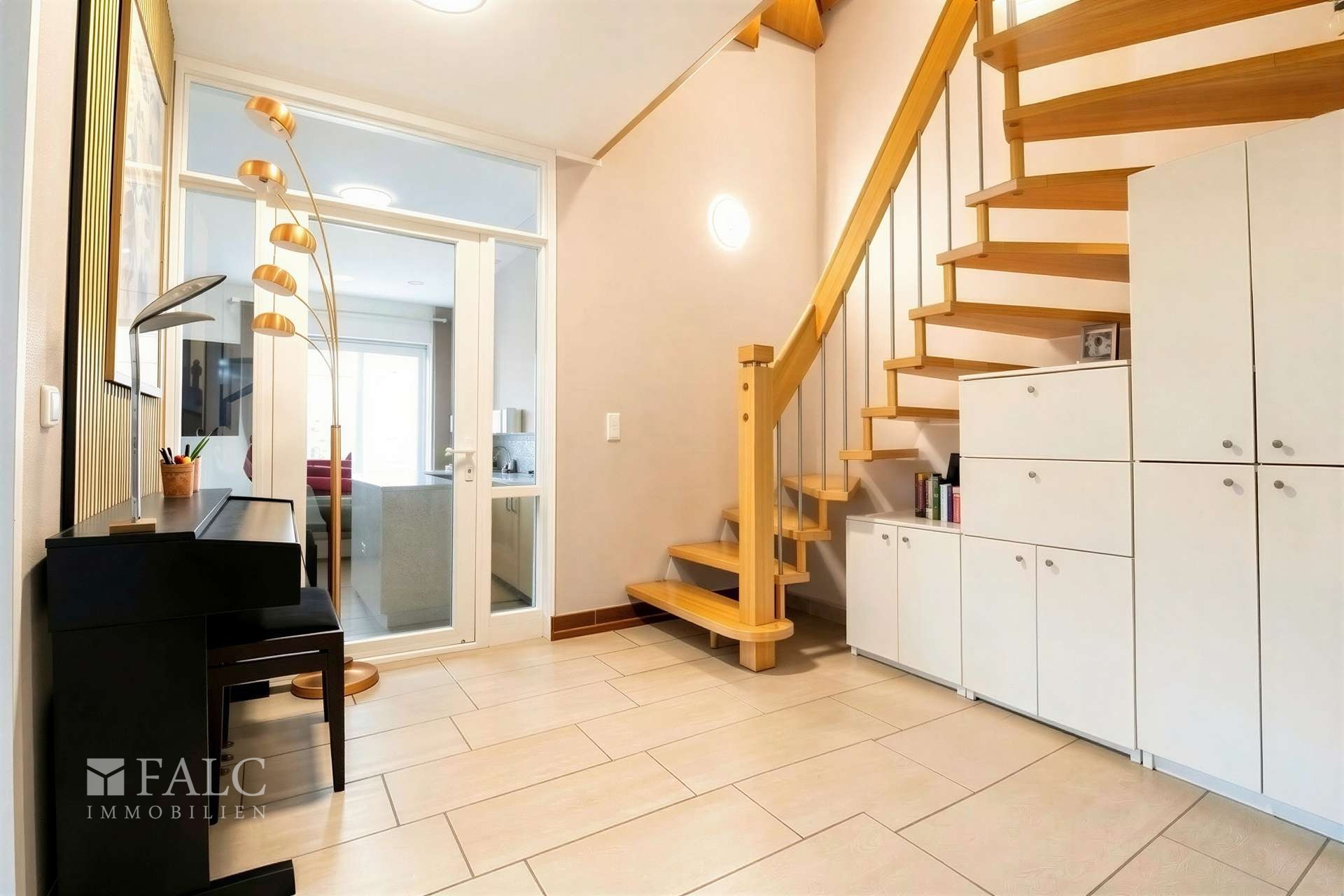 Das Erdgeschoss: Licht, Weite und Wärme Schon beim Eintreten wird der besondere Charakter deutlich: Der großzügige Eingangsbereich führt direkt in das Herzstück des Hauses. Das gesamte Erdgeschoss ist mit einer hochwertigen Fußbodenheizung ausgestattet, die unter den Füßen für ein angenehmes Barfuß-Gefühl und im Raum für eine behagliche, unsichtbare Wärme sorgt.