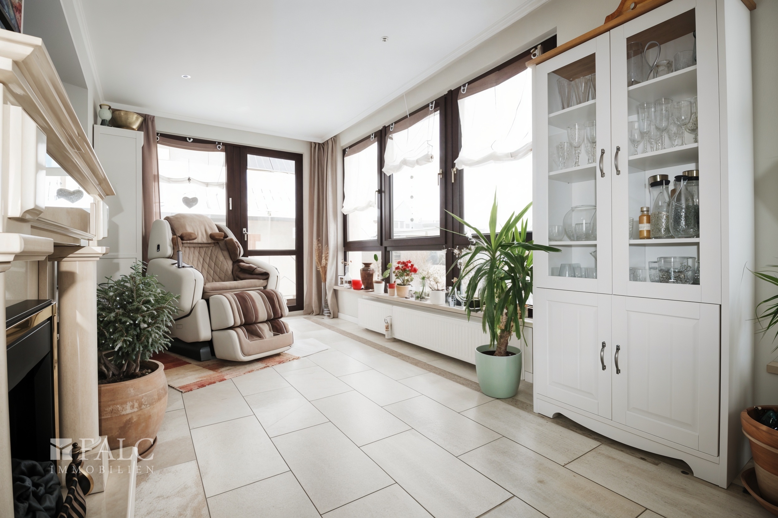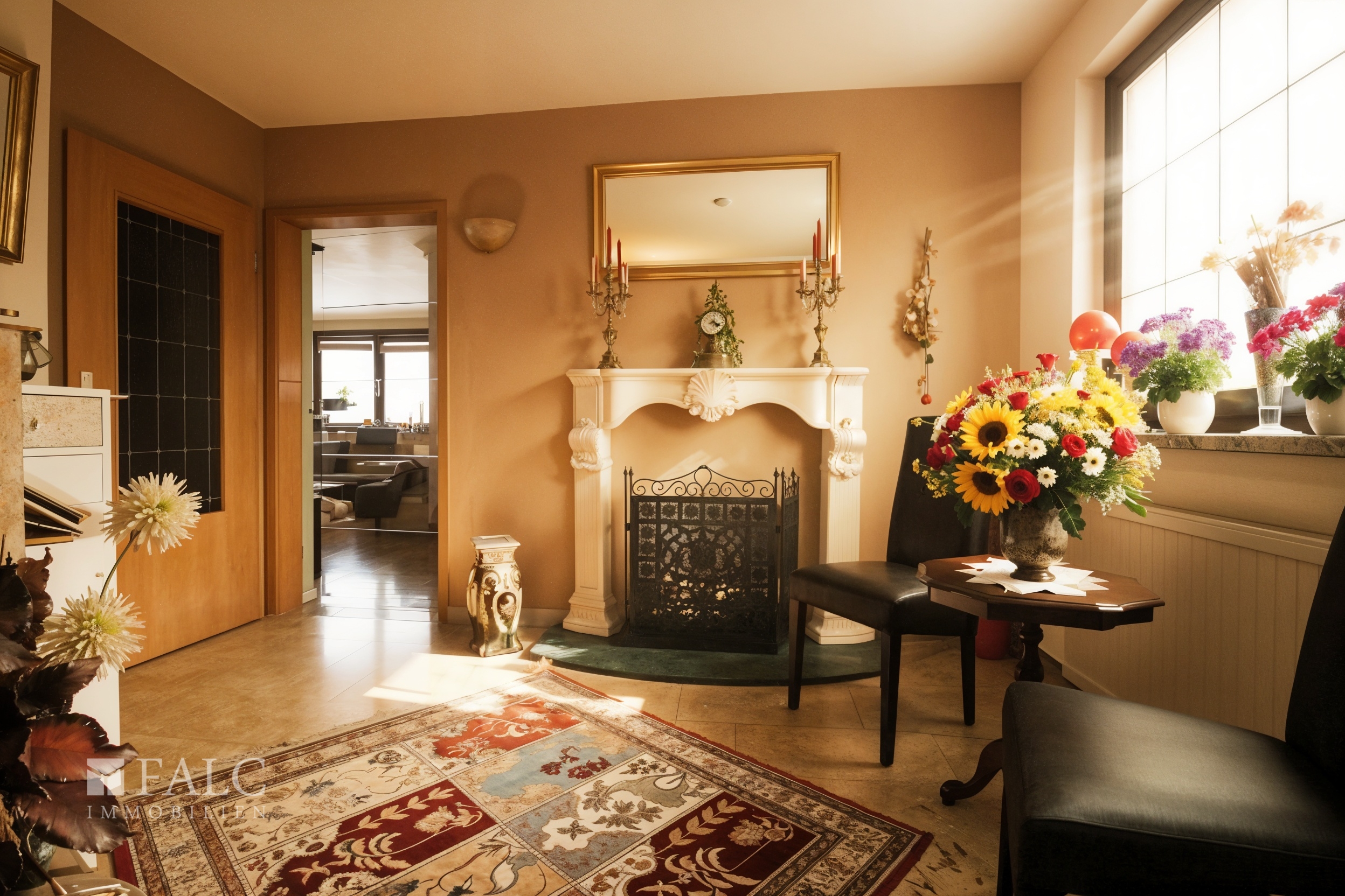 Die separat angelegte Küche liegt in kurzer Entfernung zum Essbereich, sodass gemeinsames Kochen und geselliges Beisammensein problemlos möglich sind. Über die Treppe des Eingangsbereichs erreichen Sie das Dachgeschoss: Hier befindet sich das großzügige Hauptschlafzimmer mit angeschlossenem Ankleidezimmer sowie ein weiteres Badezimmer. Ein flexibel nutzbarer Wohnraum bietet Platz für ein Arbeitszimmer oder eine gemütliche Leseecke.