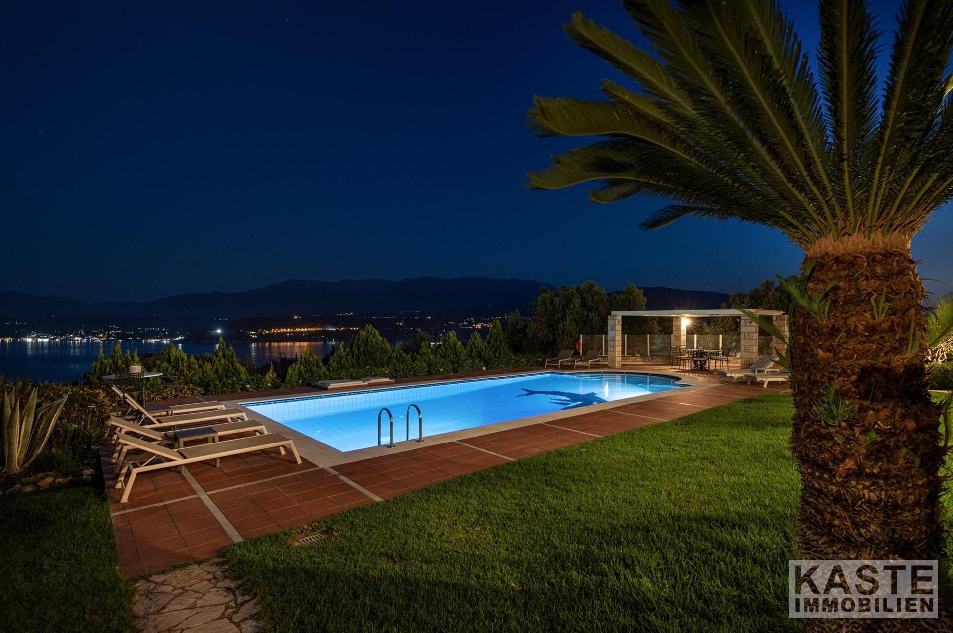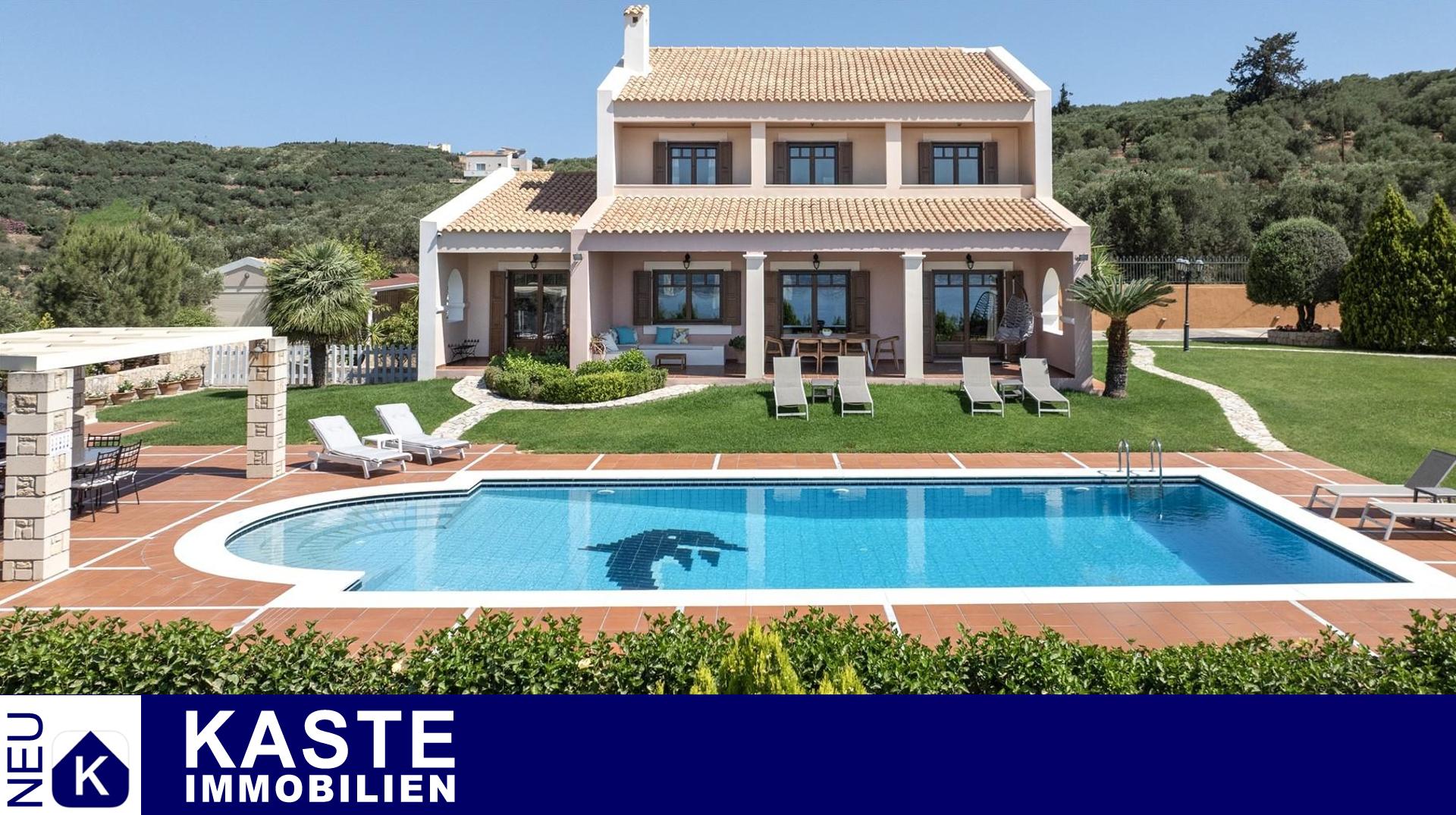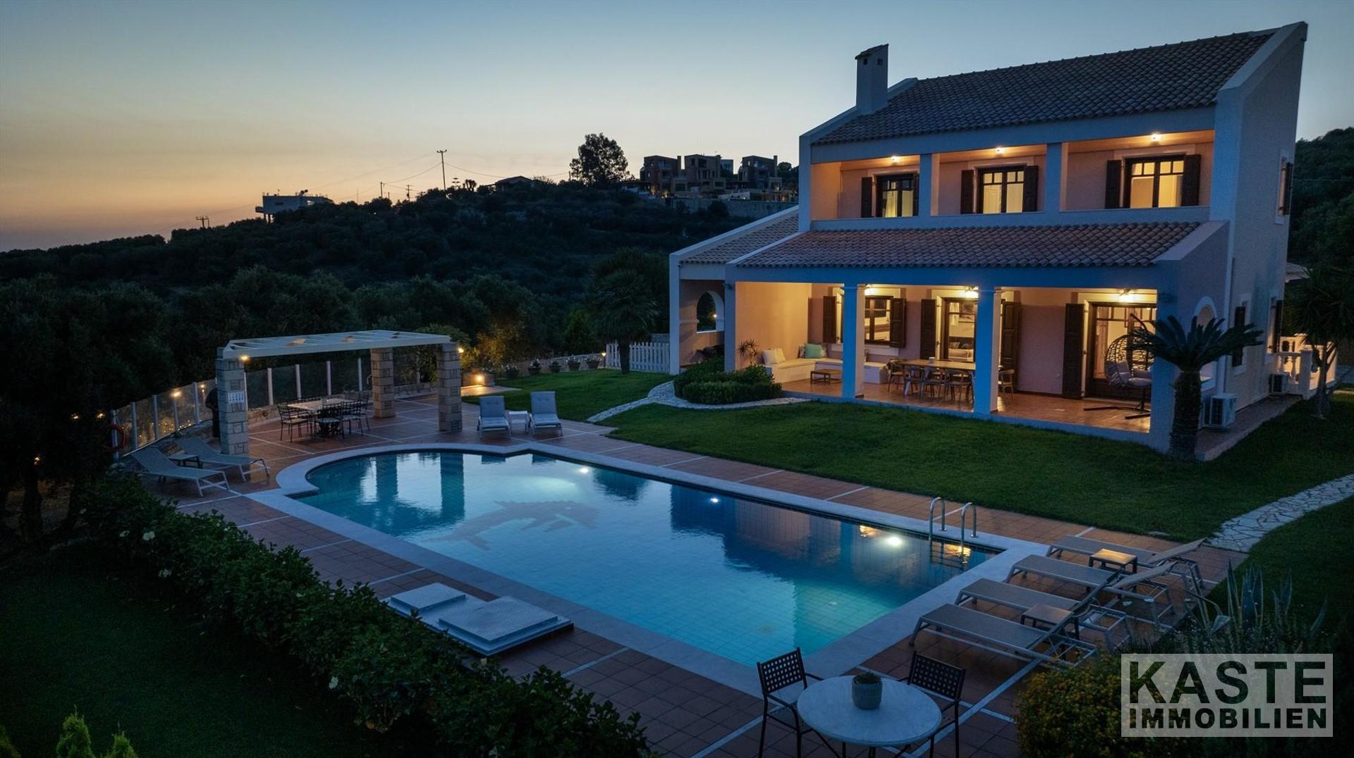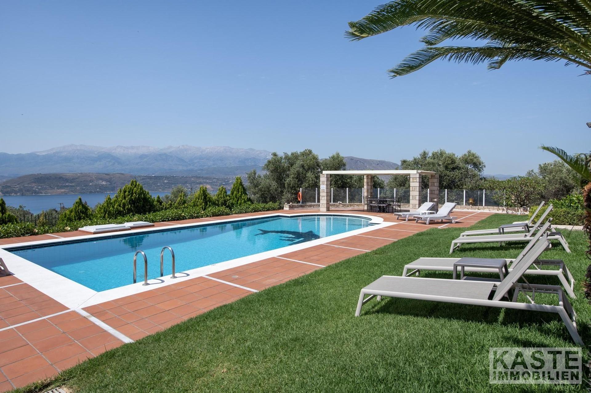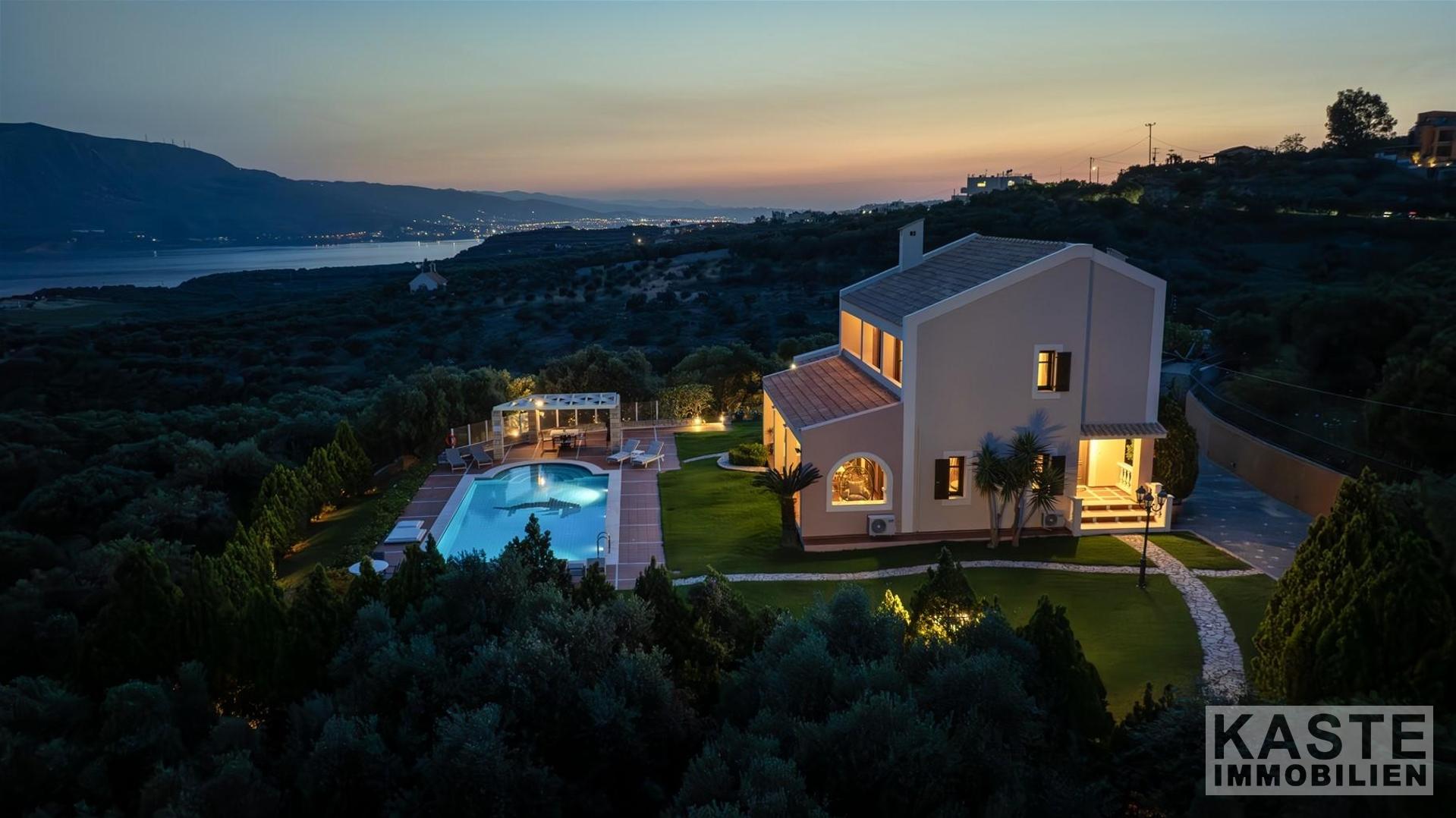 Diese beeindruckende Luxusvilla in Sternes, einem der begehrtesten Dörfer auf der malerischen Halbinsel Akrotiri, bietet Ihnen auf Kreta ein unvergleichliches Wohngefühl verbunden mit spektakulären Panoramablicken auf die Bucht von Souda und die majestätischen Weißen Berge. Die großzügige Immobilie mit einer Wohnfläche von 343 m² erstreckt sich über eine weitläufige Konzeption mit 5 eleganten Schlafzimmern und 3 modernen Badezimmern, ideal für Familien und Liebhaber exklusiven Komforts.