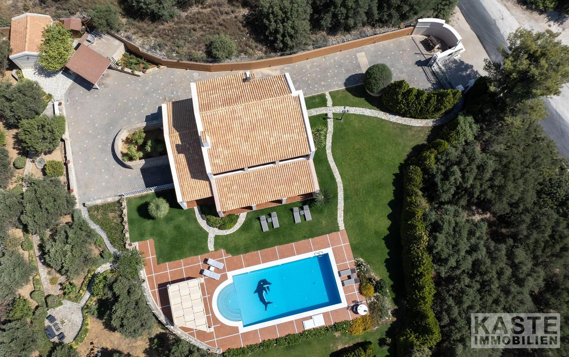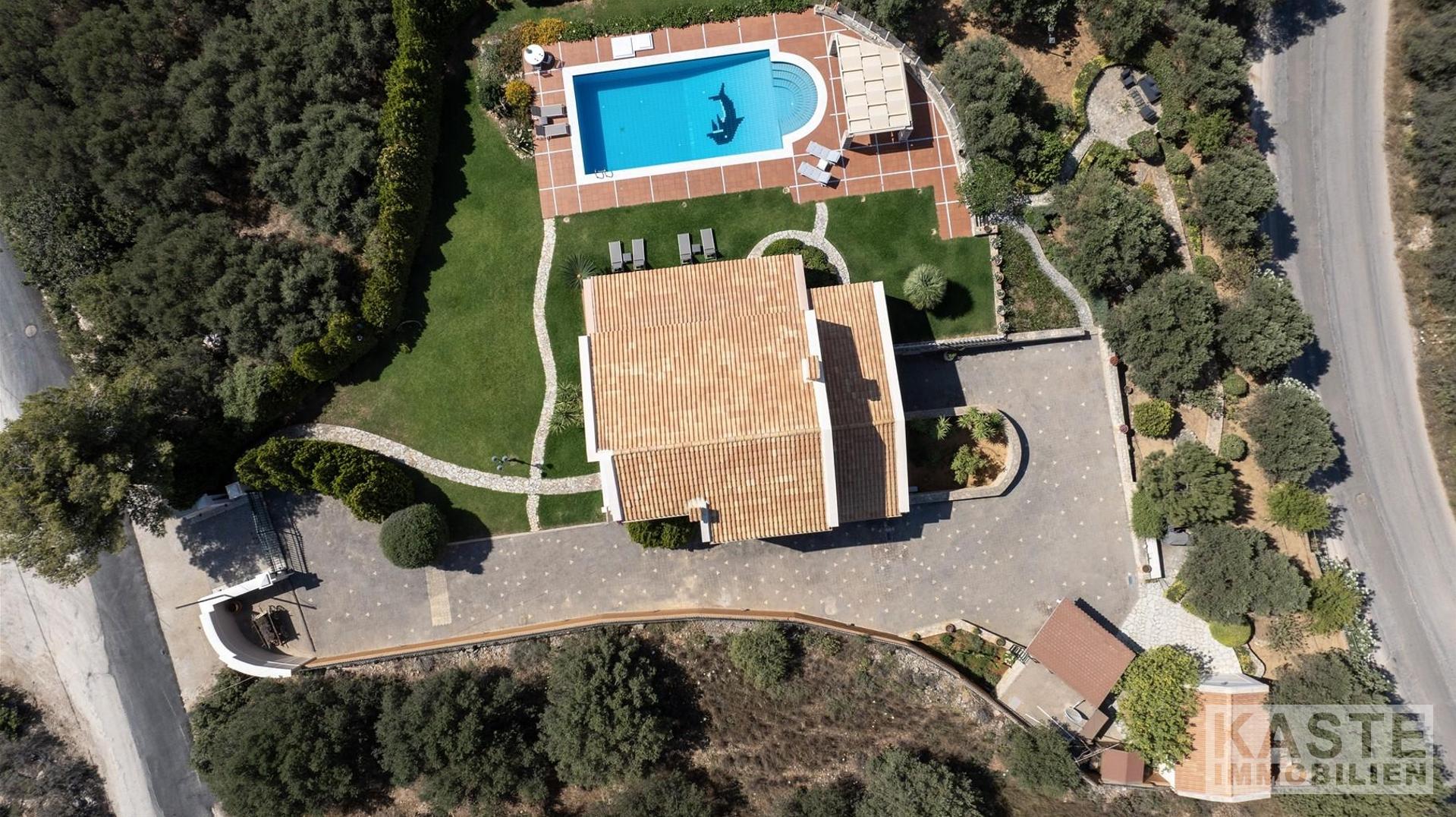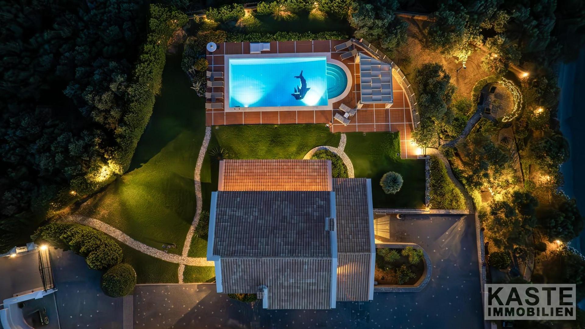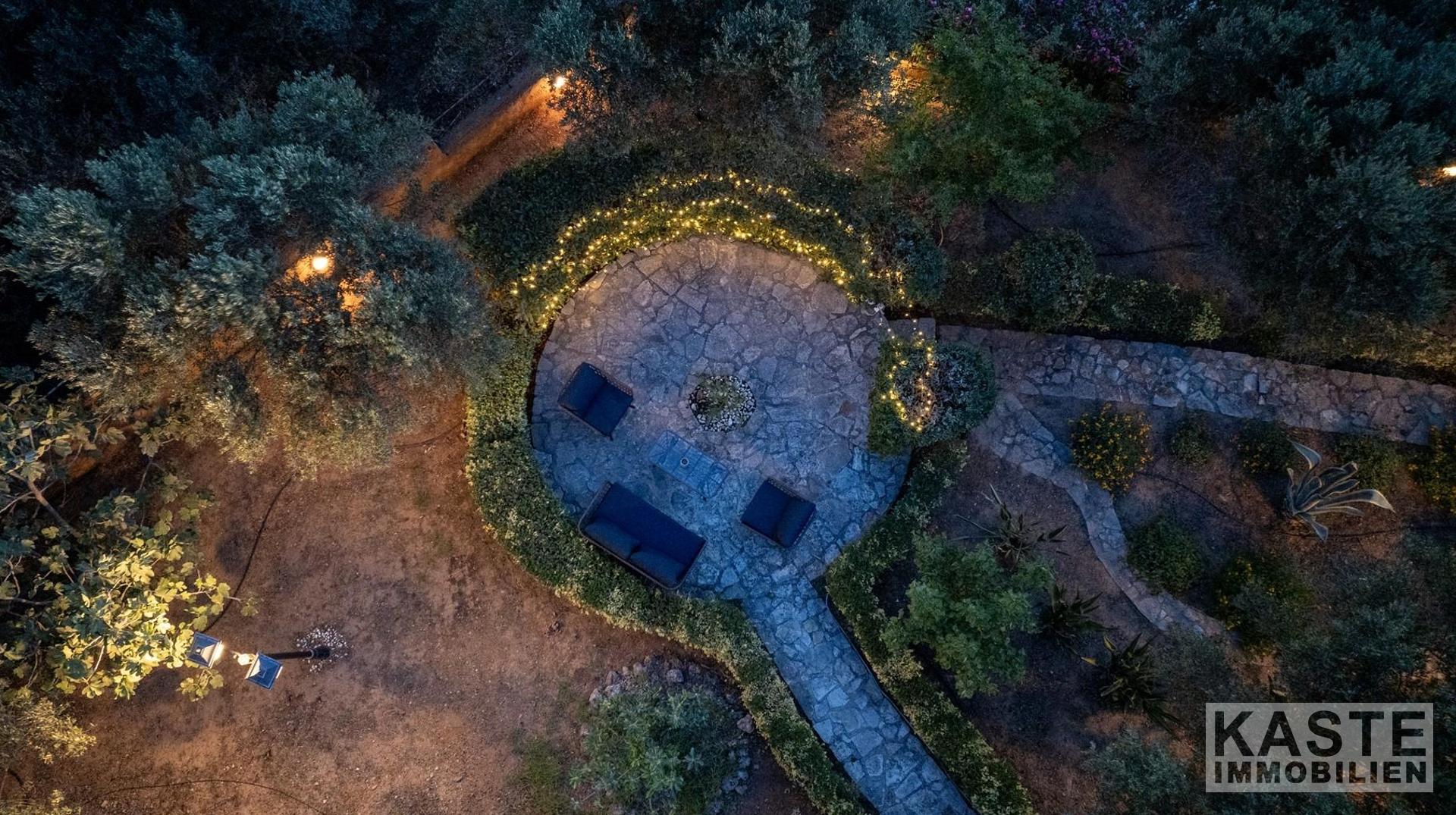 Das Anwesen residiert auf einem eindrucksvollen 3800 m² großen Privatgrundstück, das zusätzlich mit einem gepflegten Olivenhain geschmückt ist und umgeben ist von üppigen, landschaftlich angelegten Gärten. Ein besonderes Highlight ist der 70 m² große, geflieste Swimmingpool, der eingebettet in schattigen Bereichen zum Entspannen und Genießen der Natur einlädt. Zusätzlich bietet das Haus zwei lichtdurchflutete Galerien, komfortable Abstellräume, ein großzügiges Büro sowie inklusive eines offenen Kamins behagliche Aufenthaltsbereiche.