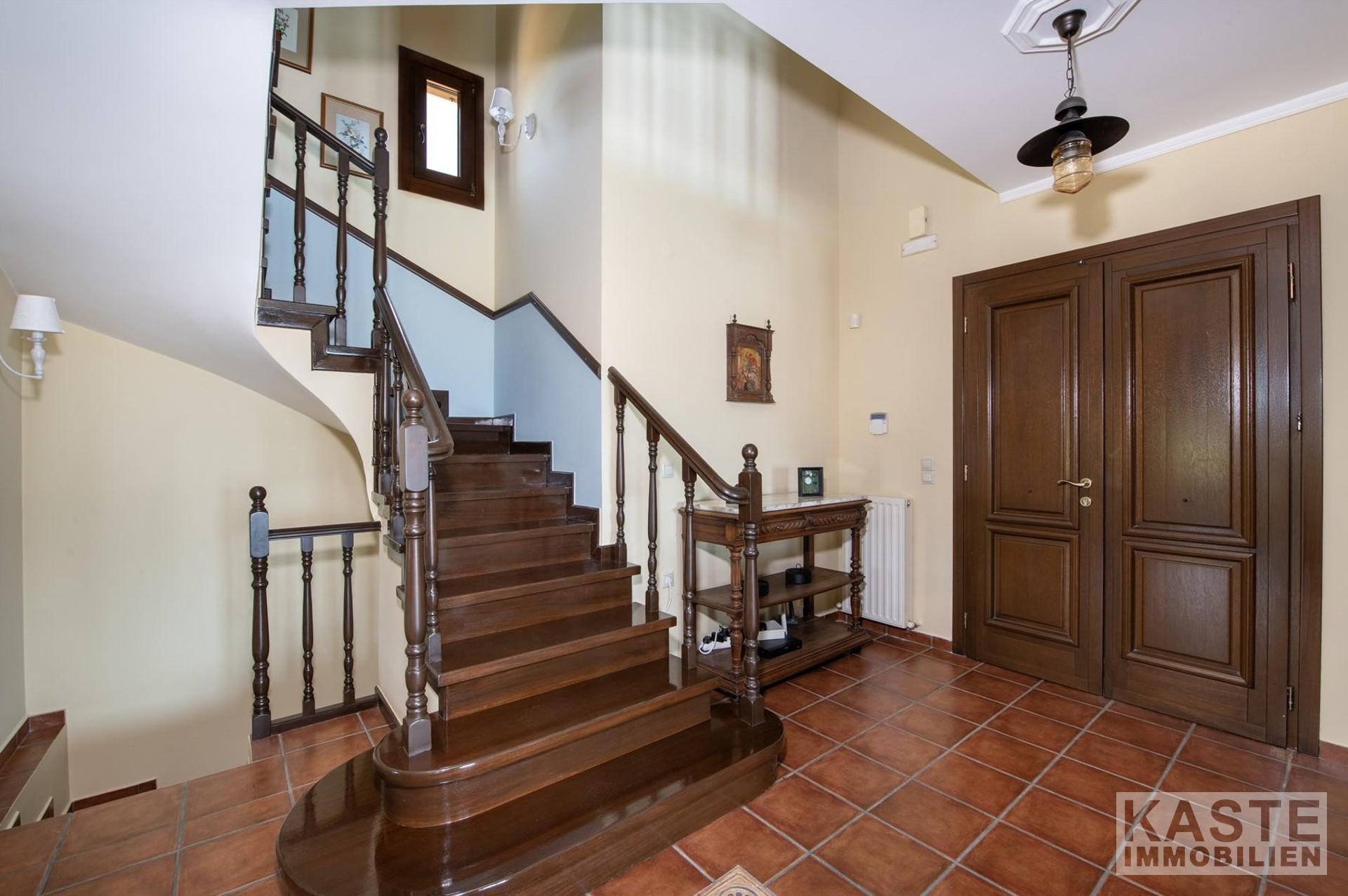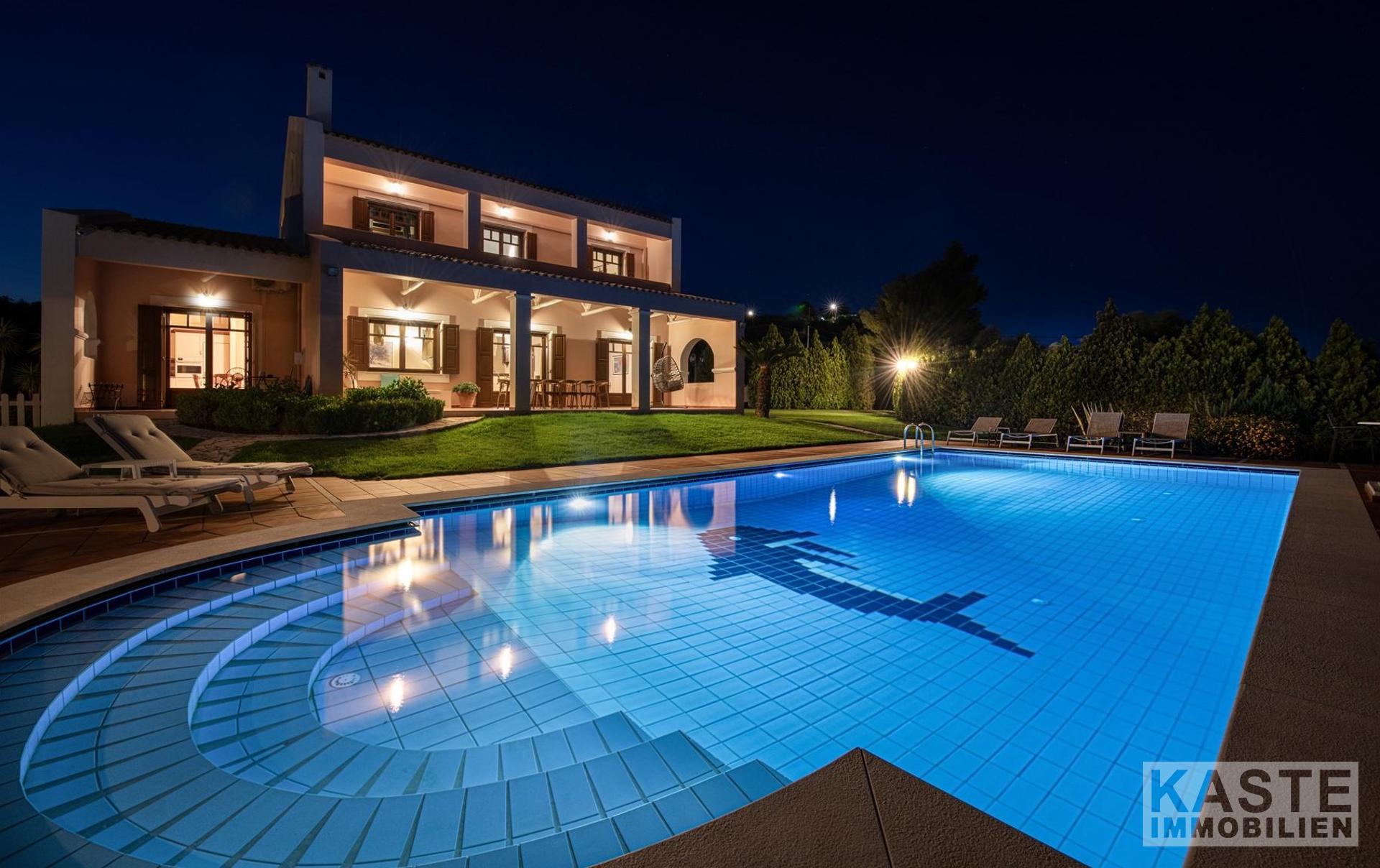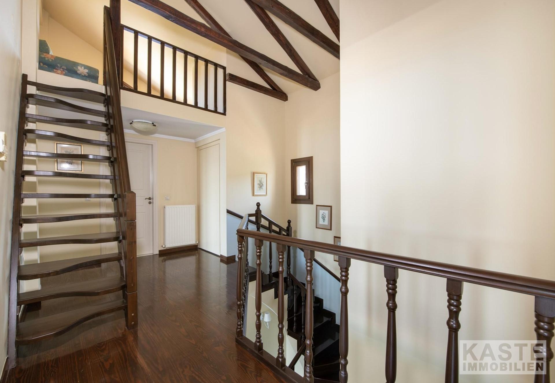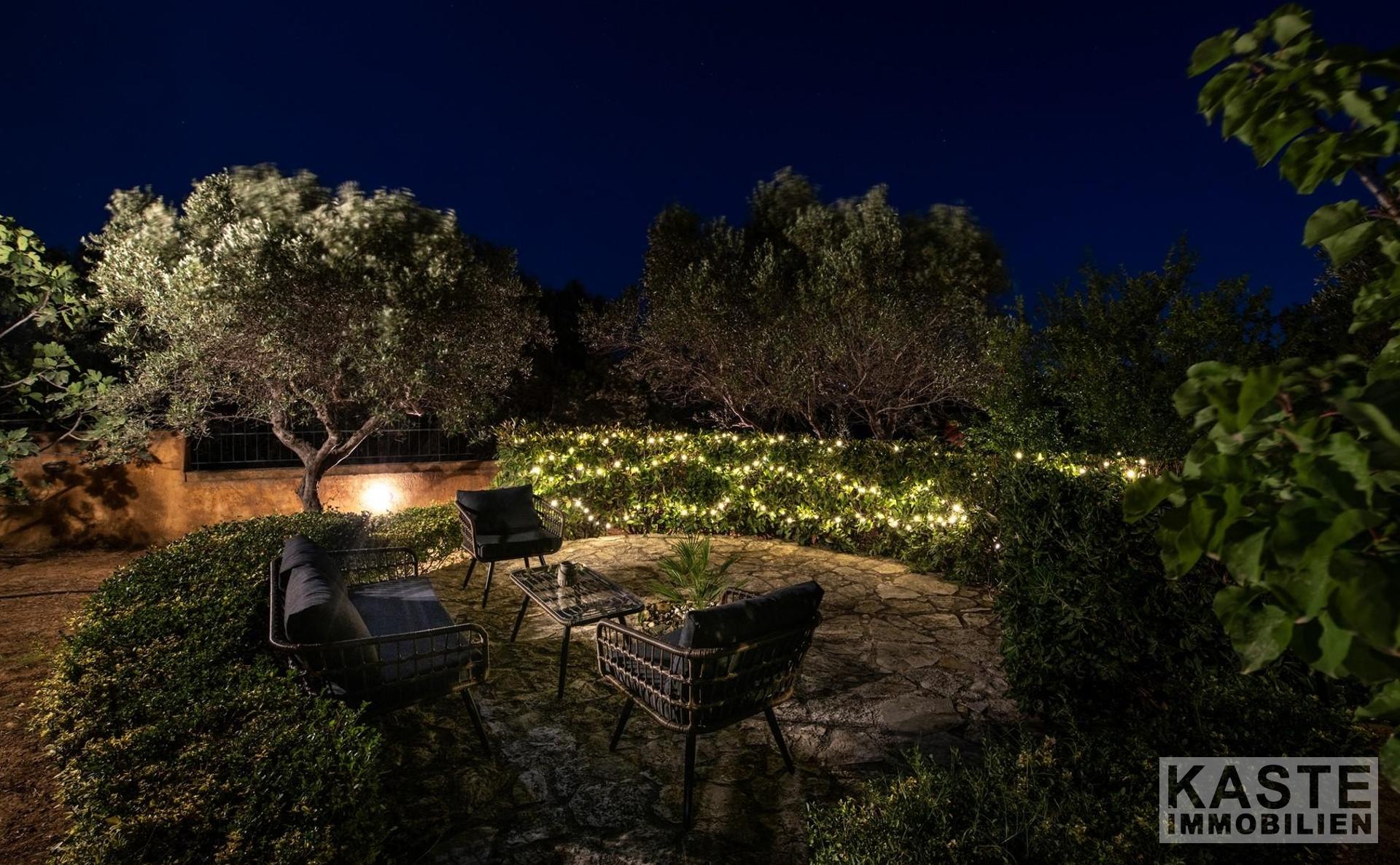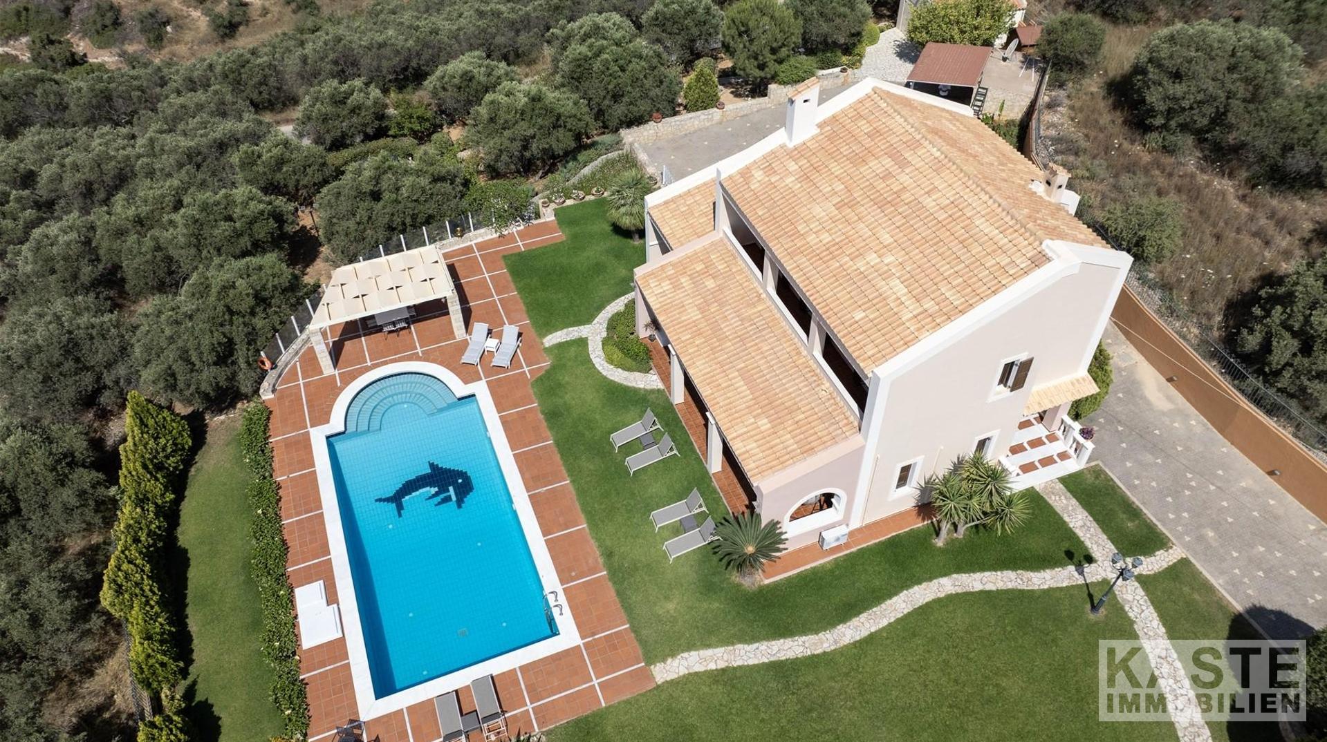 Das Anwesen residiert auf einem eindrucksvollen 3800 m² großen Privatgrundstück, das zusätzlich mit einem gepflegten Olivenhain geschmückt ist und umgeben ist von üppigen, landschaftlich angelegten Gärten. Ein besonderes Highlight ist der 70 m² große, geflieste Swimmingpool, der eingebettet in schattigen Bereichen zum Entspannen und Genießen der Natur einlädt. Zusätzlich bietet das Haus zwei lichtdurchflutete Galerien, komfortable Abstellräume, ein großzügiges Büro sowie inklusive eines offenen Kamins behagliche Aufenthaltsbereiche.