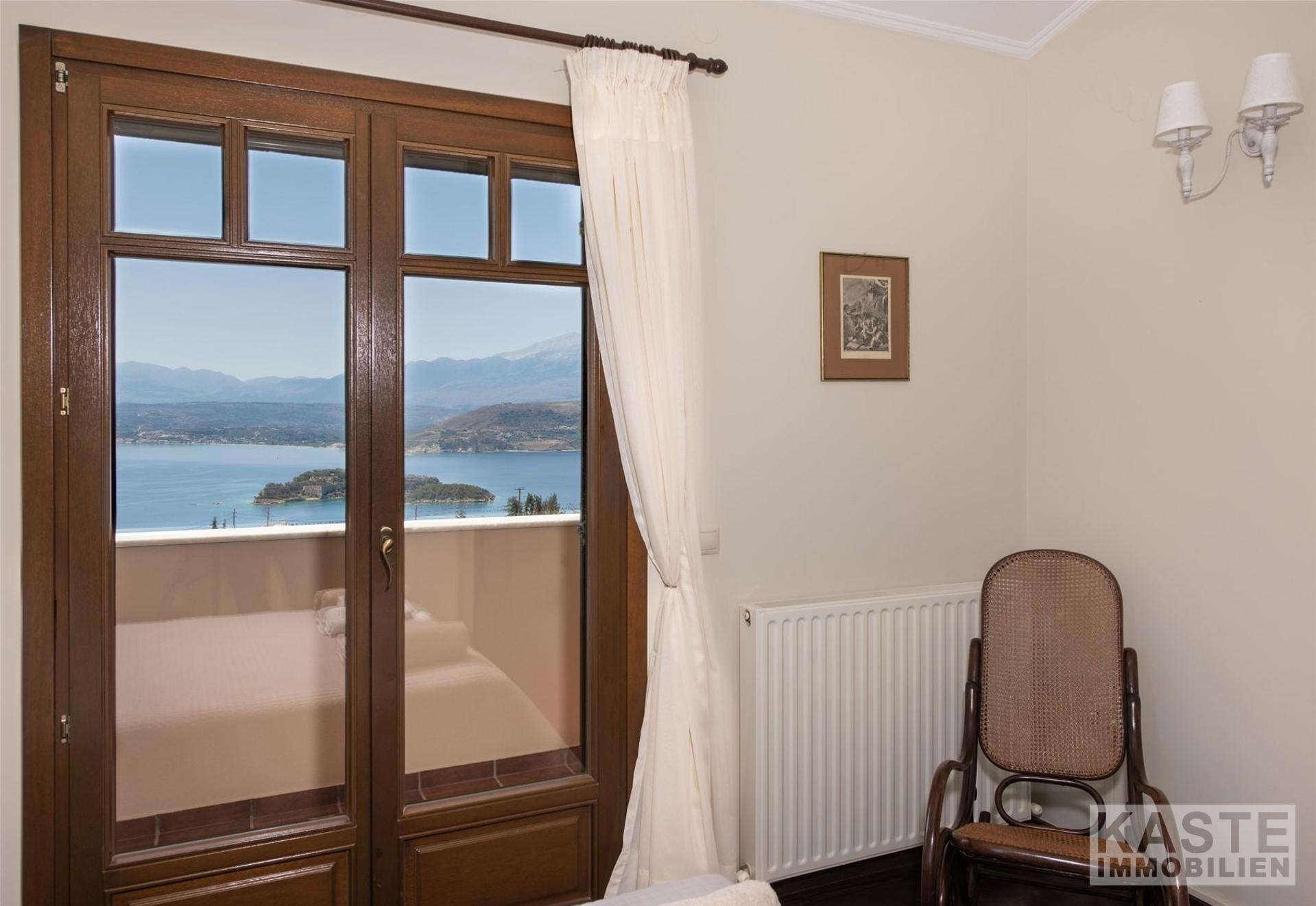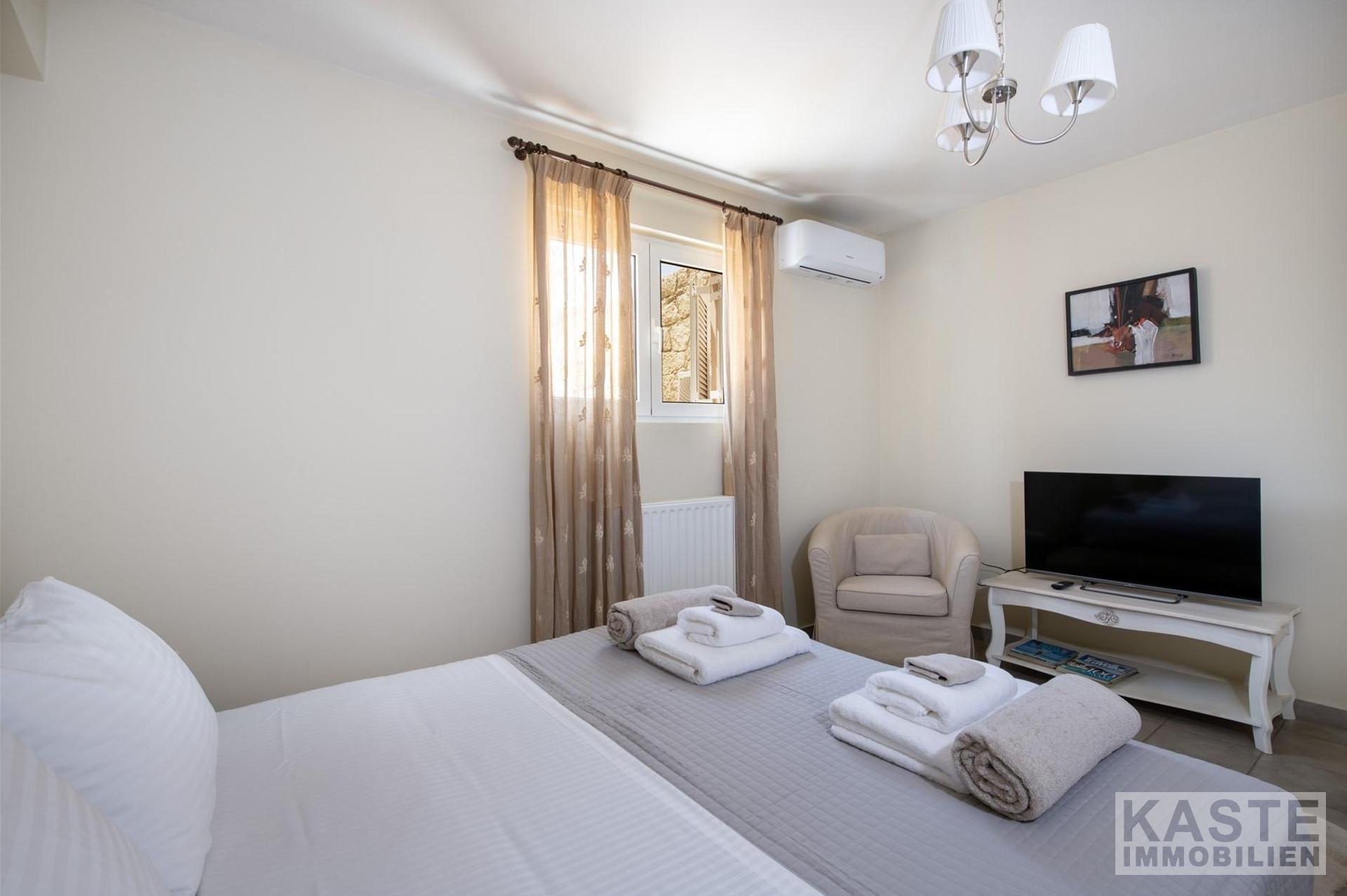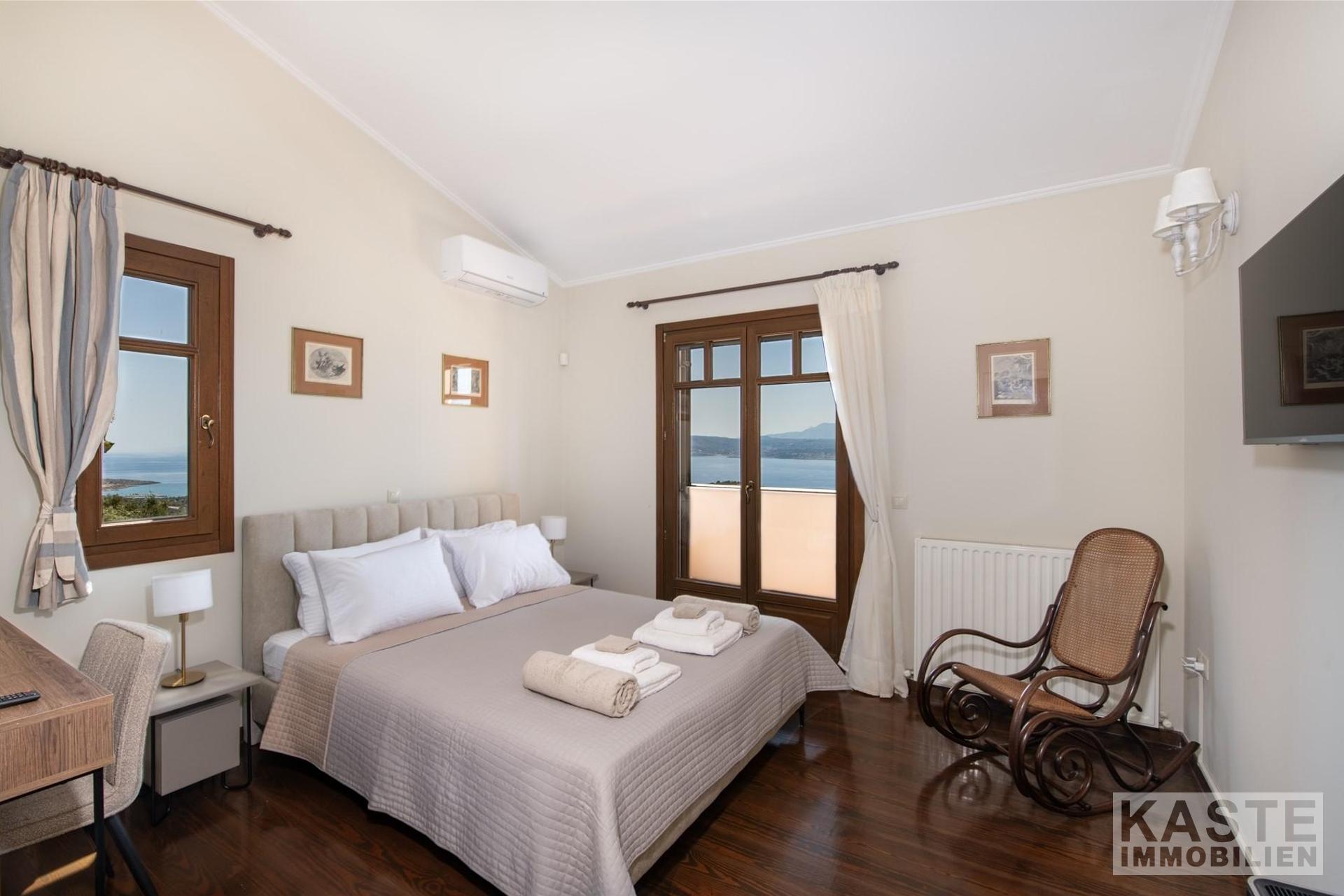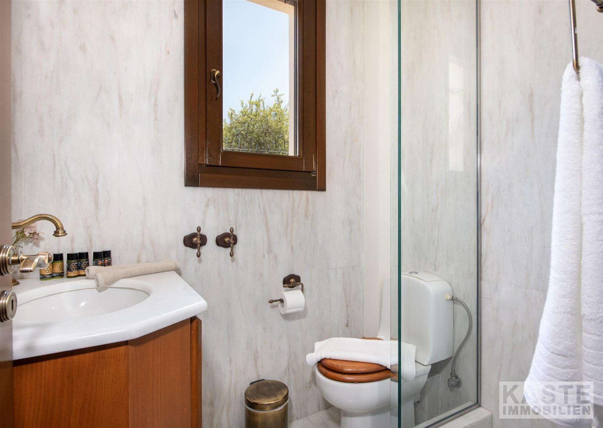 Mit seiner privilegierten Hanglage garantiert die Villa eine unverbaubare, freie Sicht auf das funkelnde Meer und idyllische Naturpanoramen. Die großzügige Terrasse und der Balkon laden zu entspannten Stunden im Freien ein. Die Immobilie ermöglicht zudem den Ausbau eines separaten Gästeapartments auf der unteren Ebene, was zusätzliche Flexibilität für Vermietung oder Großfamilienkonstellationen verspricht.