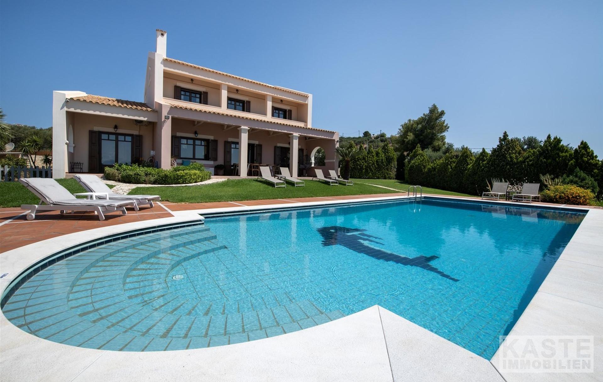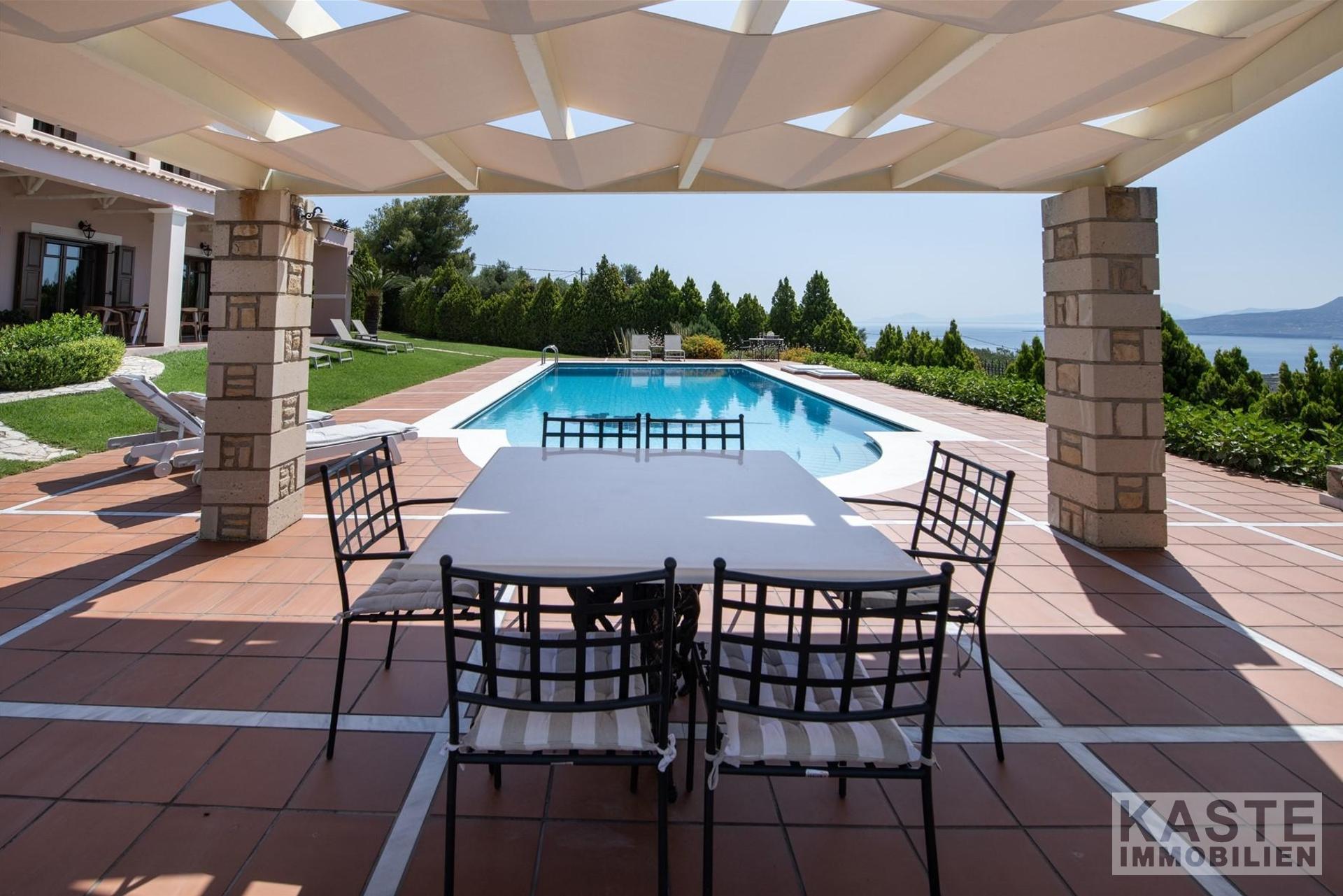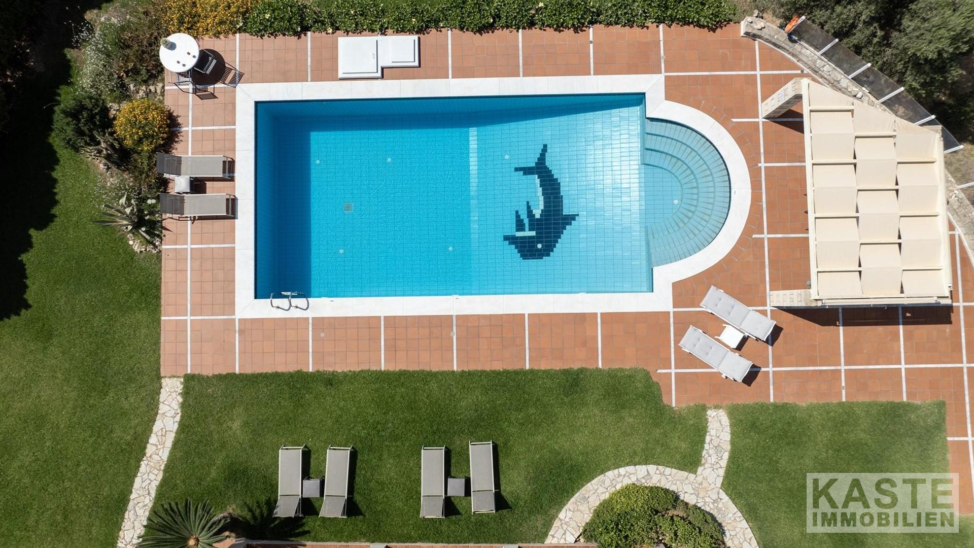 Außenbereich & Grundstück - 70 m² gefliester Swimmingpool - Großzügige Liegewiese - Außendusche - Mediterrane Gartenanlagen mit Bewässerungssystem - Olivenhain mit 50 Olivenbäumen - Pergola-überdachter Essbereich im Freien - Barbecue / Grillplatz - Sonnenterrasse mit Sonnenliegen und Sonnenschirmen - Steinmauern um das Anwesen - Balkon mit herrlichem Meerblick - Gartentisch und -stühle - Rasenflächen - Überdachter Privatparkplatz - Garage für Fahrzeuge