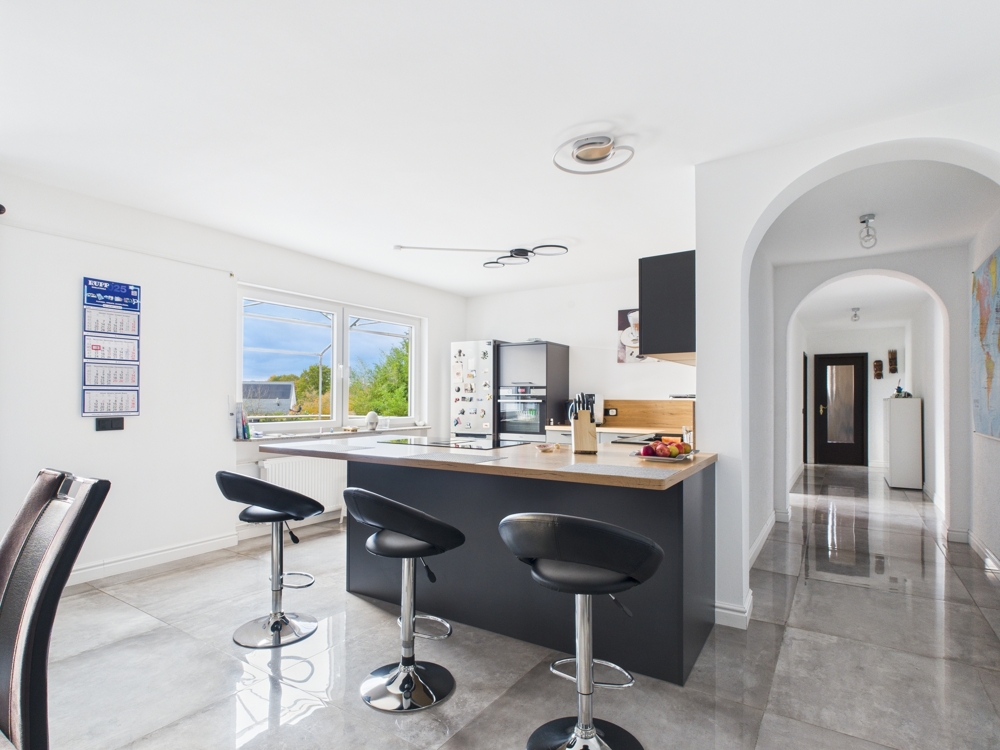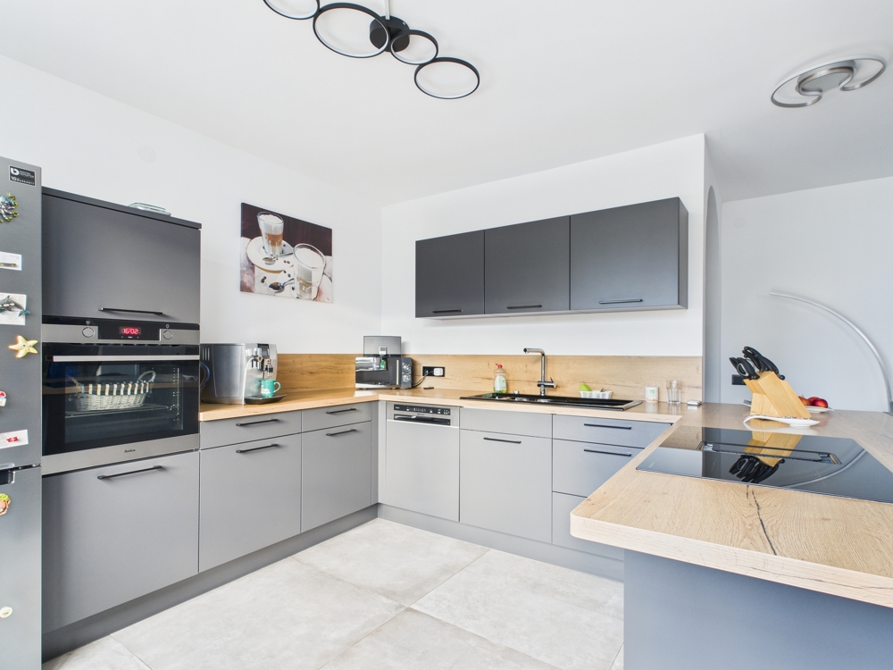 Im ersten Obergeschoss befindet sich der lichtdurchflutete Wohn- und Essbereich mit offener Küche, ausgestattet mit einer hochwertigen Einbauküche und moderner Kochinsel. Vom Wohnbereich aus gelangt man auf die großzügige Terrasse, deren Geländer mit einer Solaranlage bestückt ist.