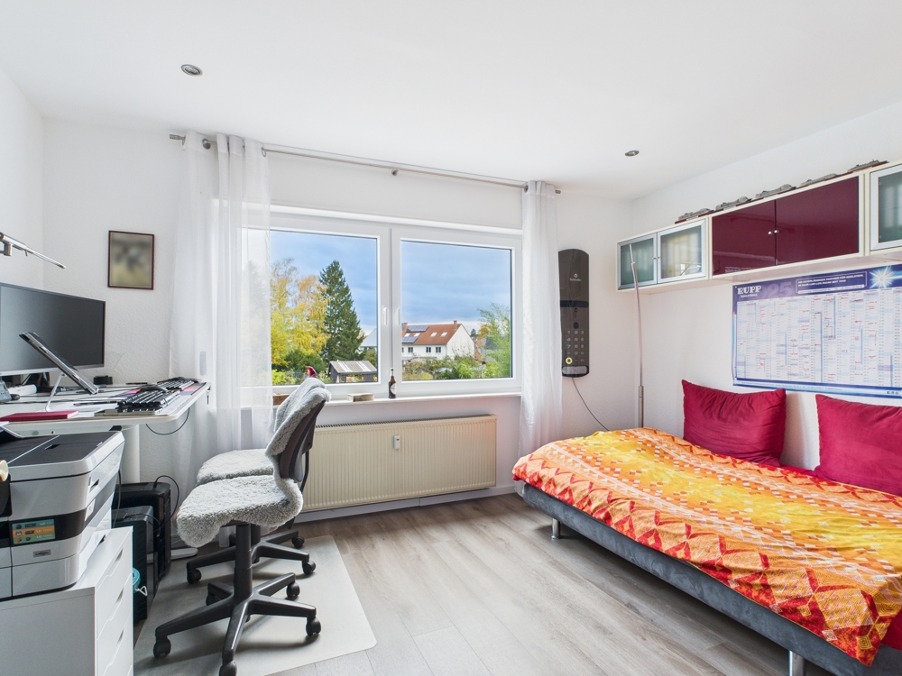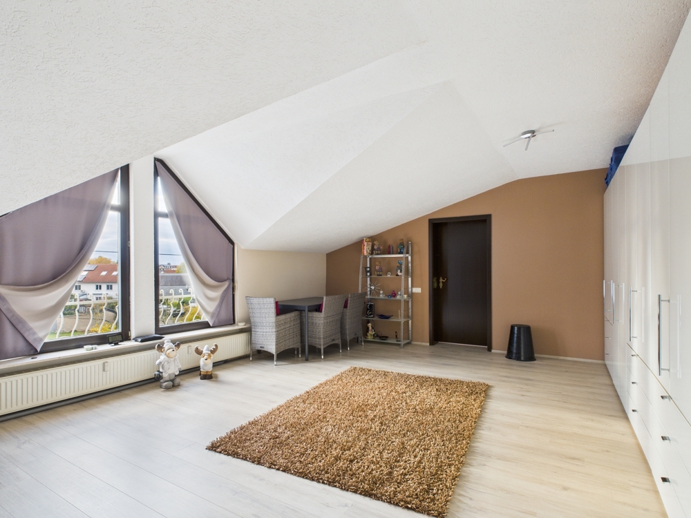 Das luxuriöse Hauptbadezimmer auf dieser Etage überzeugt u. a. mit einer Badewanne und einer bodengleichen Dusche. Zusätzlich steht Ihnen ein Arbeitszimmer zur Verfügung, das sich auch hervorragend als Kinderzimmer nutzen lässt. Ein praktischer Abstellraum mit Waschmaschinenanschluss bietet ausreichend Platz für Vorräte.
