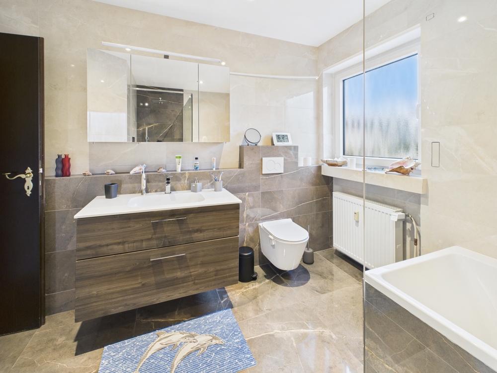 Das luxuriöse Hauptbadezimmer auf dieser Etage überzeugt u. a. mit einer Badewanne und einer bodengleichen Dusche. Zusätzlich steht Ihnen ein Arbeitszimmer zur Verfügung, das sich auch hervorragend als Kinderzimmer nutzen lässt. Ein praktischer Abstellraum mit Waschmaschinenanschluss bietet ausreichend Platz für Vorräte.