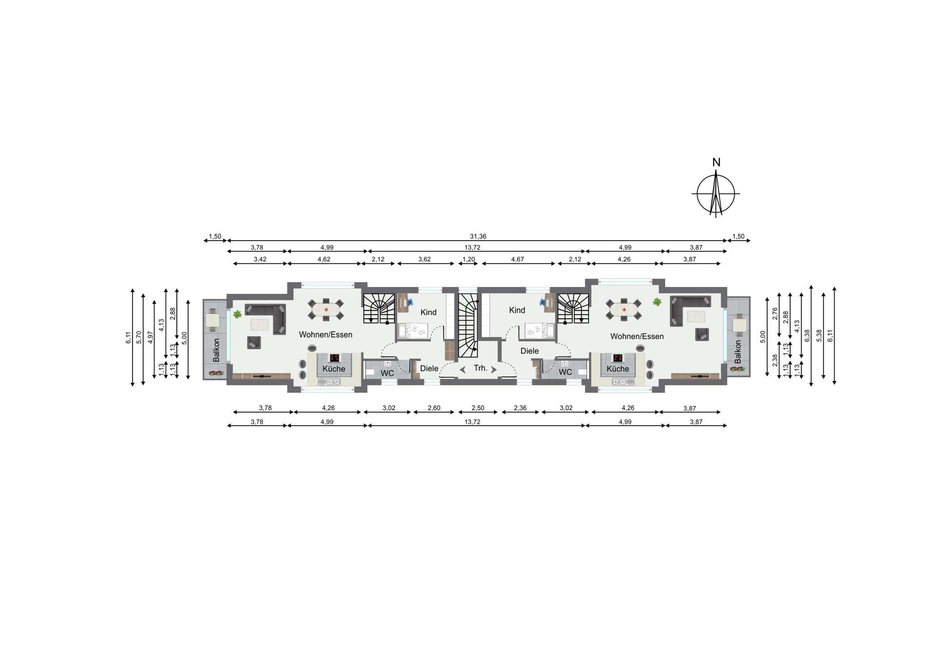Wenn Sie diese herrliche Maisonettewohnung betreten, gelangen Sie zuerst in die helle Diele, in welcher Sie Ihre Garderobe realisieren können. Von hier aus kommen Sie in das 1. Kinderzimmer sowie in das separate WC. Geradeaus wartet auf Sie der großzügige, offene Wohn- und Essbereich, mit angrenzender Küche. Bei der Küche handelt es sich um eine moderne offene Küche, mit viel Platz.
