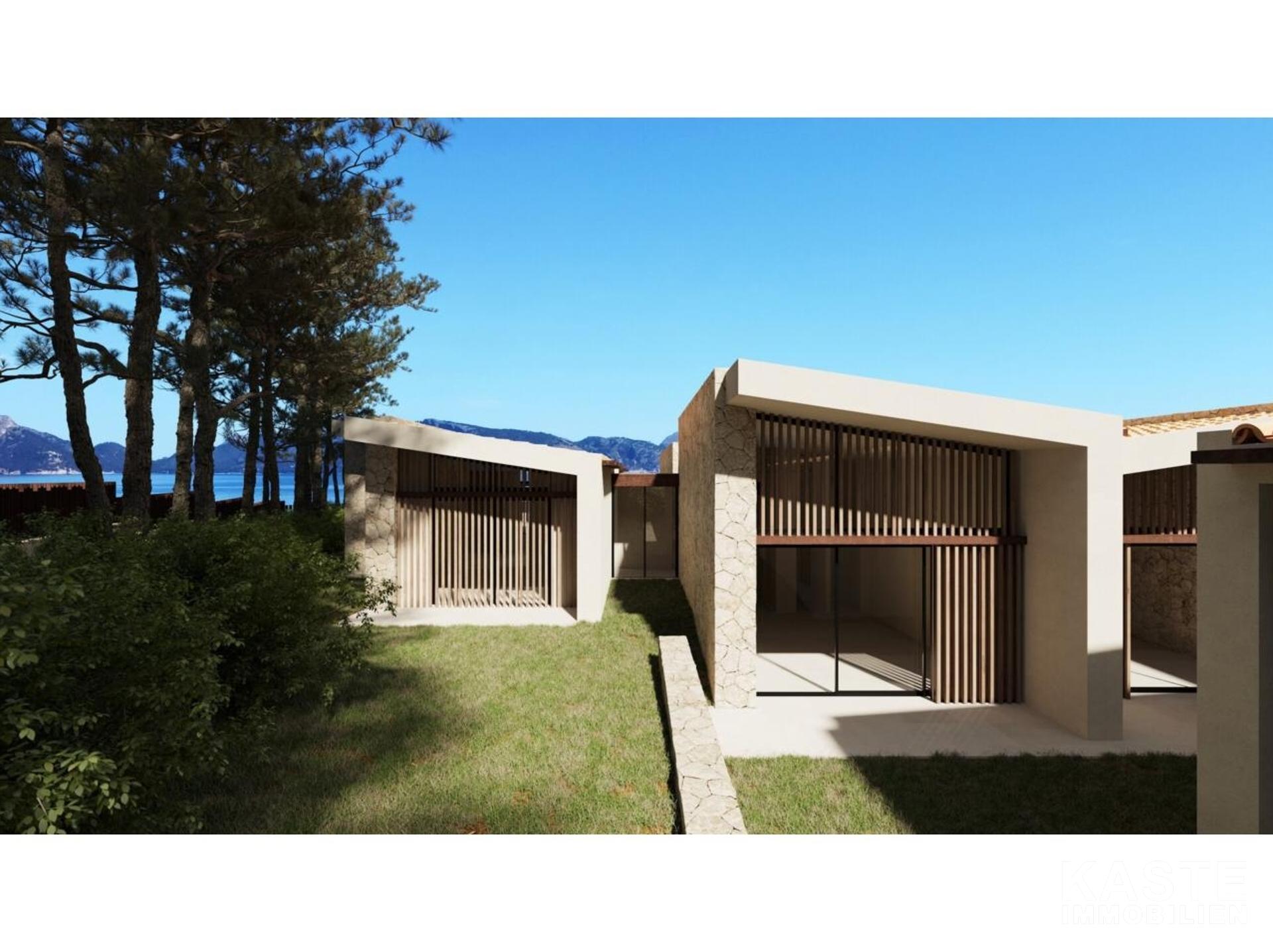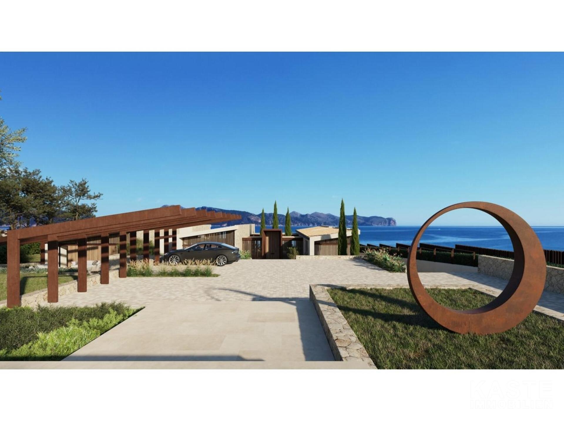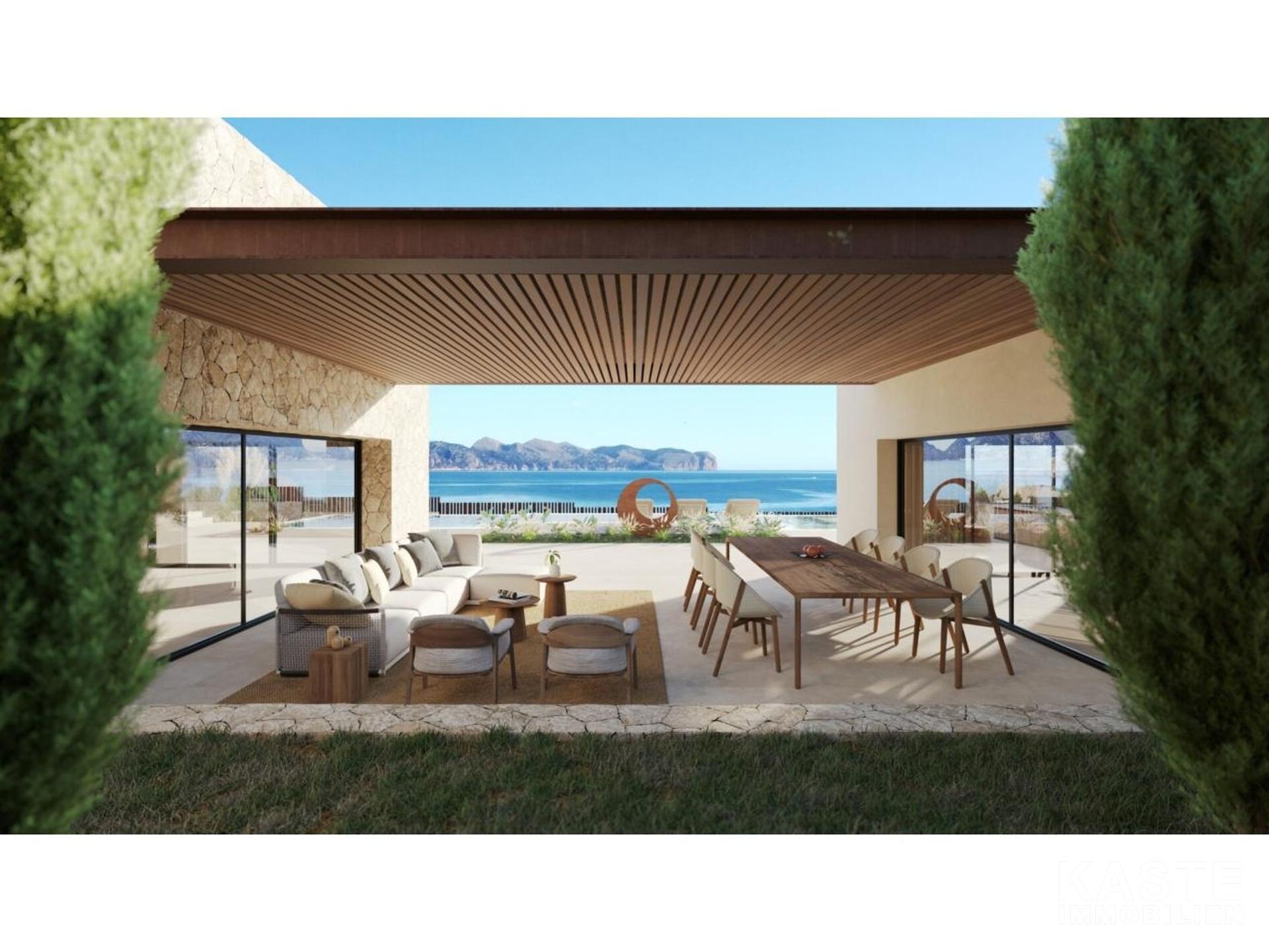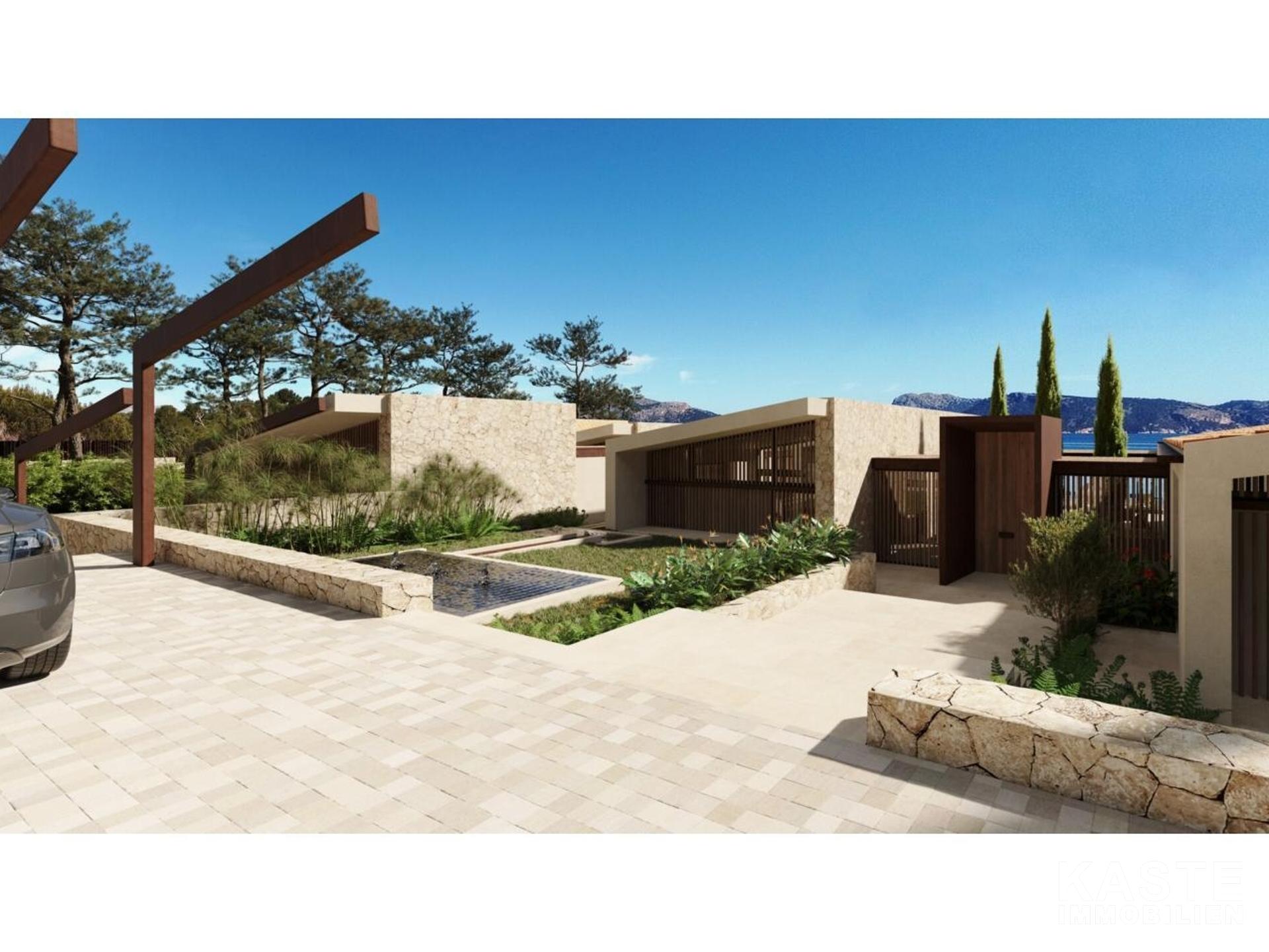 Diese exklusive Neubau-Villa in der begehrten Wohngegend Mal Pas bei Alcúdia auf Mallorca bietet luxuriösen Wohnkomfort auf etwa 650 m² Wohnfläche und erstklassige Ausstattung auf einem großzügigen 2.590 m² Grundstück mit direktem Strandzugang. Die eindrucksvolle, im modernen avantgardistischen Stil konzipierte, einstöckige Villa überzeugt durch ein durchdachtes Raumkonzept mit fünf großzügigen Schlafzimmern, fünf Badezimmern en-suite sowie einer zusätzlichen Gästetoilette. Offene Wohnbereiche, ein elegantes Esszimmer und eine exquisite, voll ausgestattete Küche schaffen ein offenes und kommunikatives Ambiente, das durch den direkten Zugang zu den sonnigen sowie überdachten Terrassen nahtlos mit dem idyllischen Außenbereich verschmilzt.