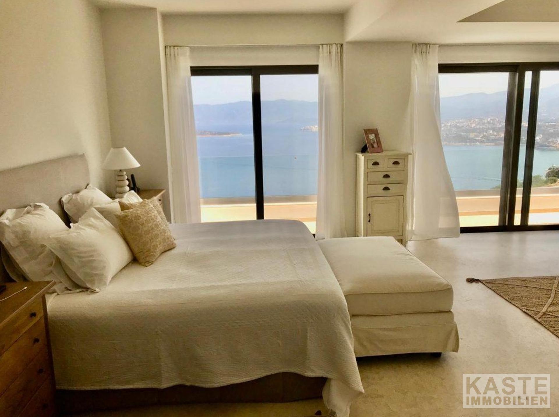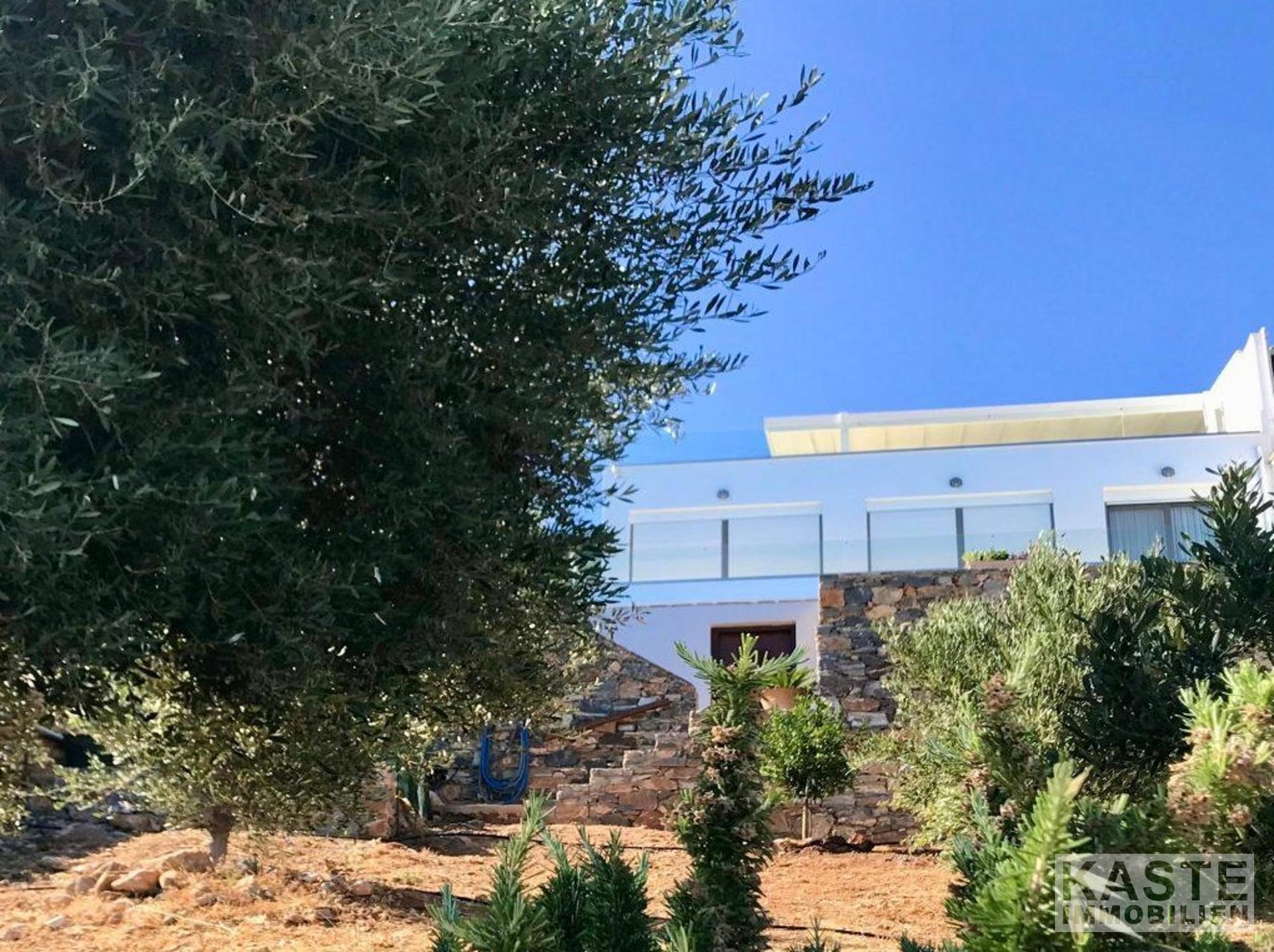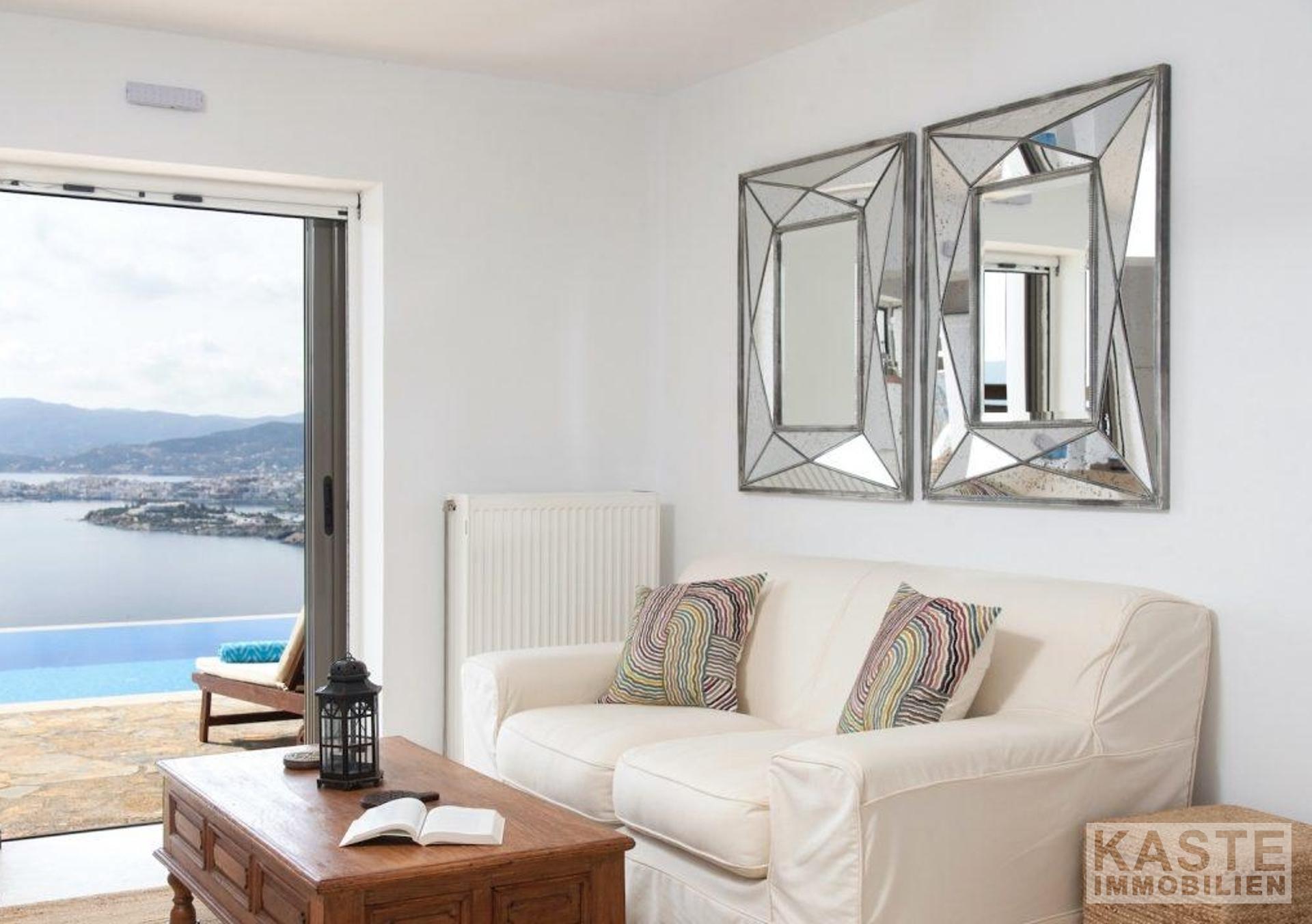 Die Hauptresidenz erstreckt sich über zwei Ebenen, die mit viel Liebe zum Detail gestaltet wurden, um ein helles, offenes und komfortables Wohnerlebnis mit spektakulärer Sicht auf die Mirabello-Bucht zu schaffen. Das obere Geschoss empfängt Sie mit einem offenen Grundriss, der Küche, Ess- und Wohnbereich fließend miteinander verbindet und direkt auf eine großzügige Terrasse hinausführt. Hier genießen Sie den magischen Blick auf das tiefblaue Meer und die malerischen Berge Kretas.
