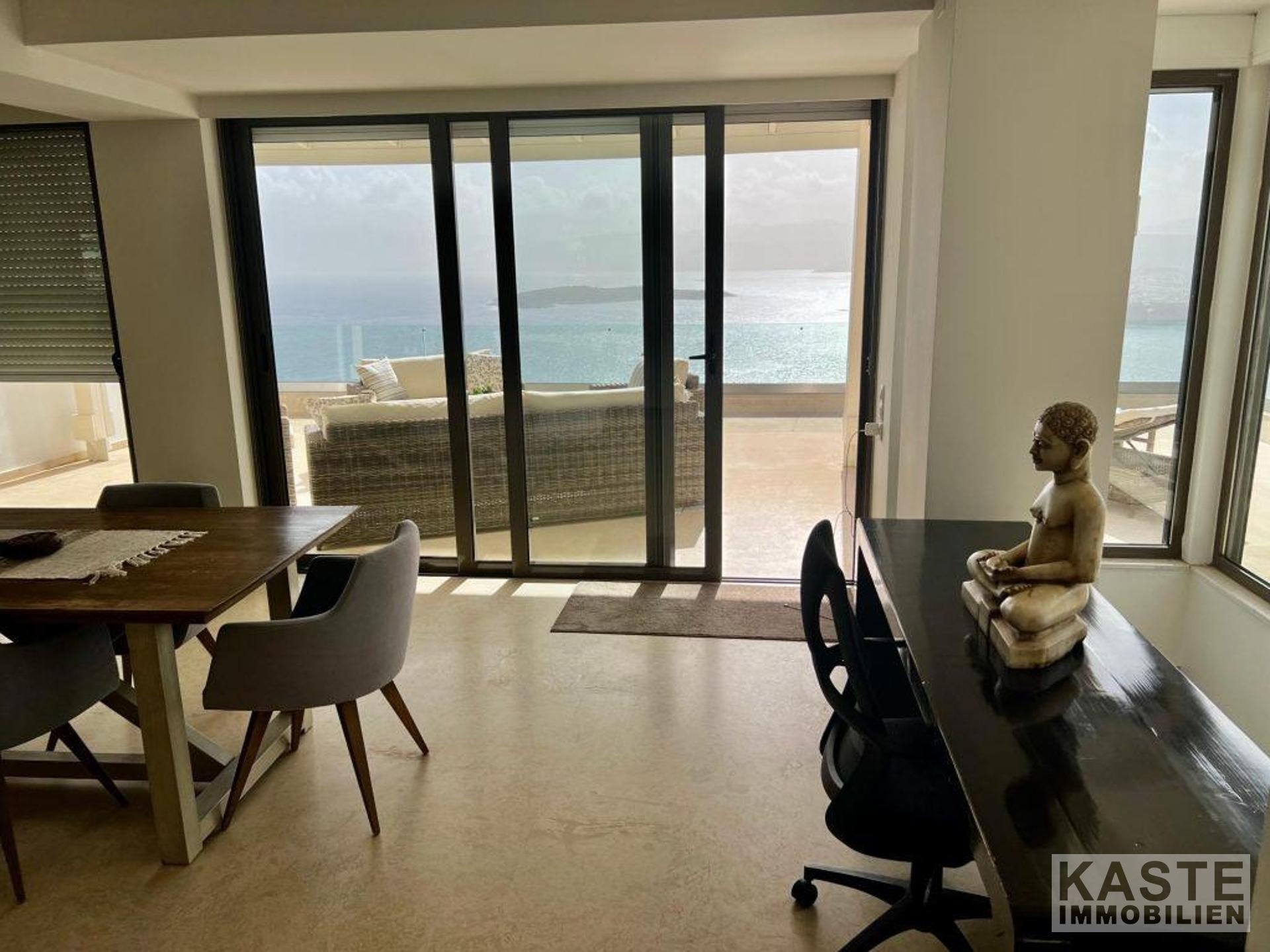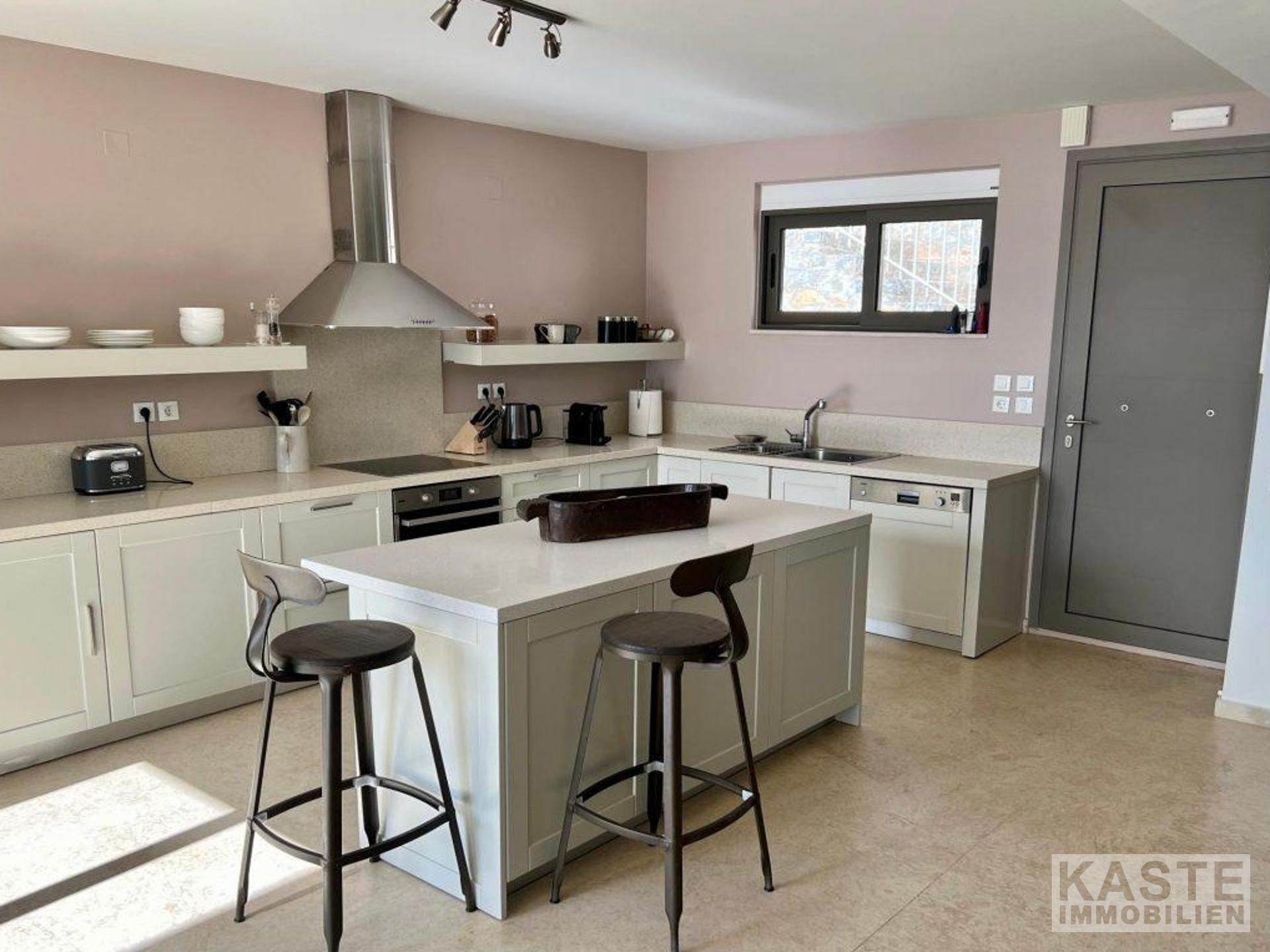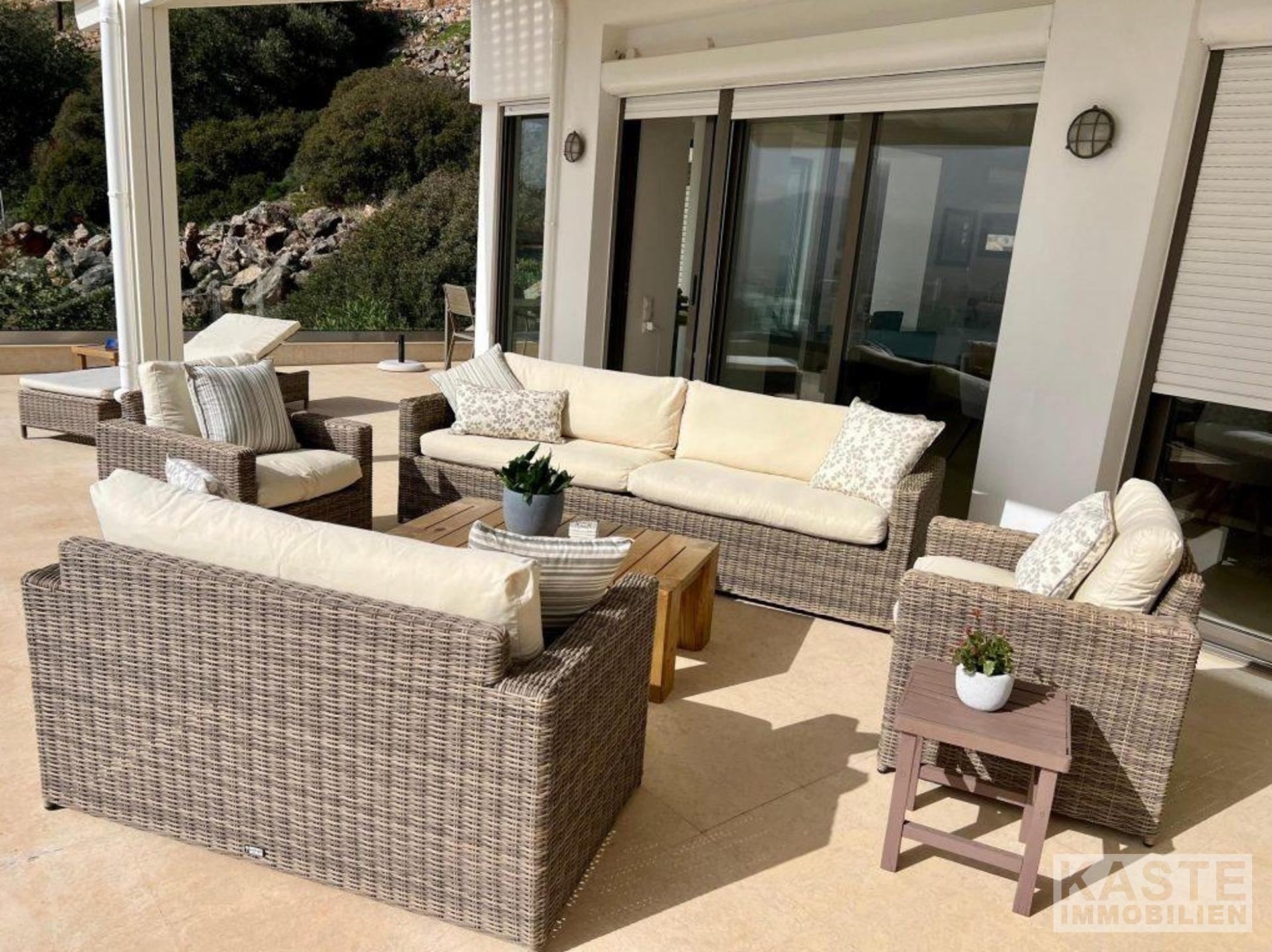 Die Hauptresidenz erstreckt sich über zwei Ebenen, die mit viel Liebe zum Detail gestaltet wurden, um ein helles, offenes und komfortables Wohnerlebnis mit spektakulärer Sicht auf die Mirabello-Bucht zu schaffen. Das obere Geschoss empfängt Sie mit einem offenen Grundriss, der Küche, Ess- und Wohnbereich fließend miteinander verbindet und direkt auf eine großzügige Terrasse hinausführt. Hier genießen Sie den magischen Blick auf das tiefblaue Meer und die malerischen Berge Kretas.