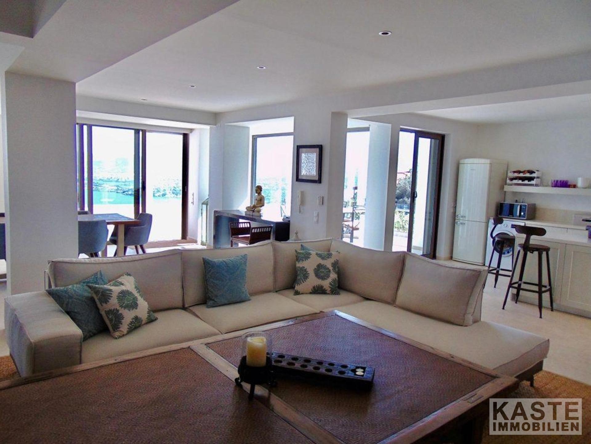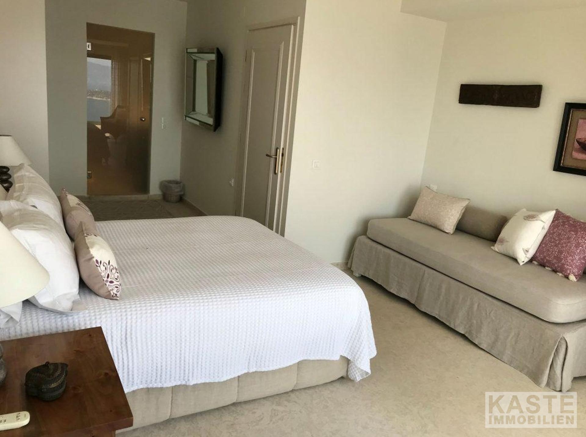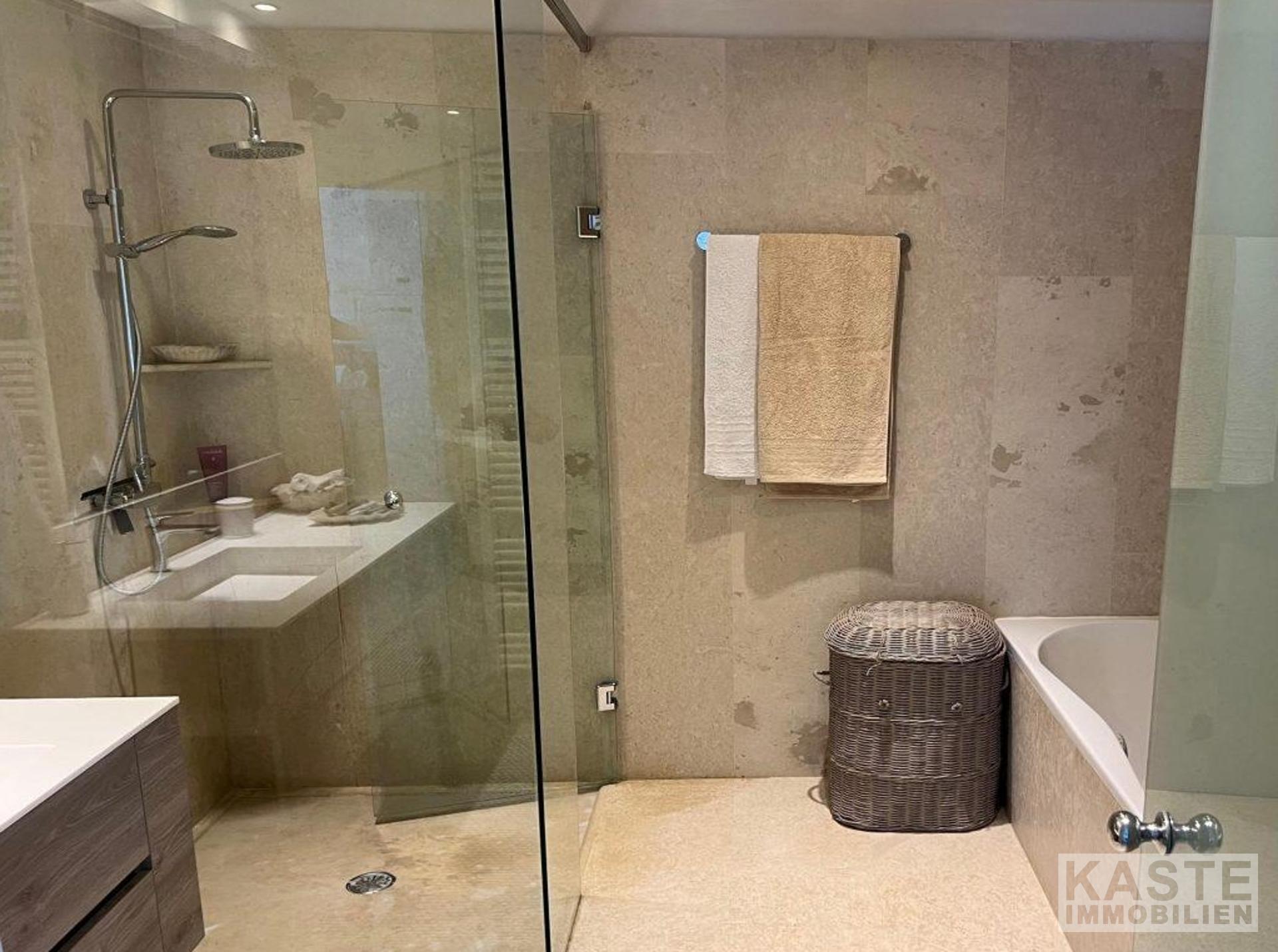 Ein besonderes Highlight stellt das vollständig eigenständige Studio-Gästeapartment auf der Poolebene dar. Mit separatem Eingang bietet es Schlaf-, Wohn- und Küchenbereich sowie ein eigenes Bad. Direkt angrenzend liegt die Sonnenterrasse mit exklusivem Zugang zum Infinity-Salzwasser-Pool. Die hochwertige Ausstattung, darunter Klimaanlage, Zentralheizung und elektrische Rollläden, sorgt für Komfort und Sicherheit. Das Studio ist komplett möbliert und wird derzeit erfolgreich vermietet, was für rentable Ferienvermietungs-Potenziale spricht.